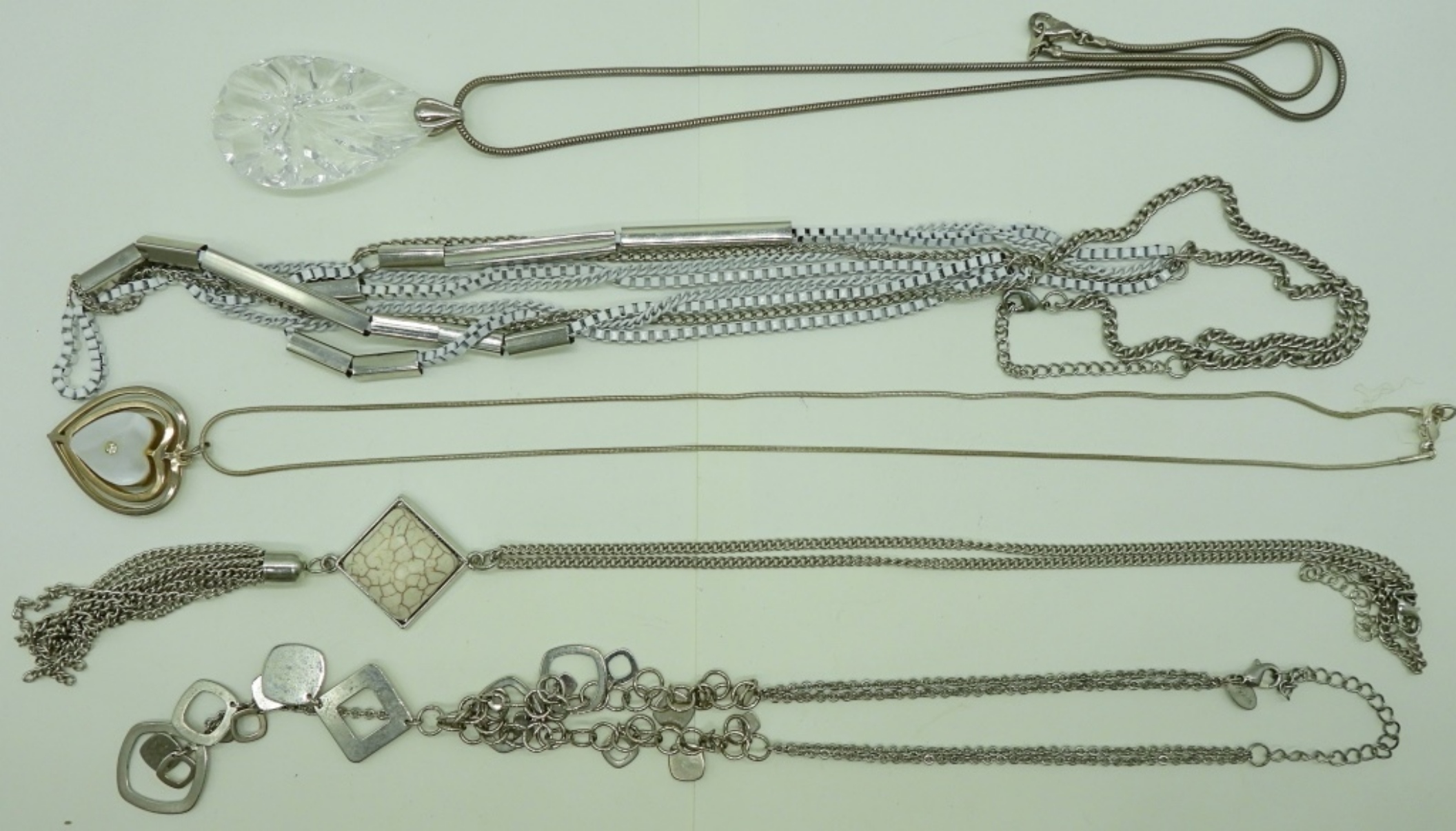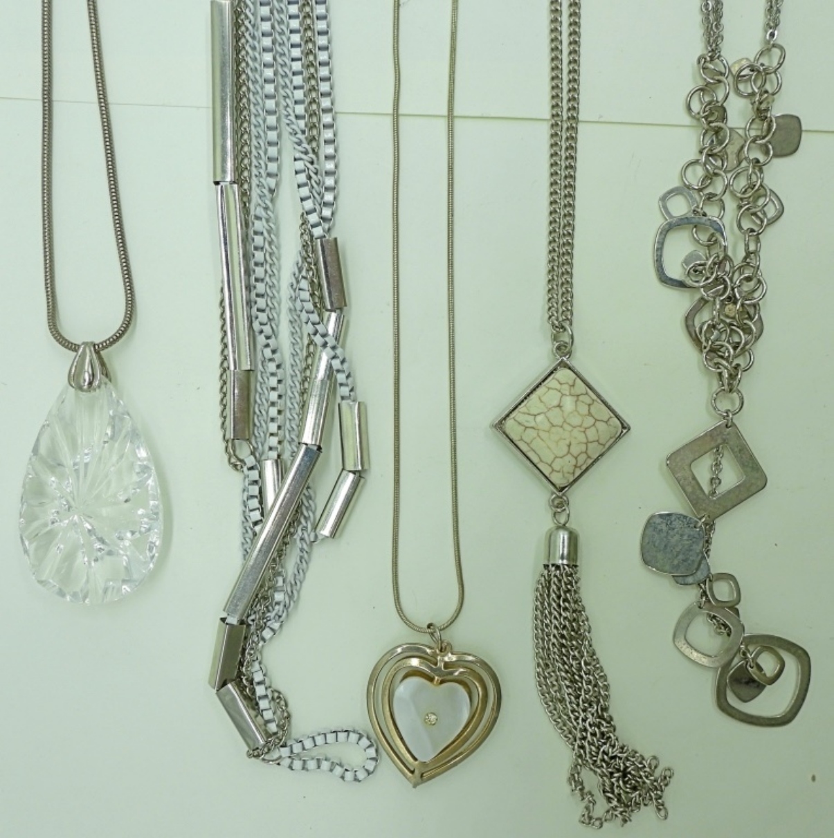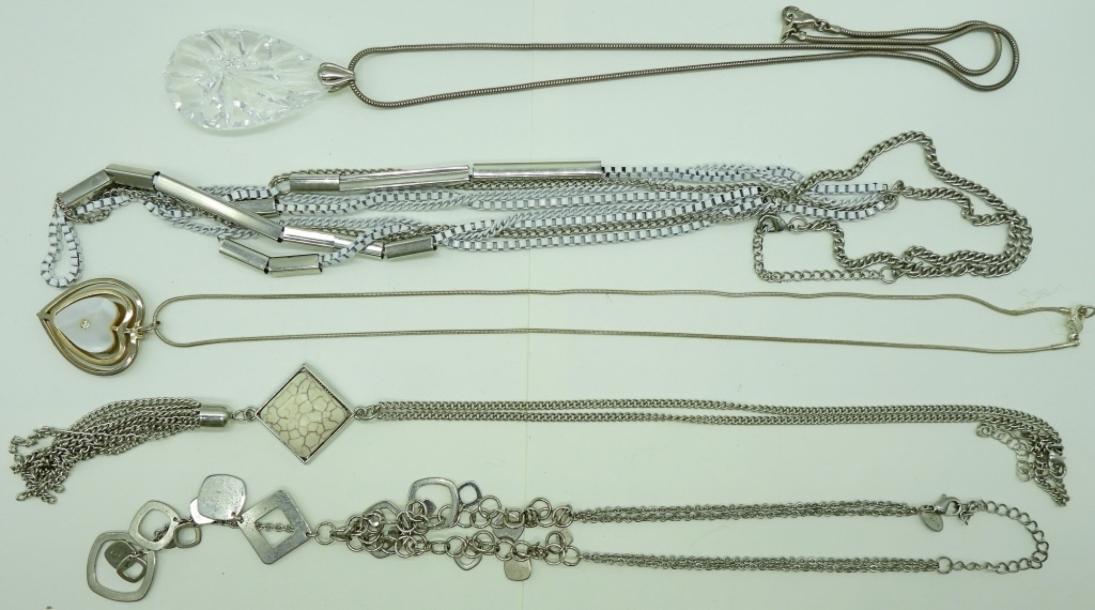 FIVE FASHION NECKLACES, 18″-32″.