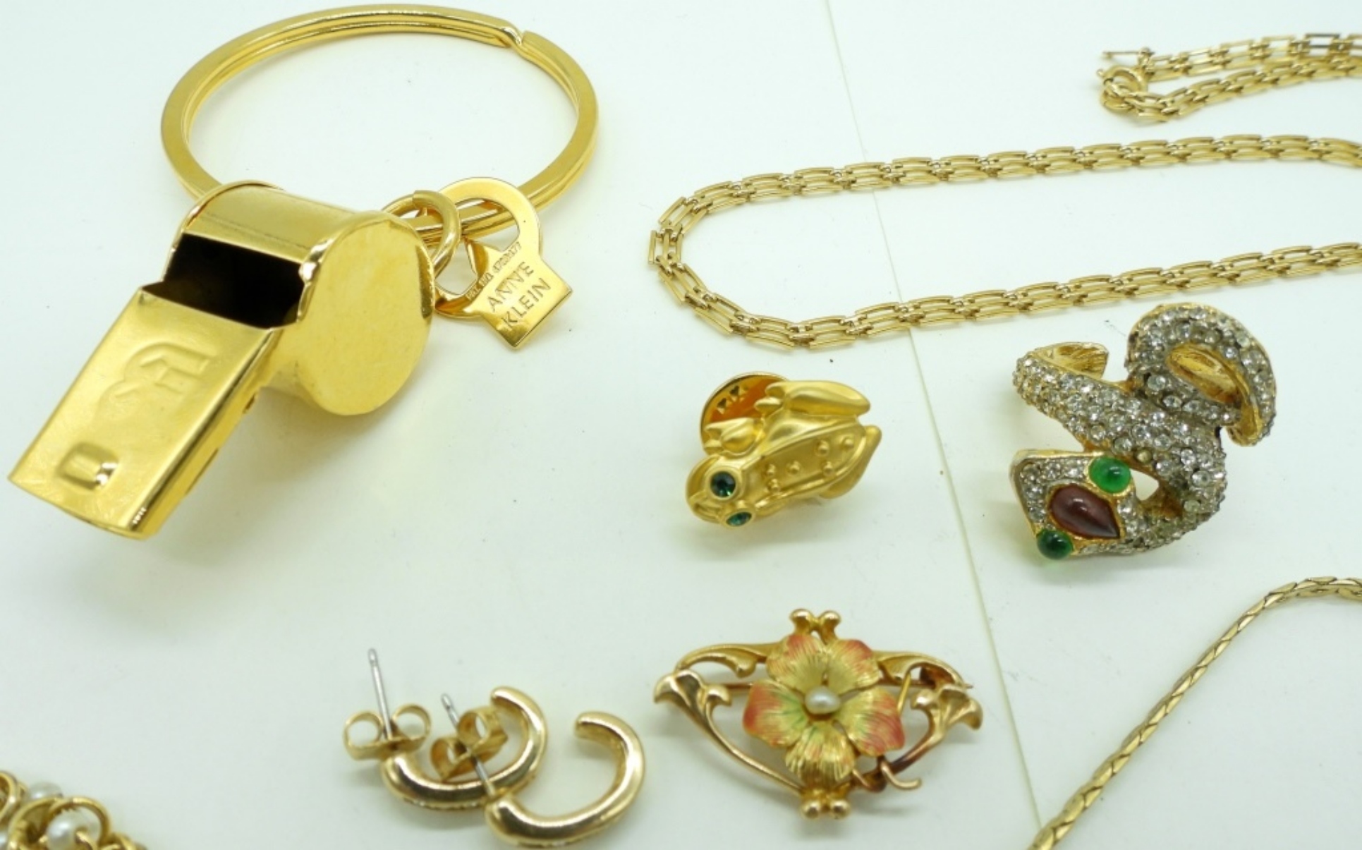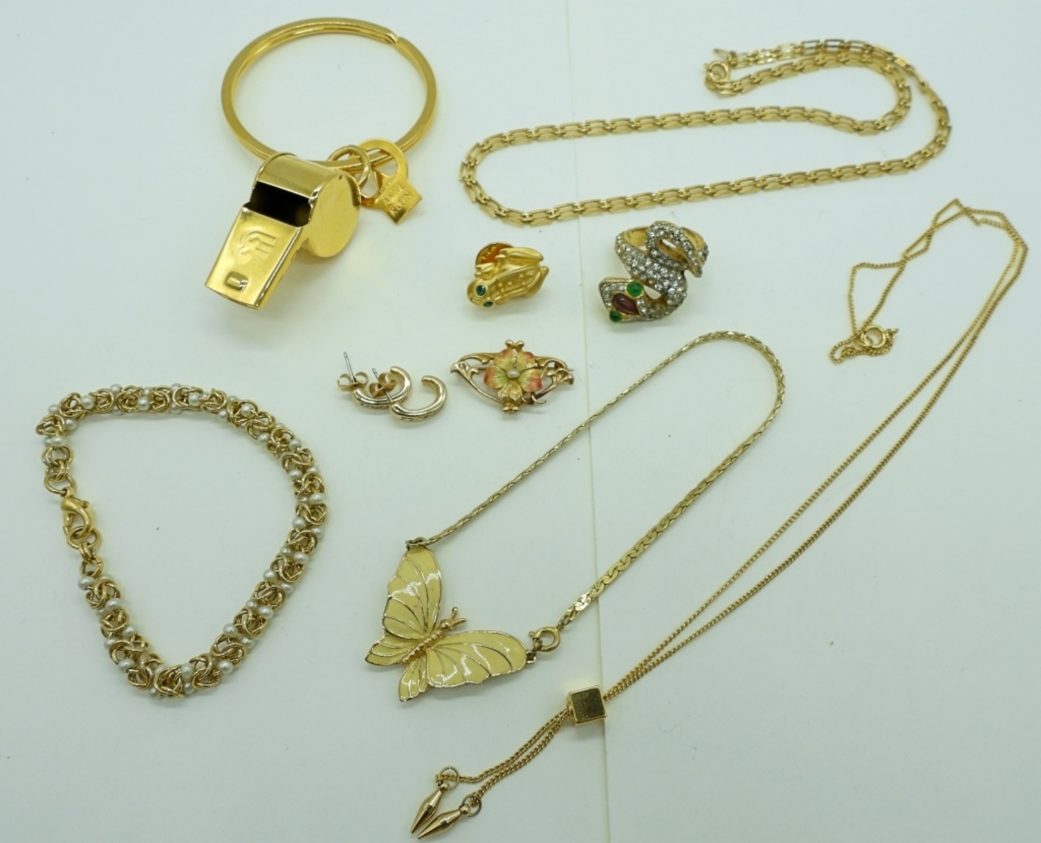 TRIFARI GOLD TONE NECKLACE, 18″. OTHER NECKLACE, 24″. TWO BRACELETS, 8″. ANNE KLEIN WHISTLE KEYCHAIN. SNAKE RING SIZE 5. TWO PINS, ONE PAIR PIERCED EARRINGS.