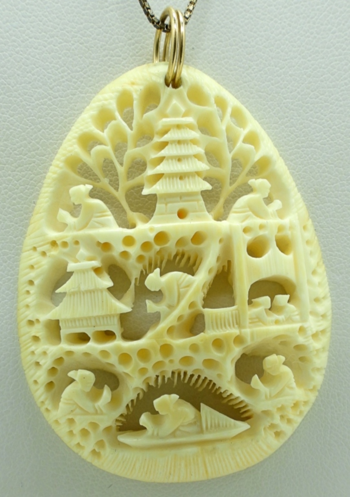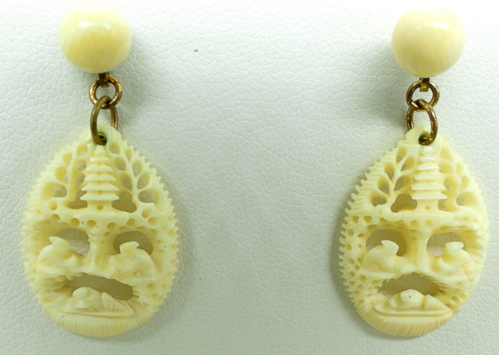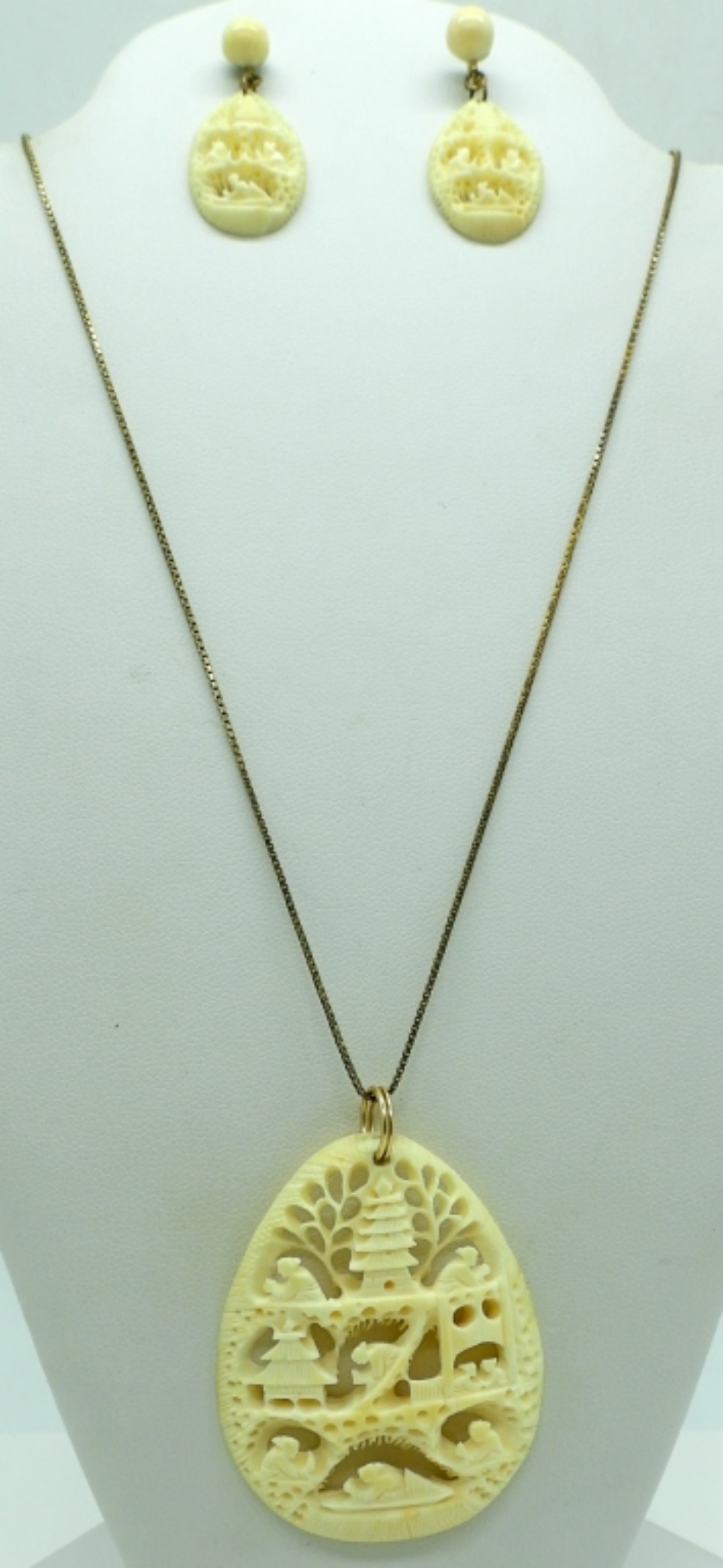 VINTAGE CARVED BONE PENDANT (2″) ON A 20″ CHAIN. MATCHING PIERCED EARRINGS