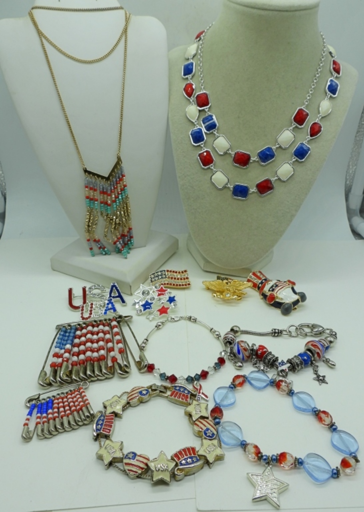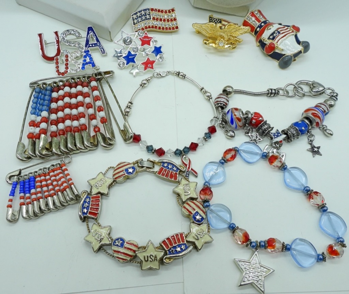 2 NECKLACES, 20″ & 34″. 3 BRACELETS, 7″ & 8″. 8 PINS