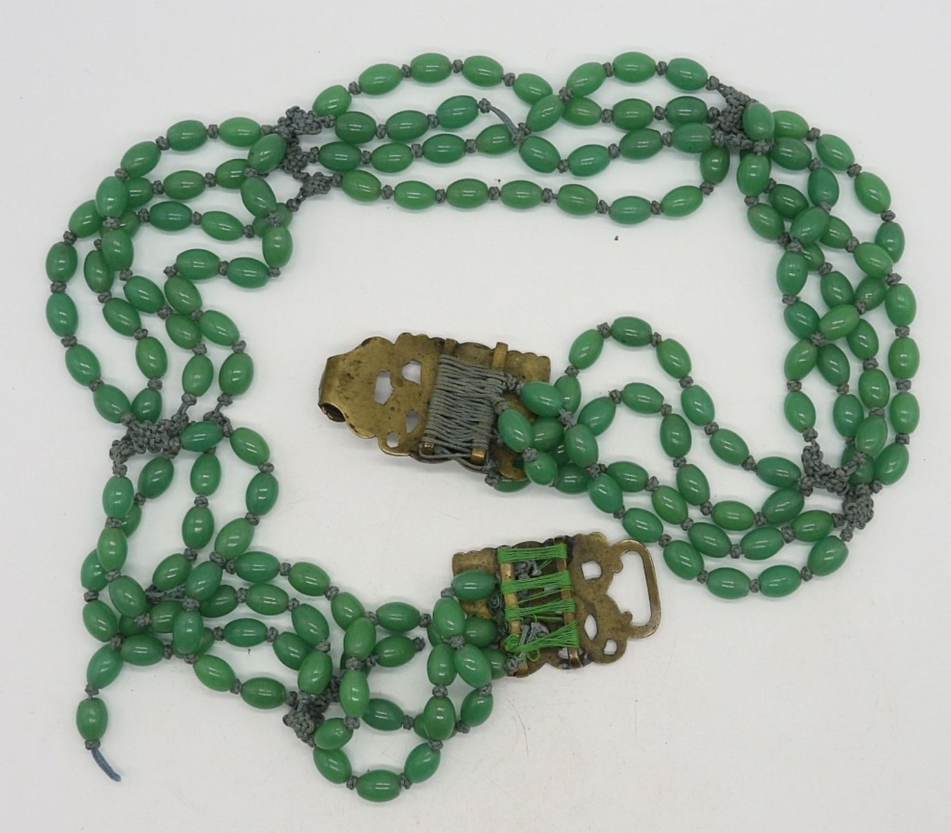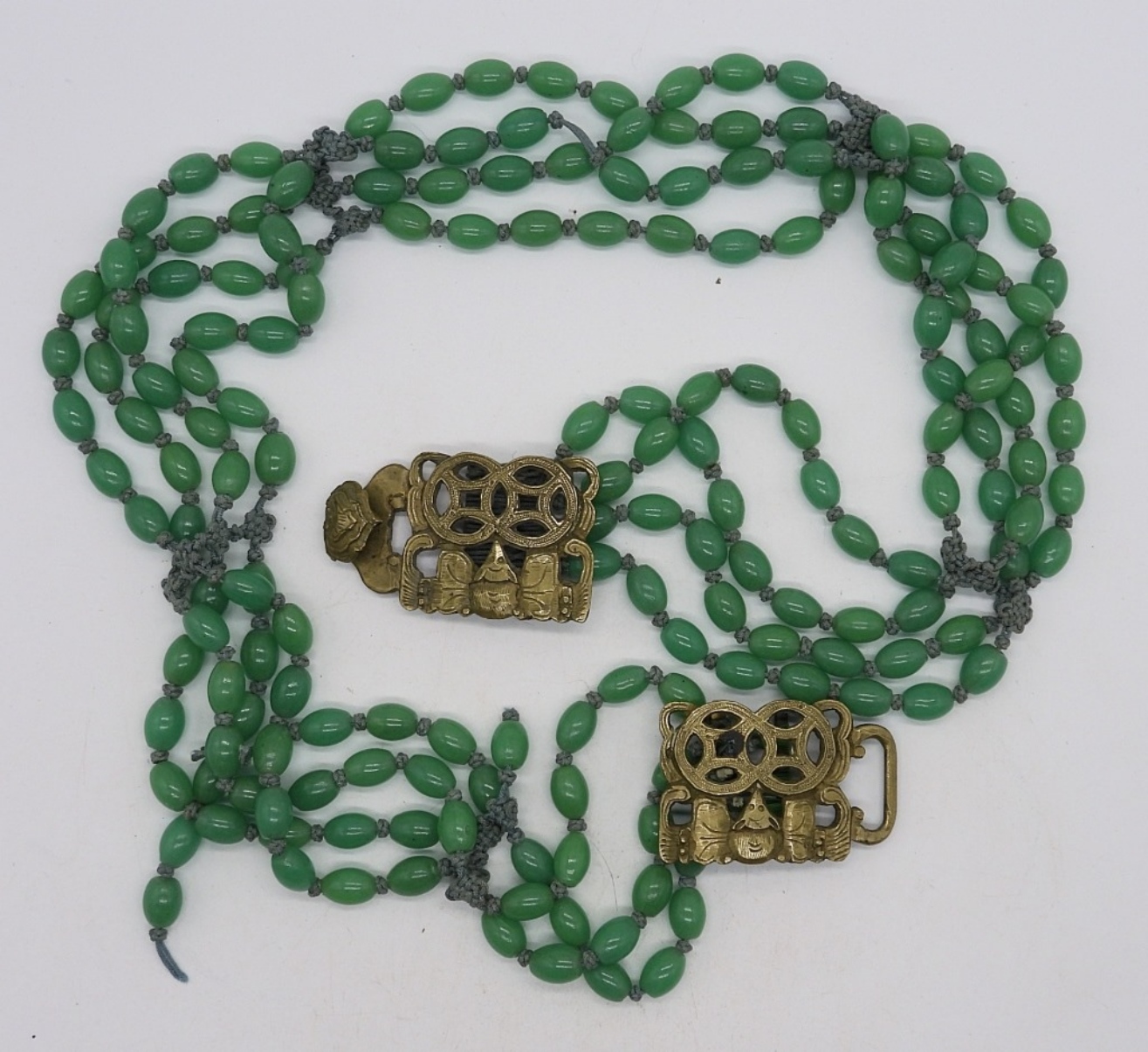 VINTAGE GREEN BEADED (POSSIBLY JADE) WITH ASIAN STYLE CLASPS. NECKLACE HAS TWO BREAKS.
