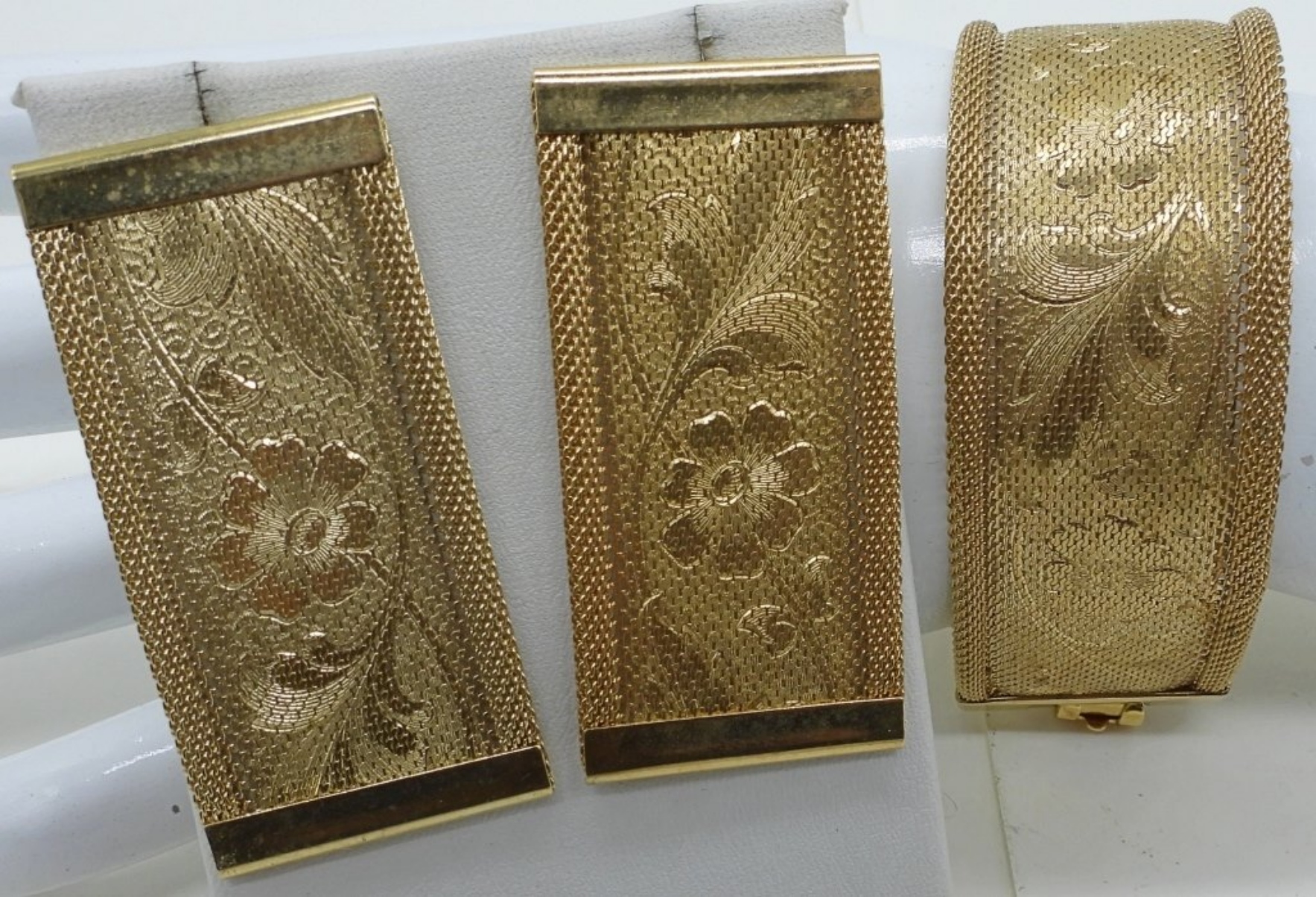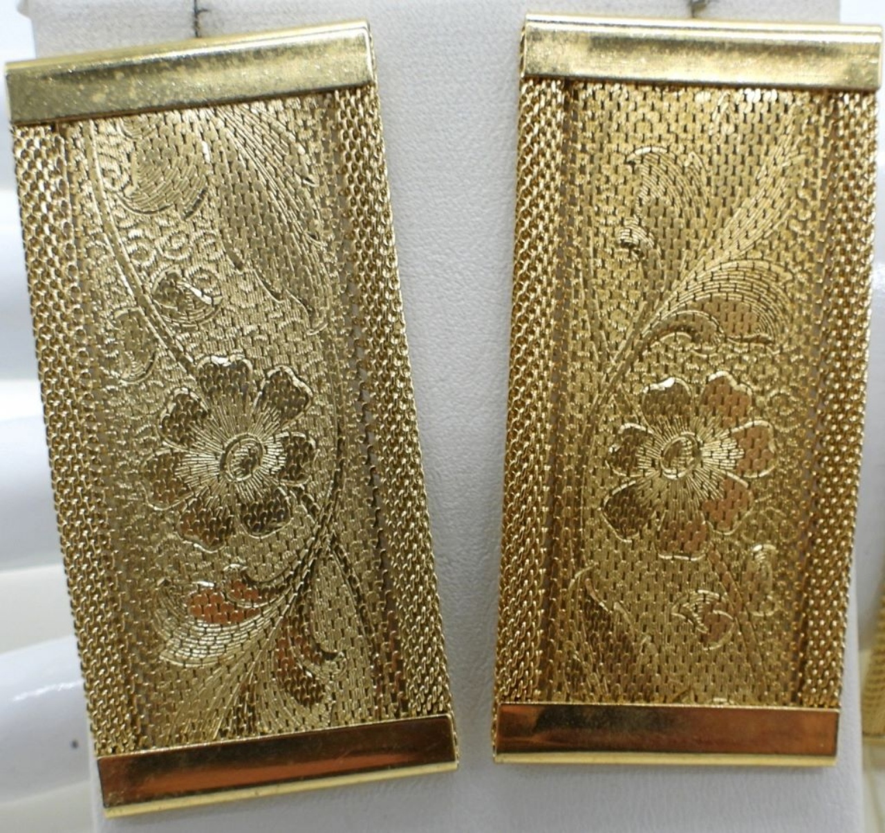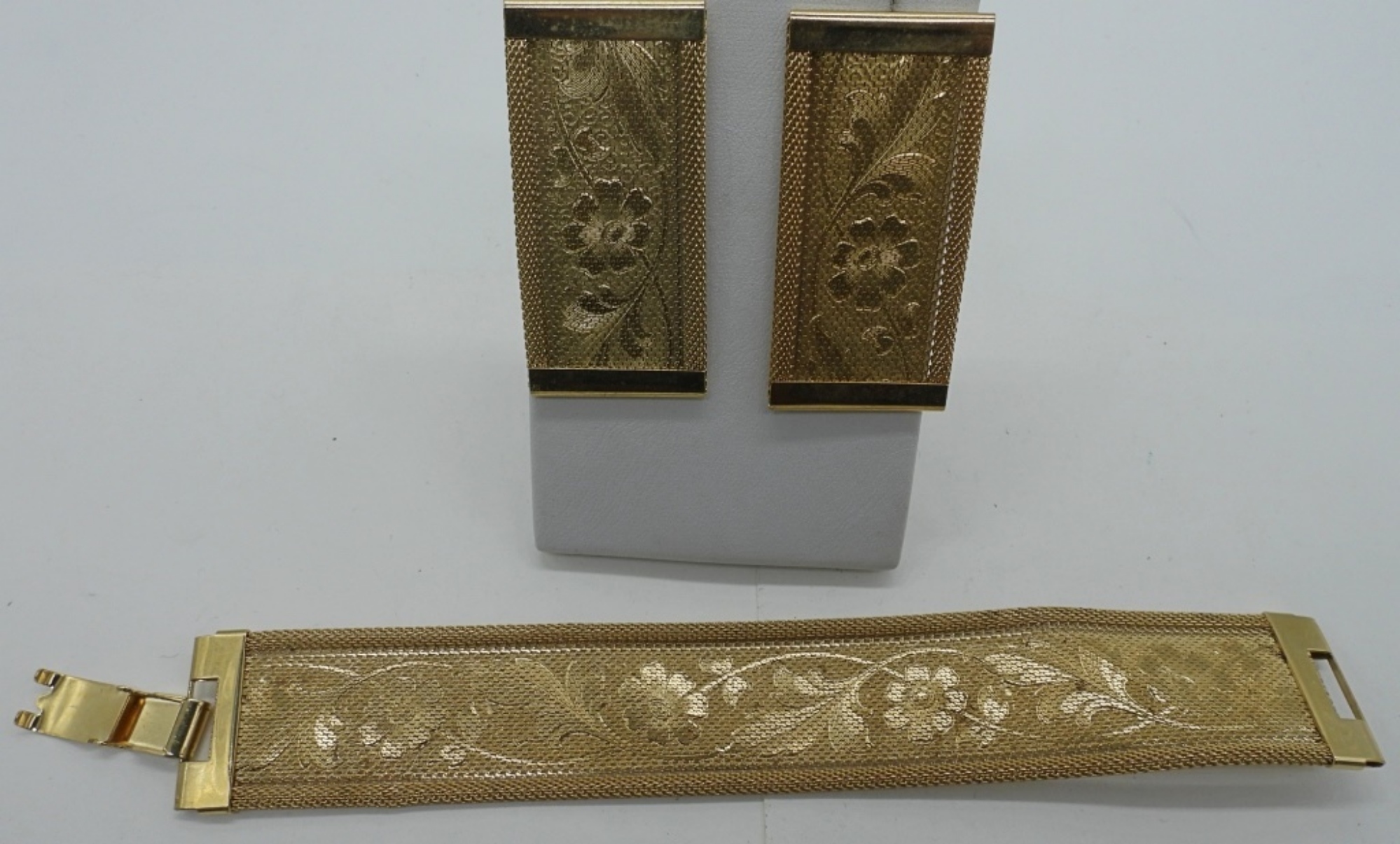GOLD TONE, FLAT BRACELET WITH MATCHING PIERCED EARRINGS. 7.5″.