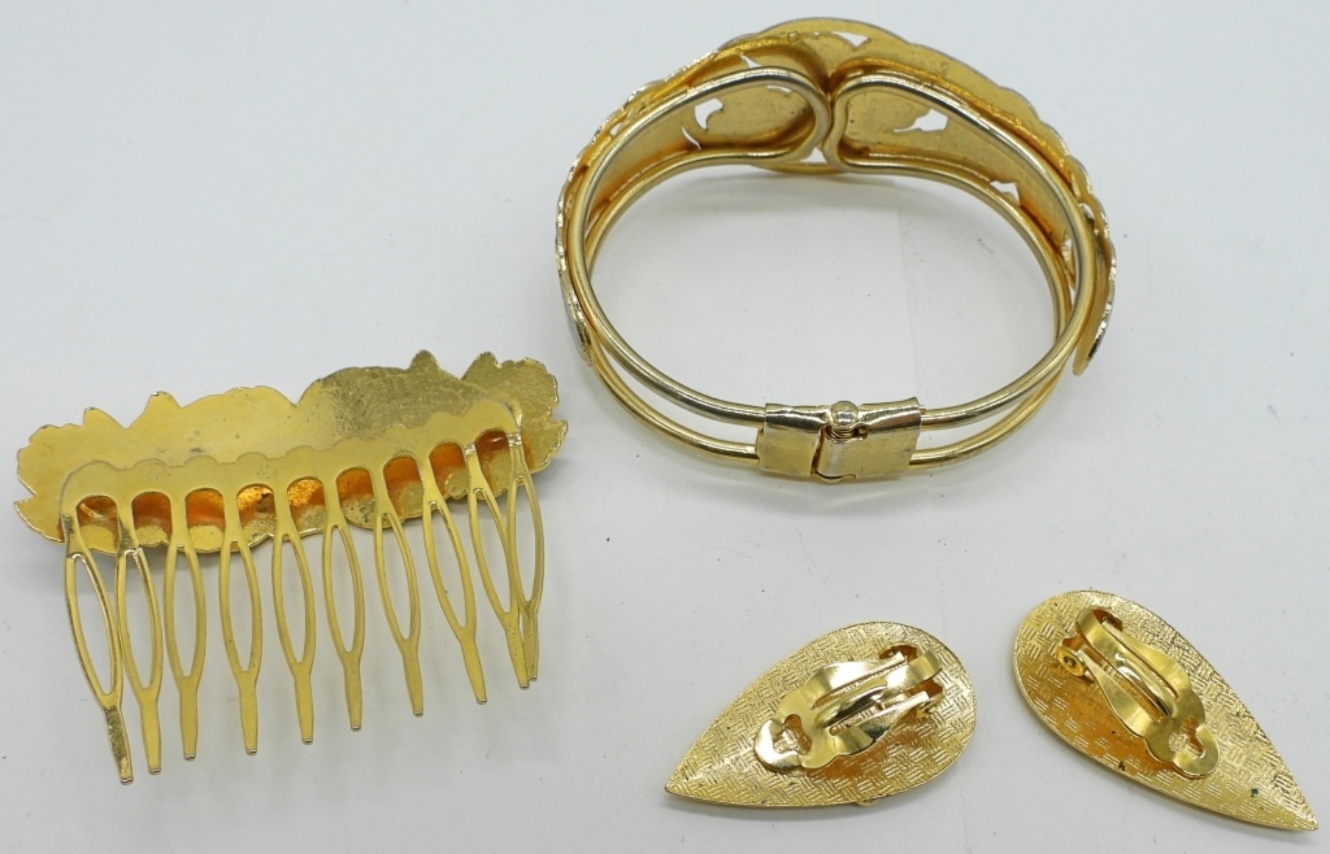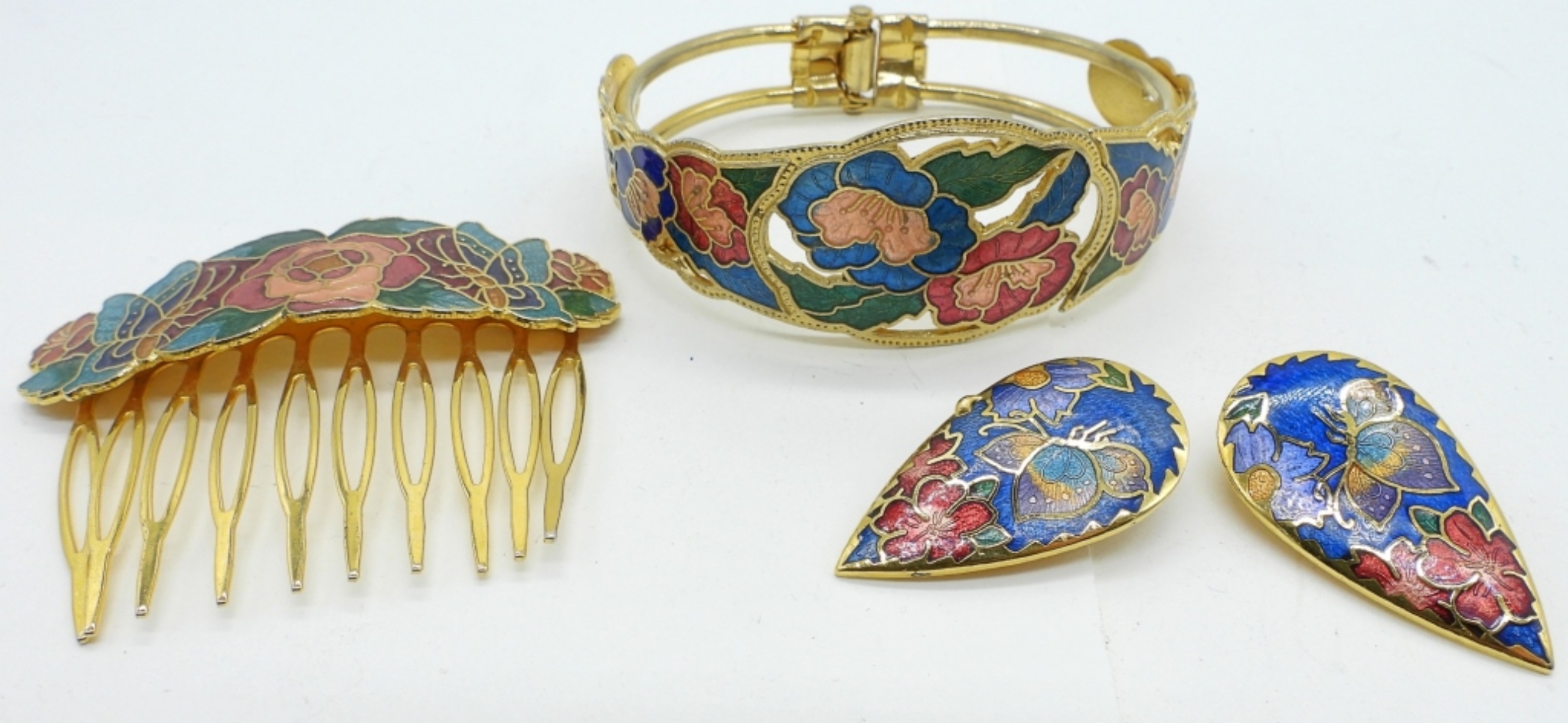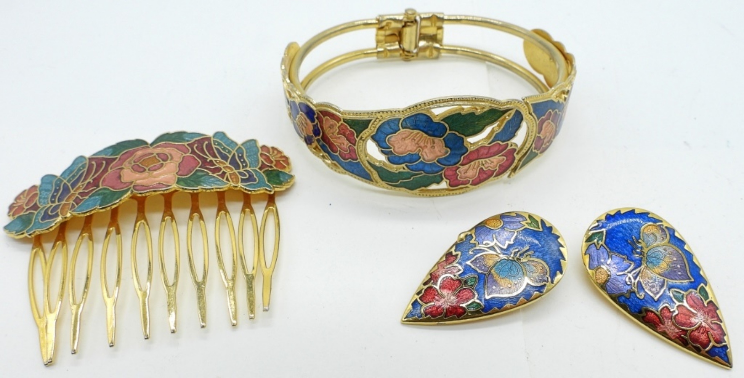 CLOISONNE, GOLD TONE BRACELET, PIERCED EARRINGS AND HAIR COMB.