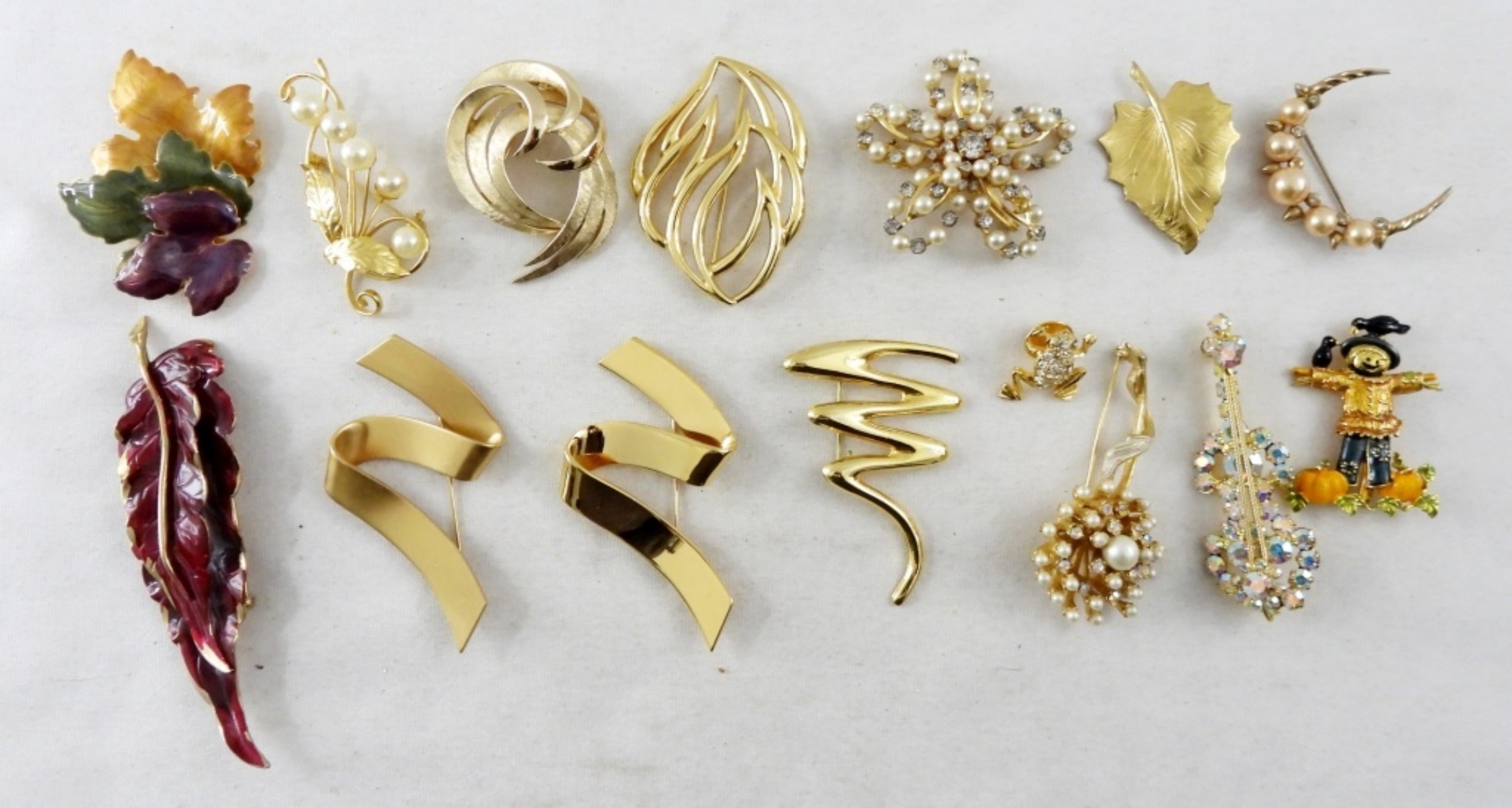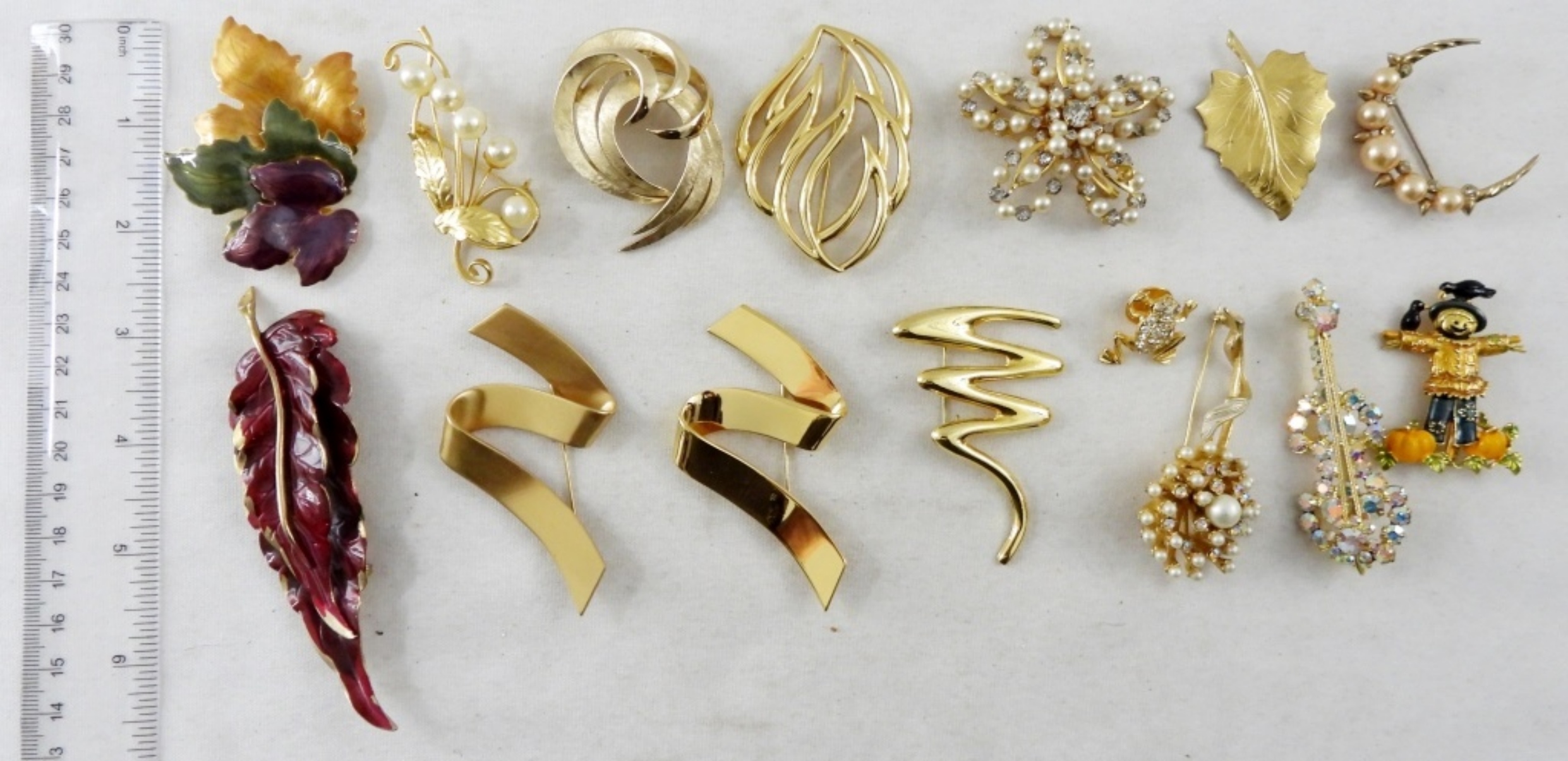 BEAUTIFUL COLLECTION OF BROOCHES IN GOLD TONES. SOME PERFECT FOR DIFFERENT SEASONS, A SCARECROW, 2 SETS OF LEAVES. 15 TOTAL BROOCHES ALL IN GOOD CONDITION.