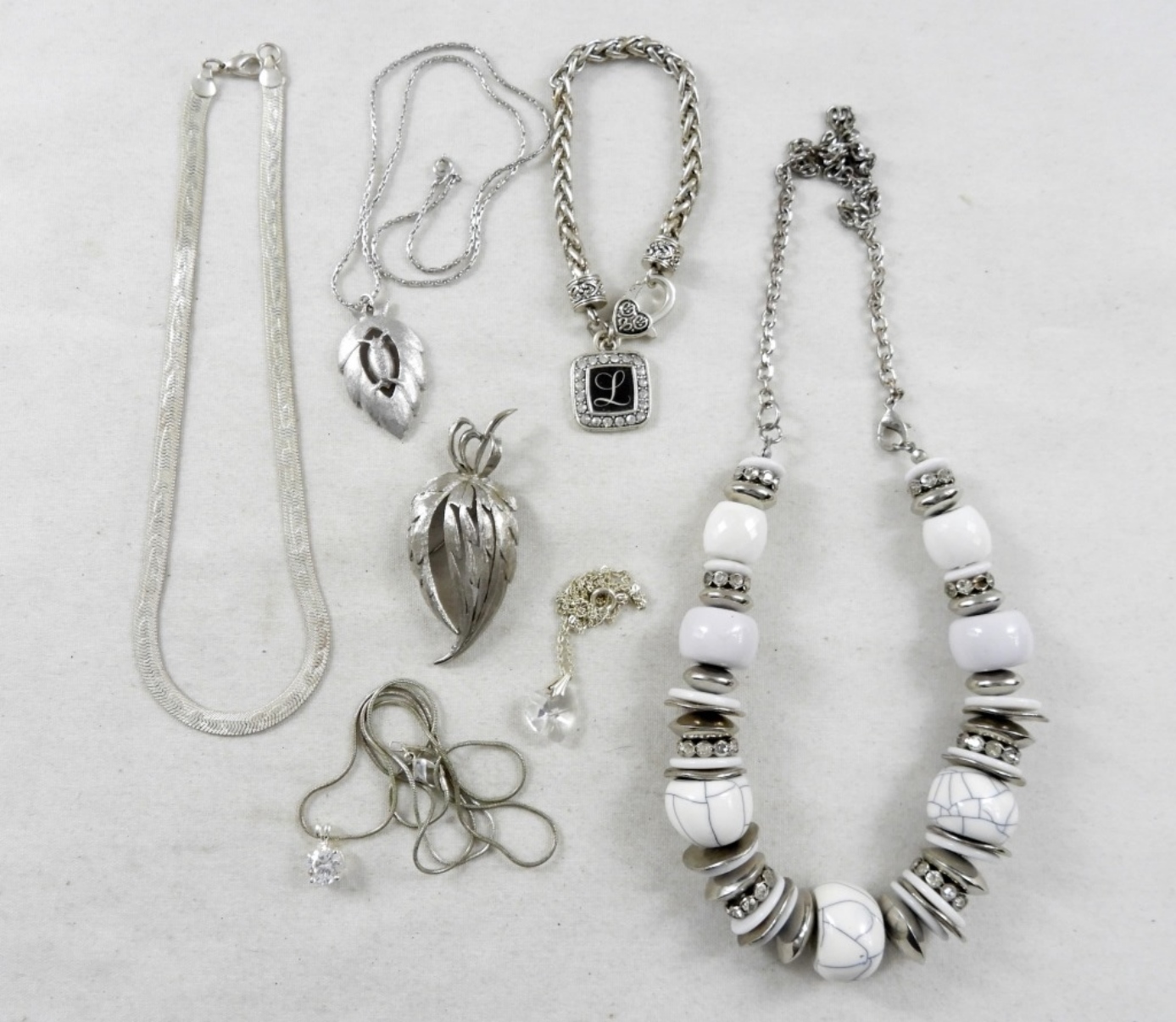 5 SILVER TONED NECKLACES LENGTHS RANGE FROM 14″-22″. 16″ WHITE BEADED &RHINESTONE NECKLACE. 22″ SILVER TONED NECKLACE WITH RHINESTONE PENDANT, SILVER TONED BROOCH, SILVER TONED NECKLACE WITH A CHARM WITH