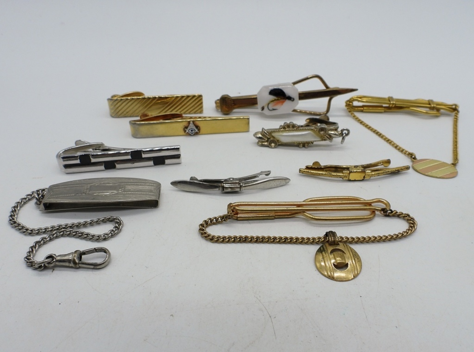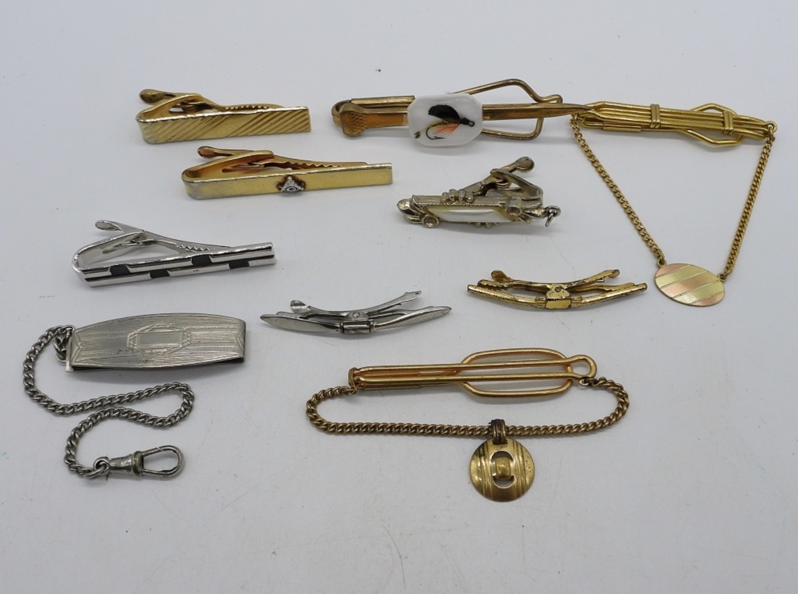 TEN VINTAGE, GOLD AND SILVER TONE TIE ACCESSORIES.