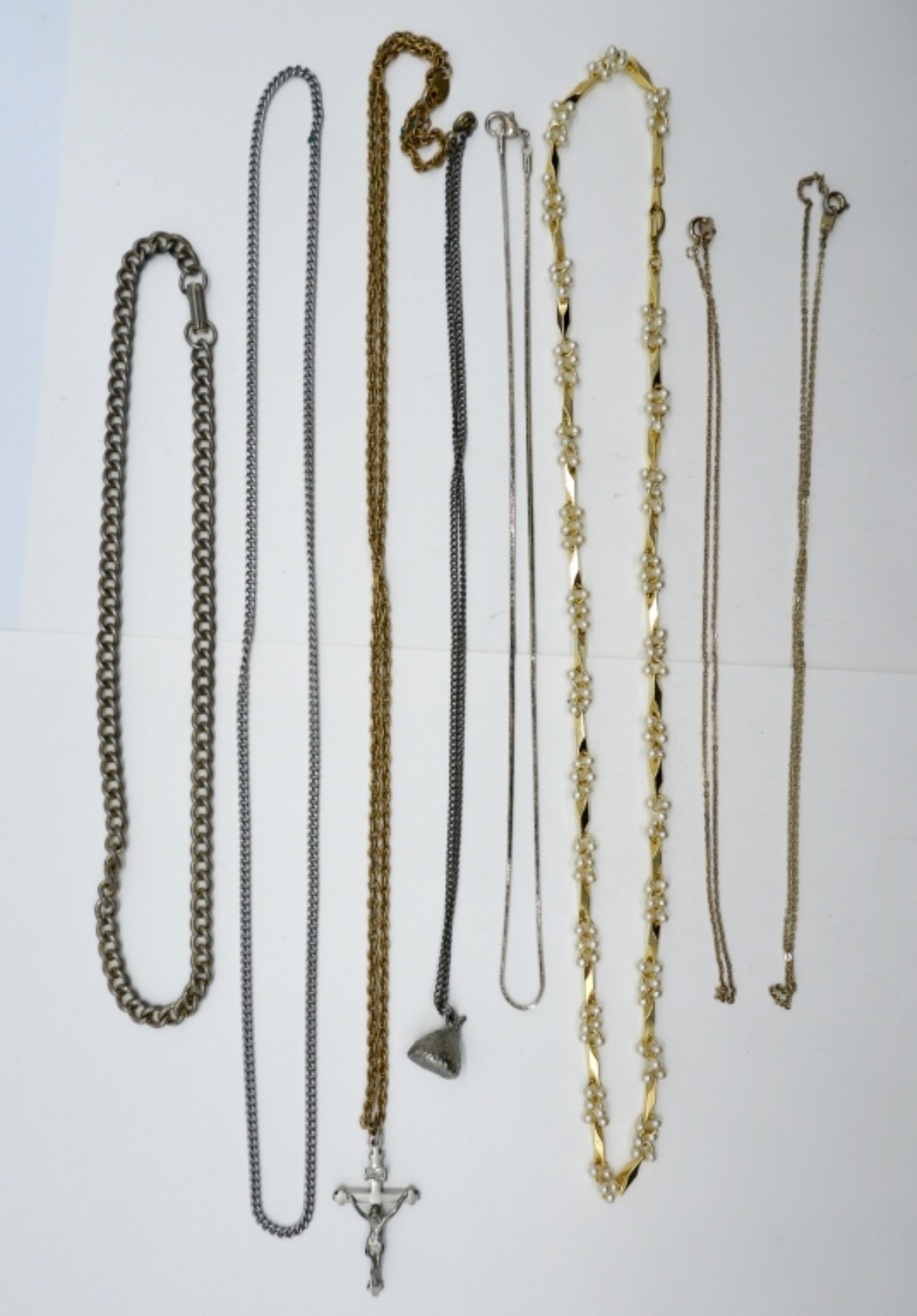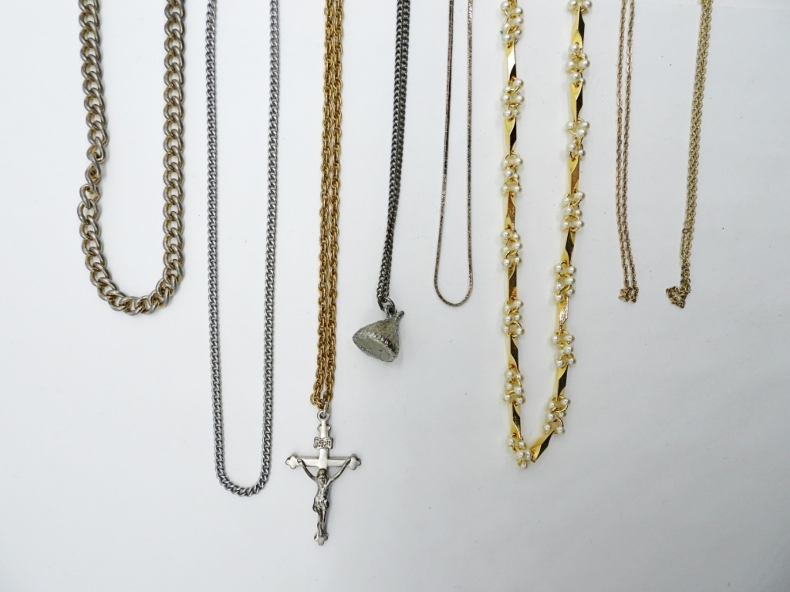 GOLD TONE WITH PEARLS, CHAINS, CROSS PENDANT, HERSHEY KISS PENDANT. 16″-26″