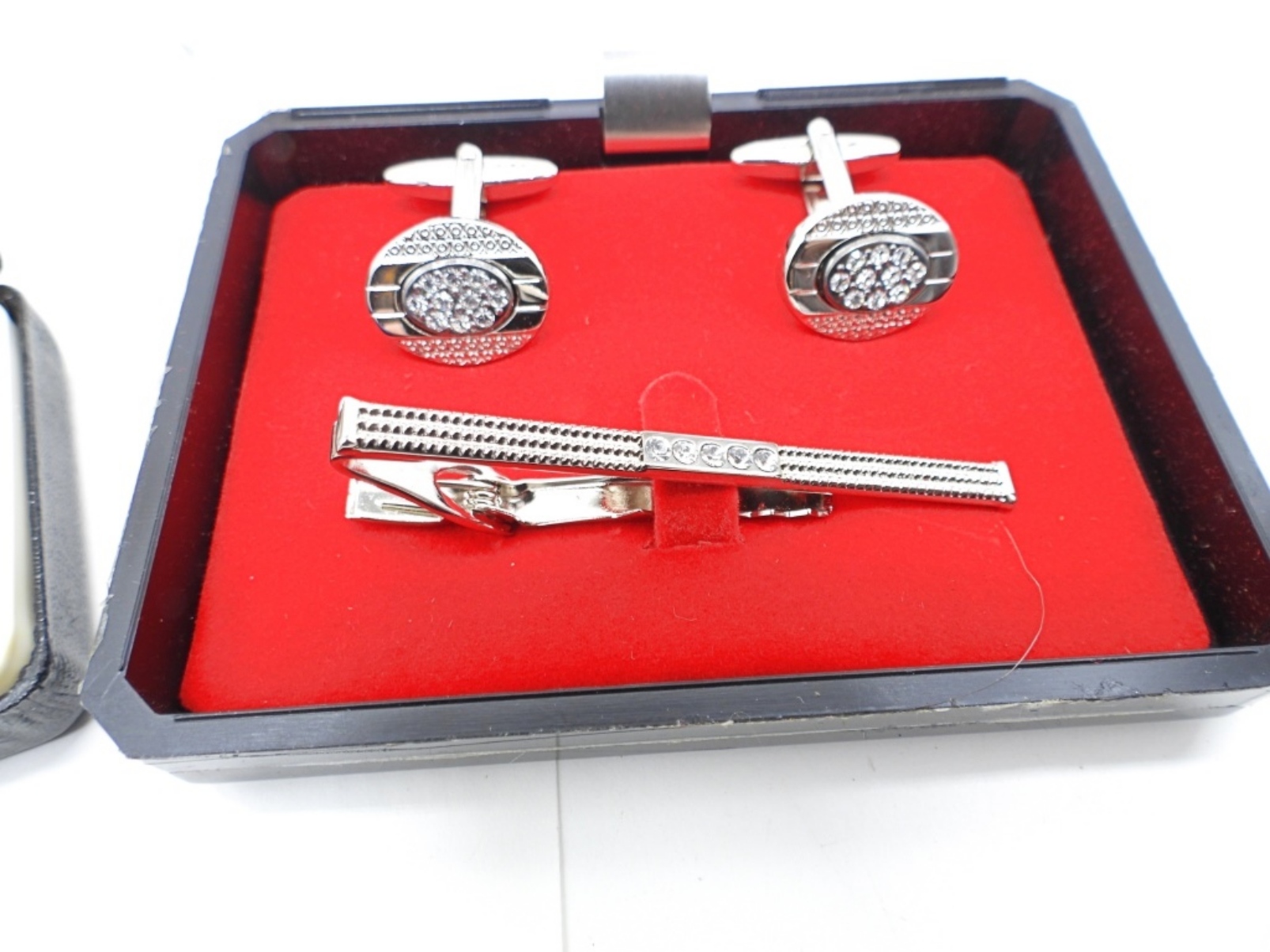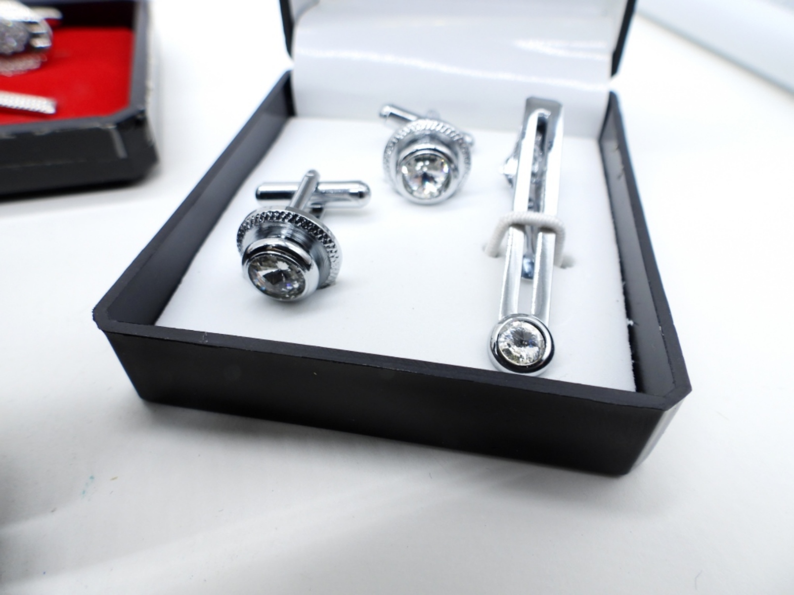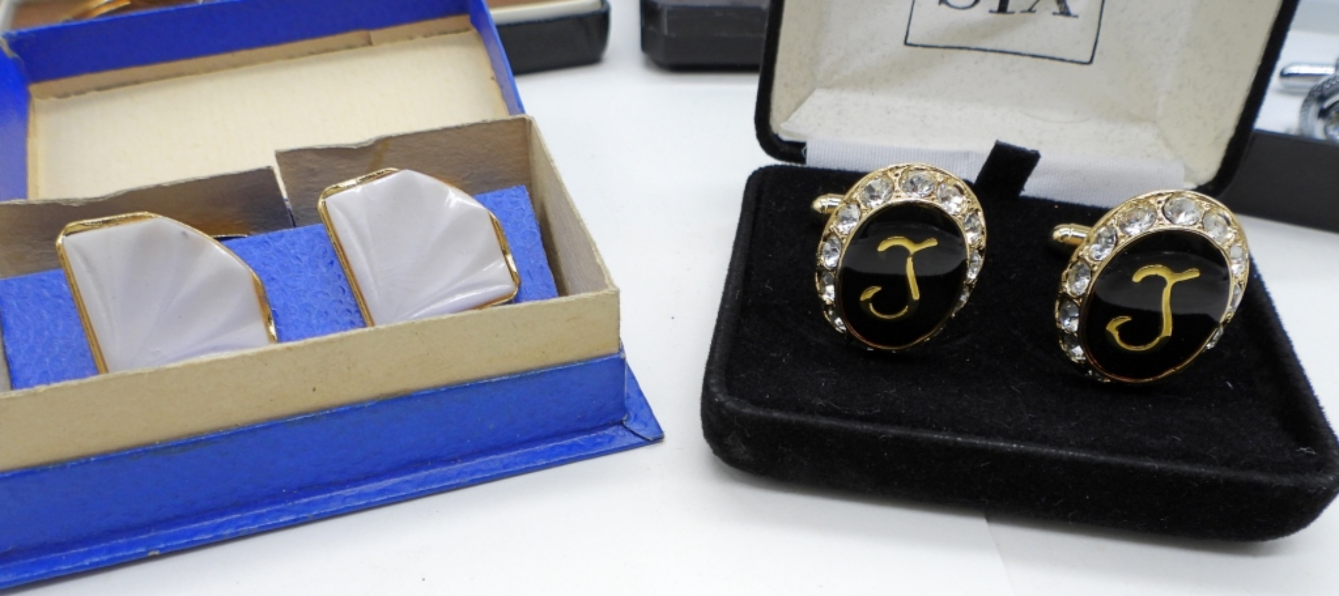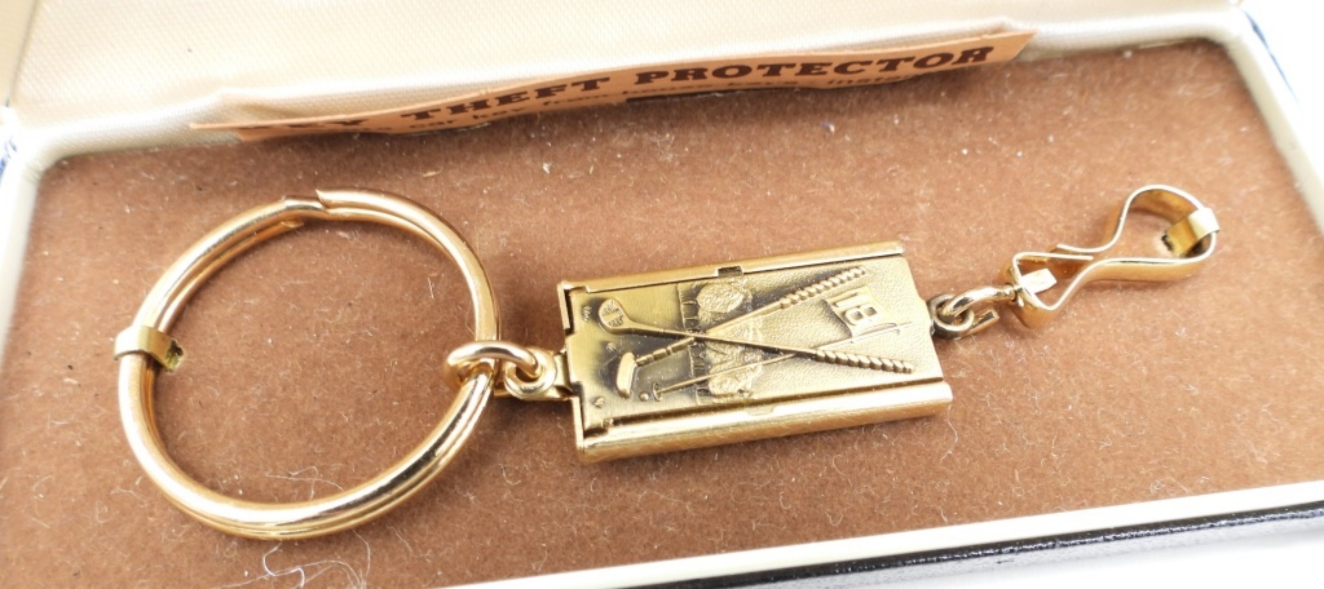 FOUR PAIR OF CUFFLINKS, TWO TIE CLIPS. ONE GOLF KEYCHAIN. GIORGIO BISSONI, AFTER SIX, STYLISH & A VINTAGE PAIR. KEYCHAIN FROM SEARS. ALL IN ORIGINAL BOXES.