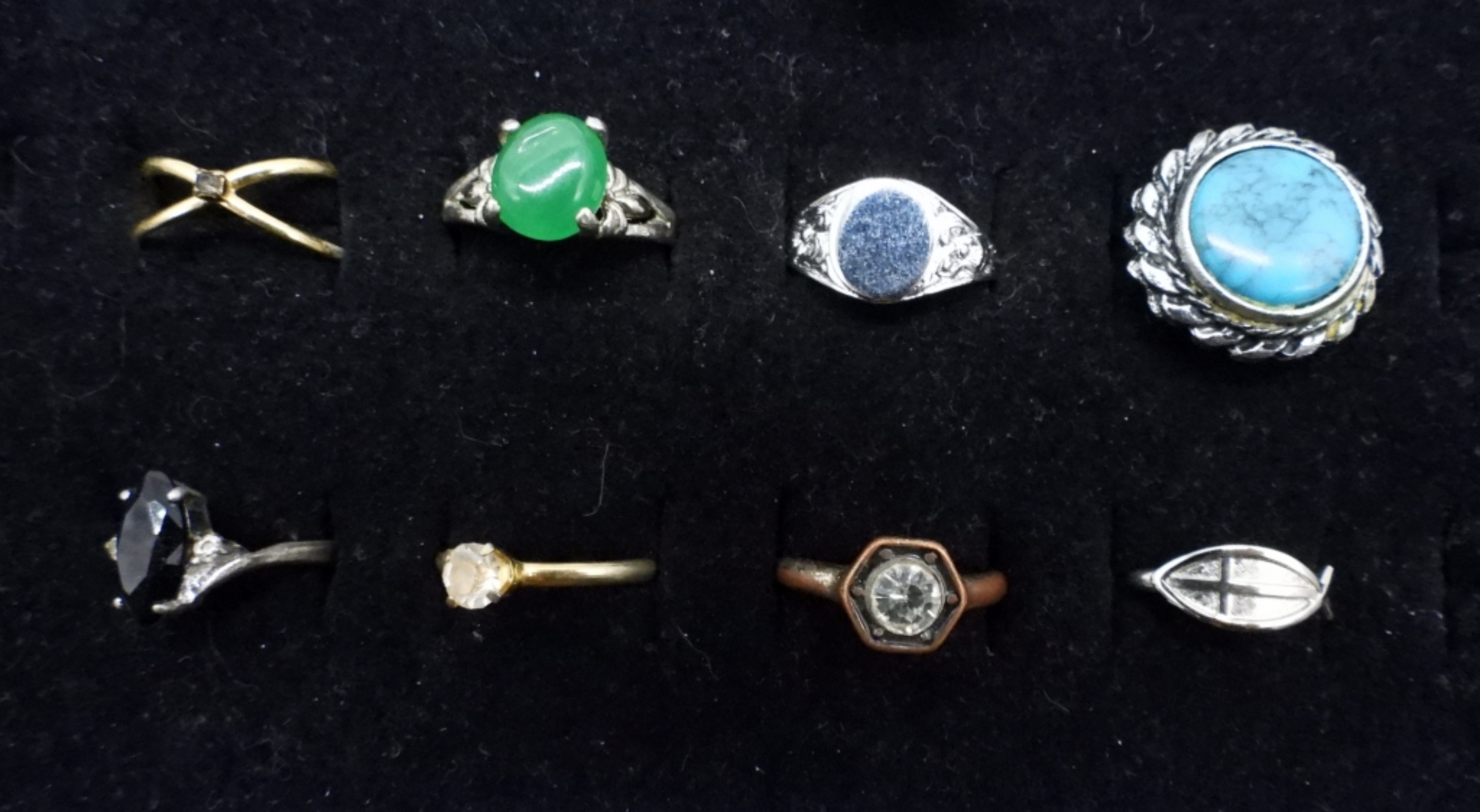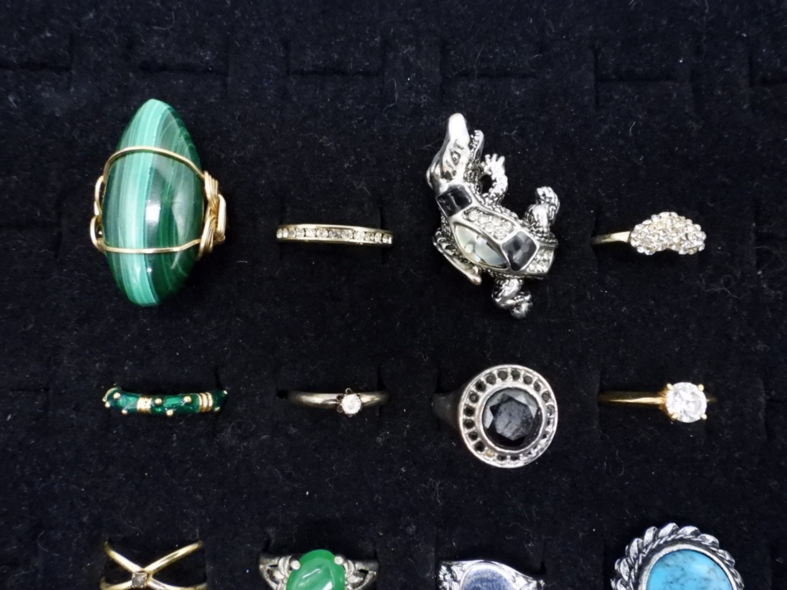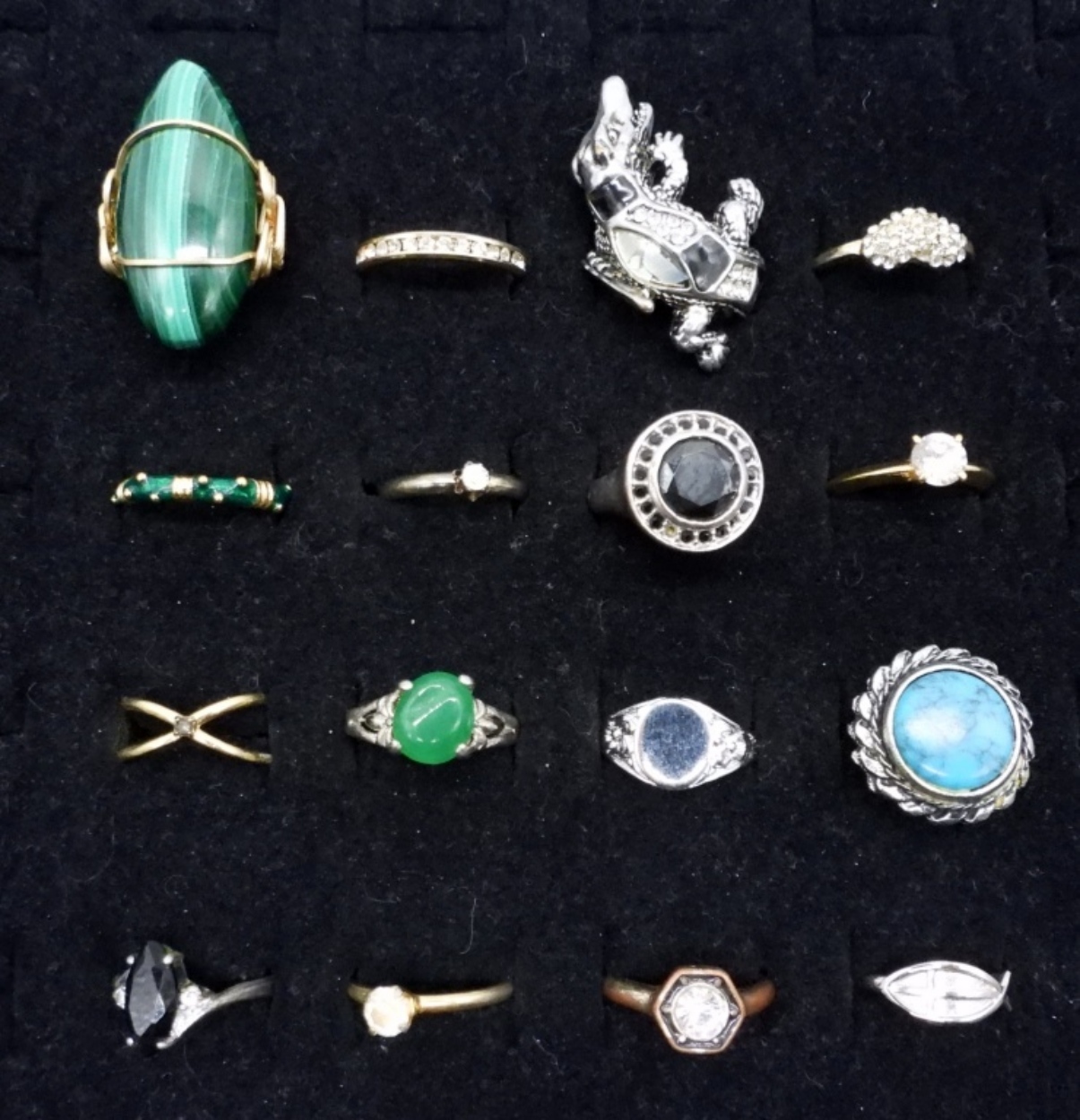 16 COSTUME, FASHION RINGS. SOME WITH GEMSTONES. SIZES 5.5-11