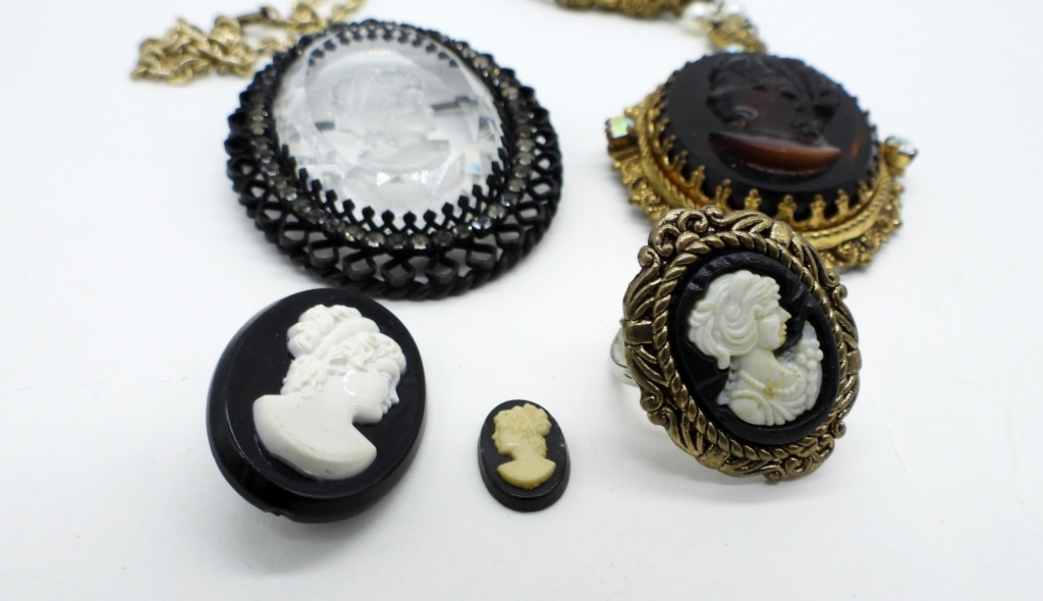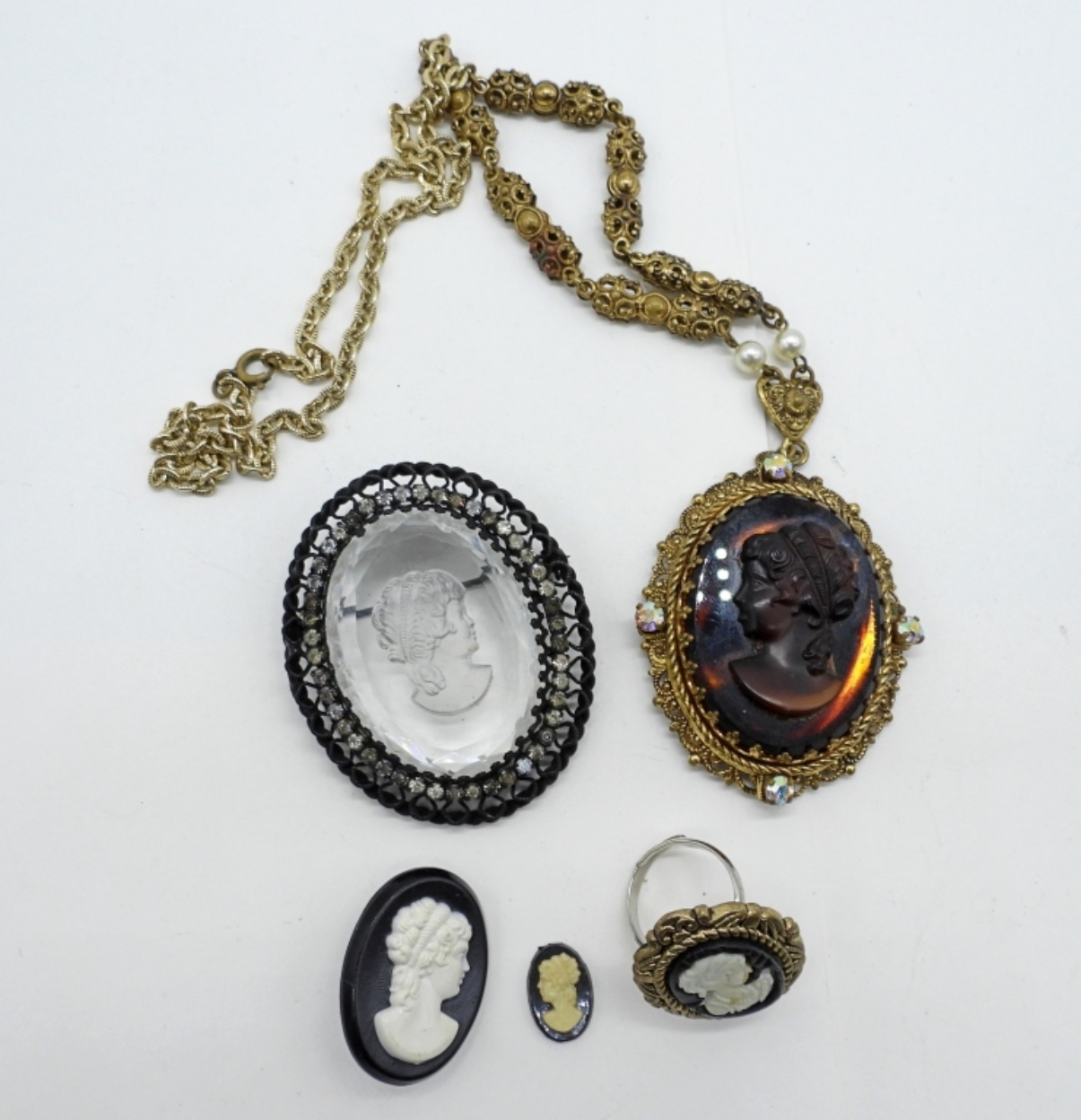 NECKLACE, 20″. TWO BROOCHES, 1″-2″. RING SIZE 5. LOOSE CAMEO FACE.