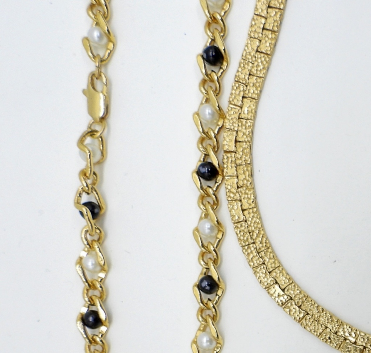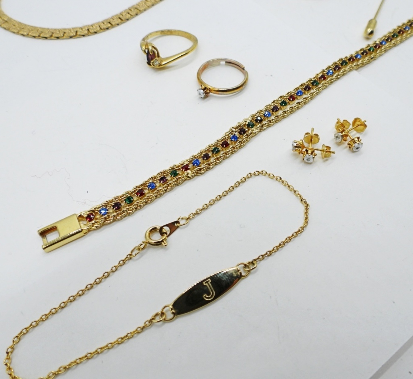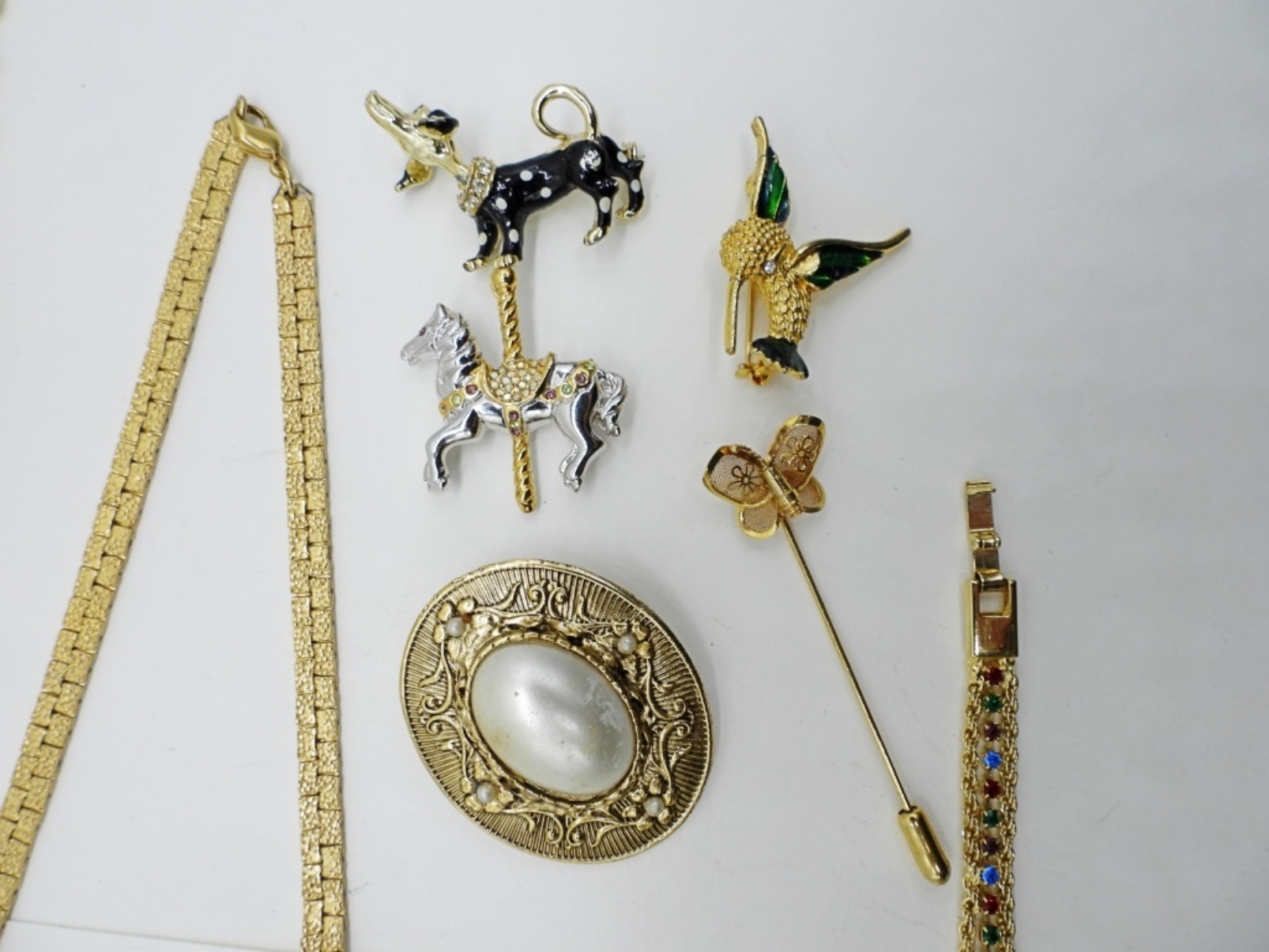 TWO NECKLACES, 18″ & 24″. TWO BRACELETS, 7-8″. TWO RINGS SIZES 6 & 8. 5 PINS. TWO PAIR EARRINGS