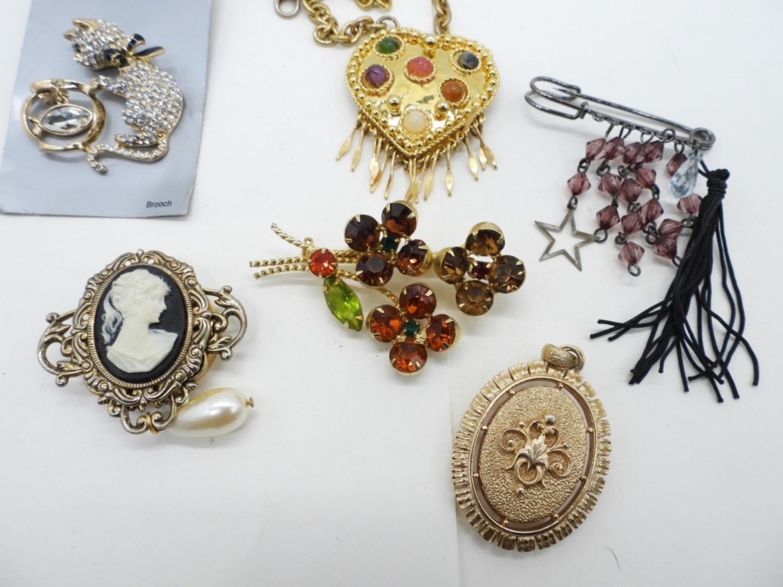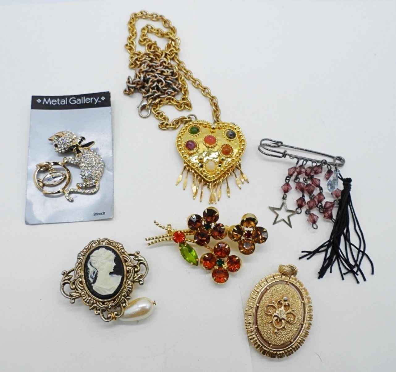 NECKLACE, 32″. CAMEO BUTTON COVER & CAMEO PENDANT. THREE PINS.