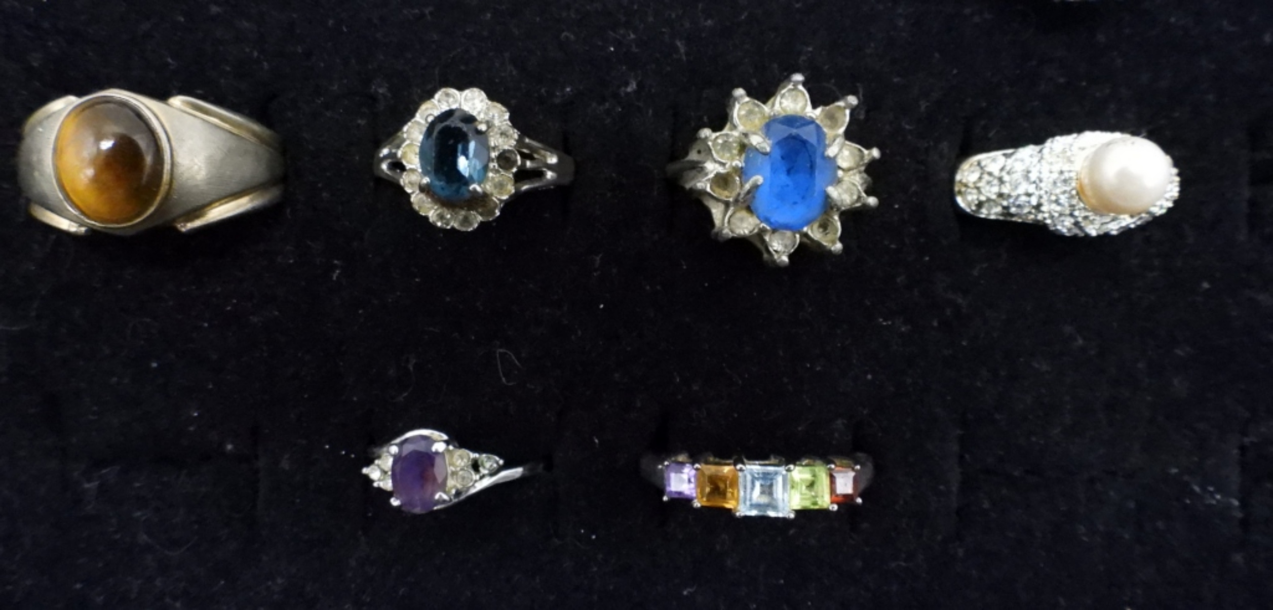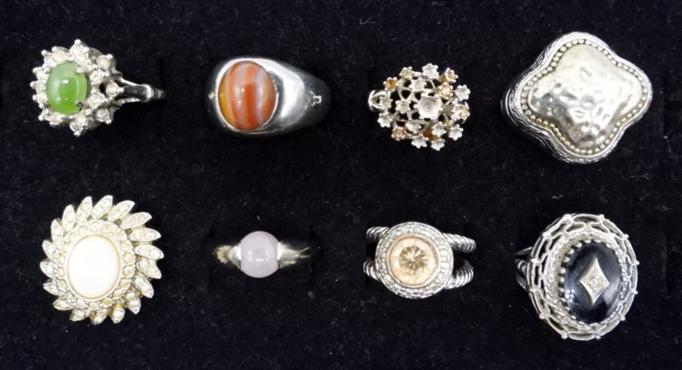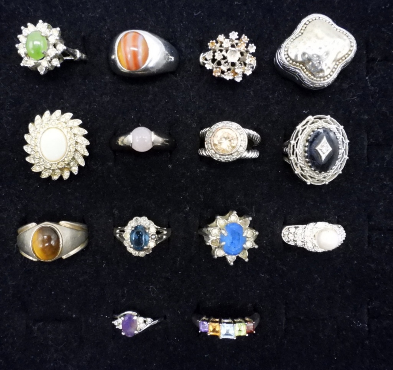 FOURTEEN SILVER TONE FASHION RINGS. SIZES 6-10. SOME NATURAL GEMSTONES.