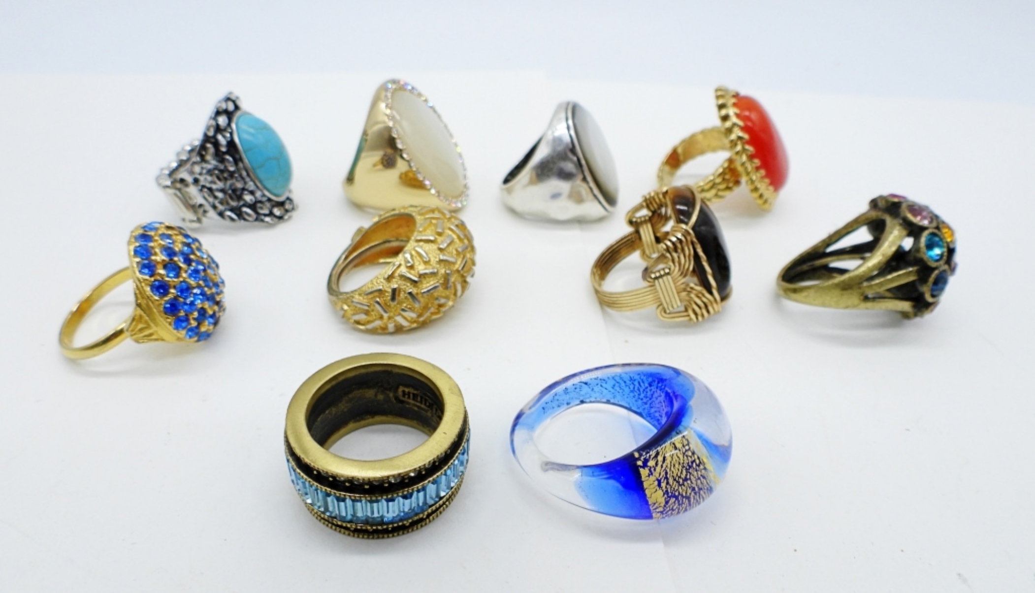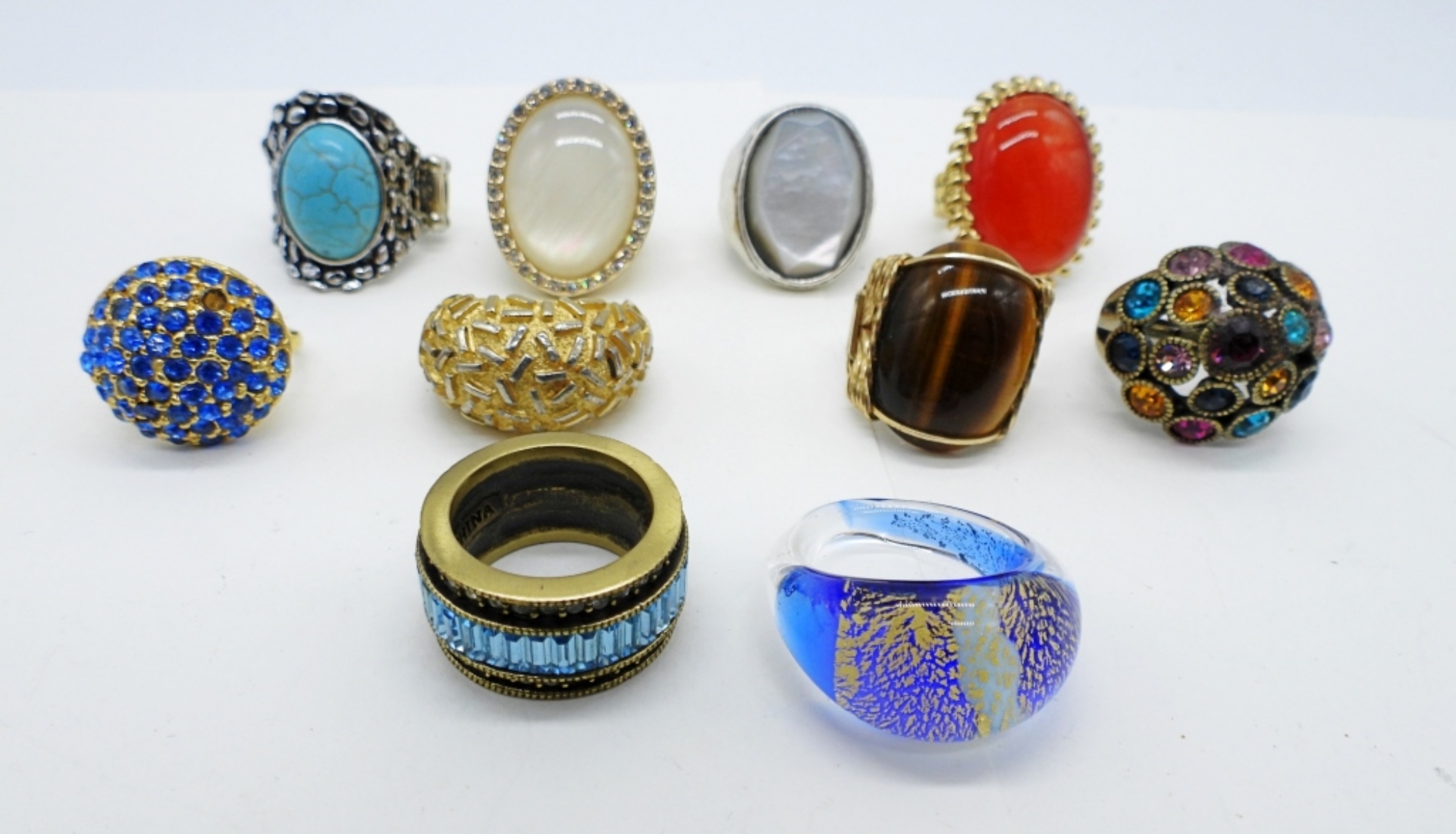 TIGERS EYE, HEIDI DAVIS BLUE BAND RING, MOTHER OF PEARL, GLASS RING & MORE. SIZES 6-8