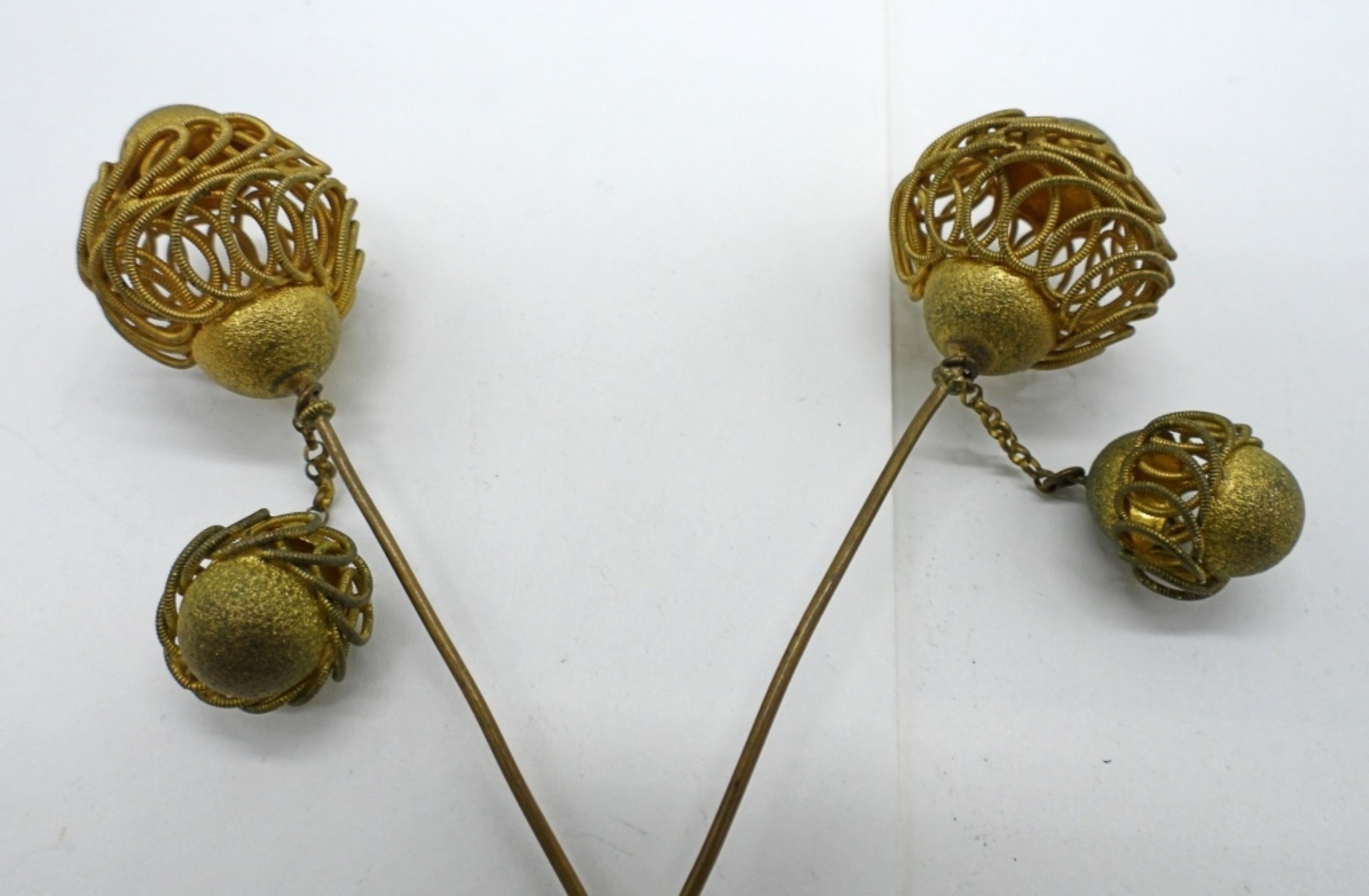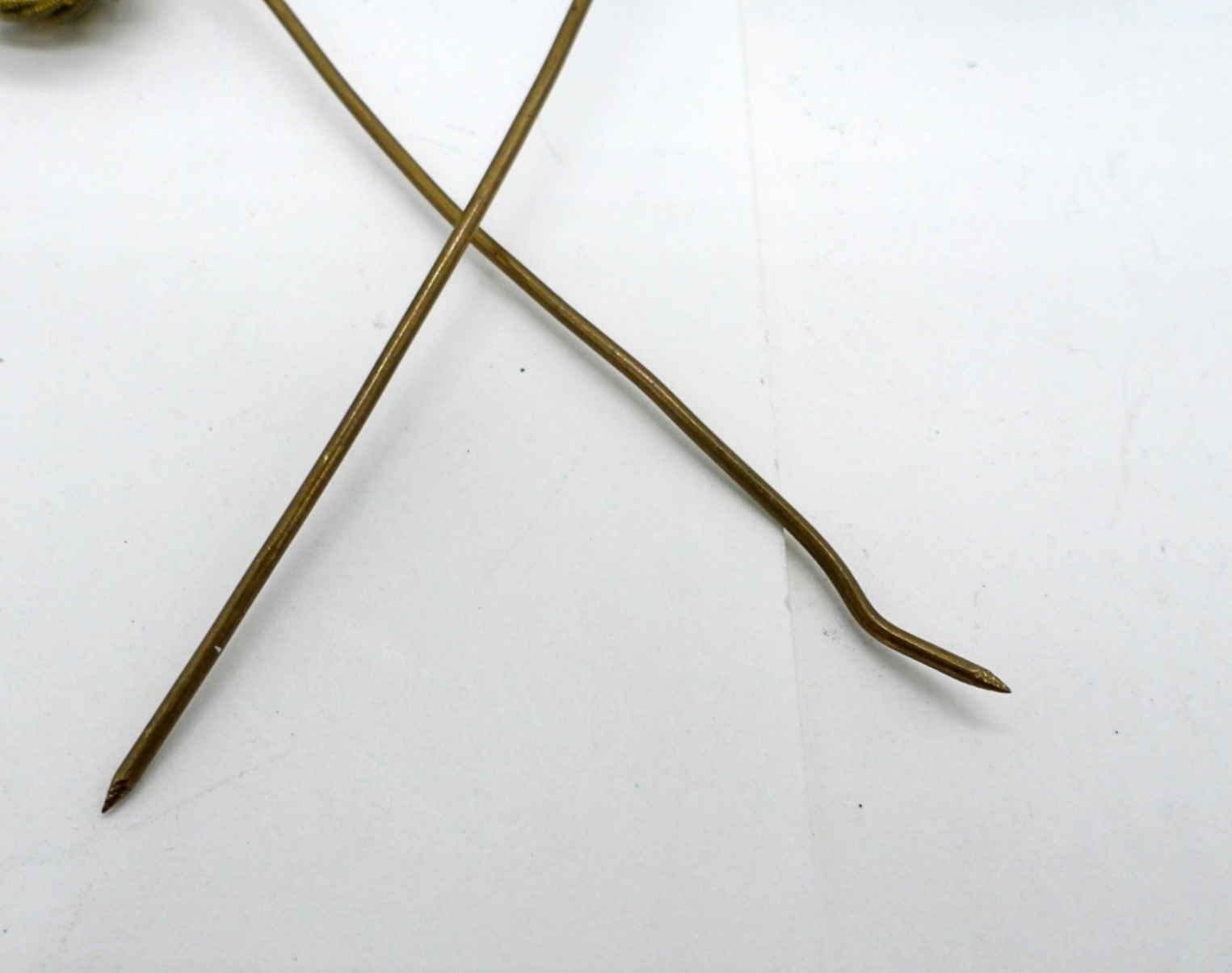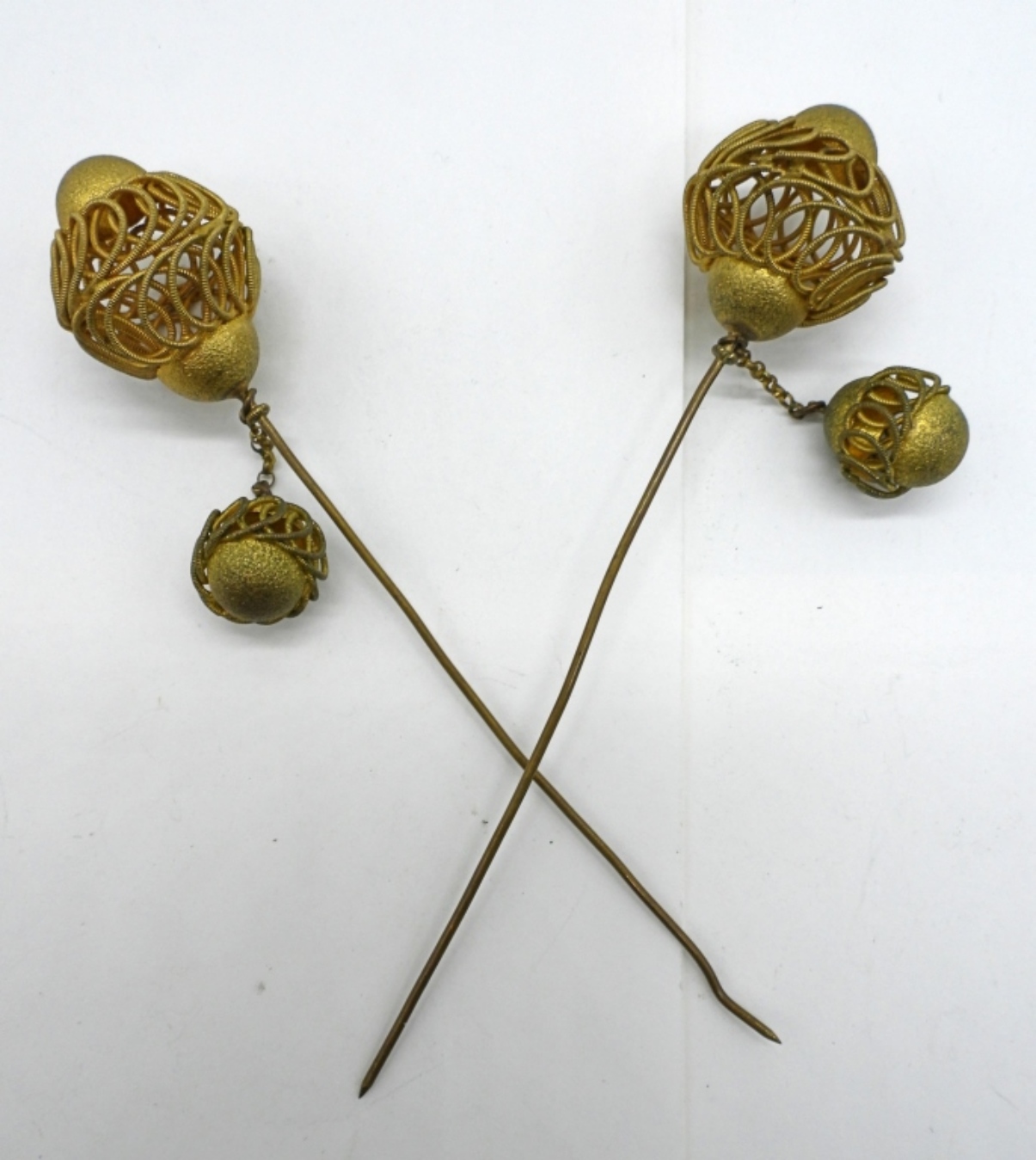 TWO VINTAGE GOLD COLORED HAT PINS. 6″ LONG.