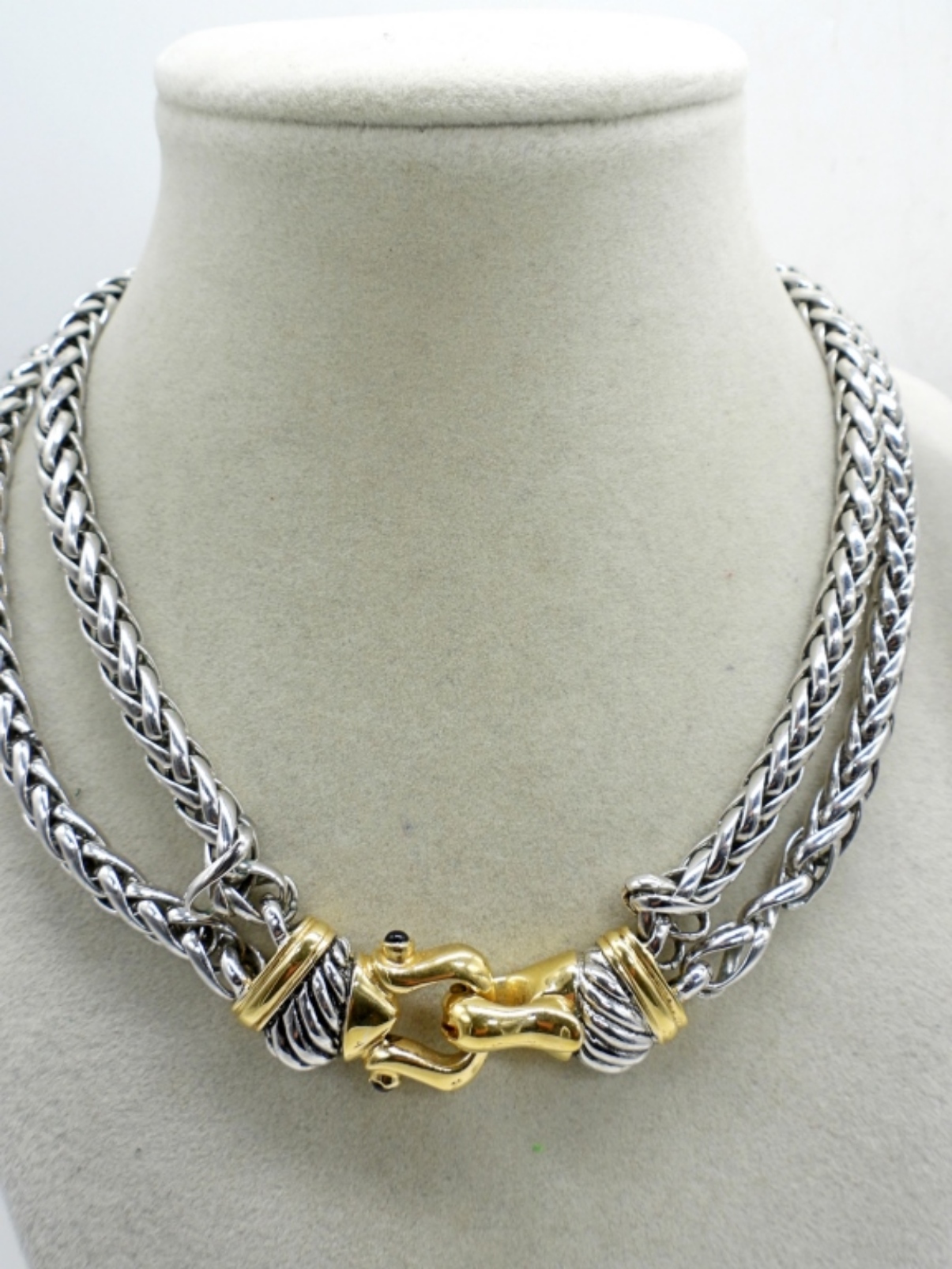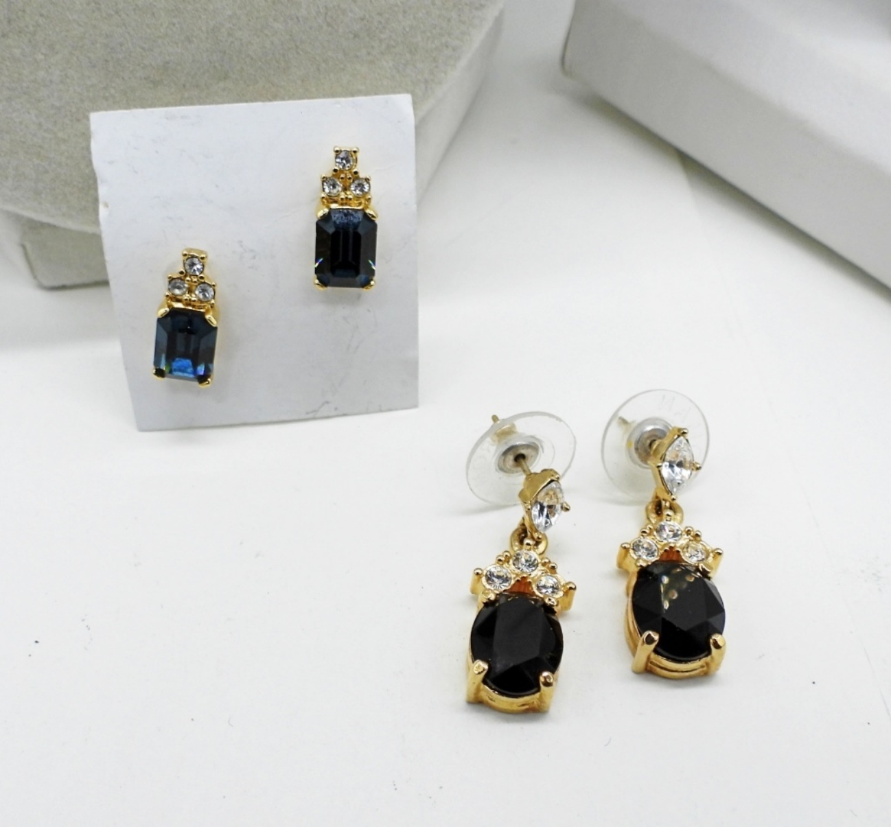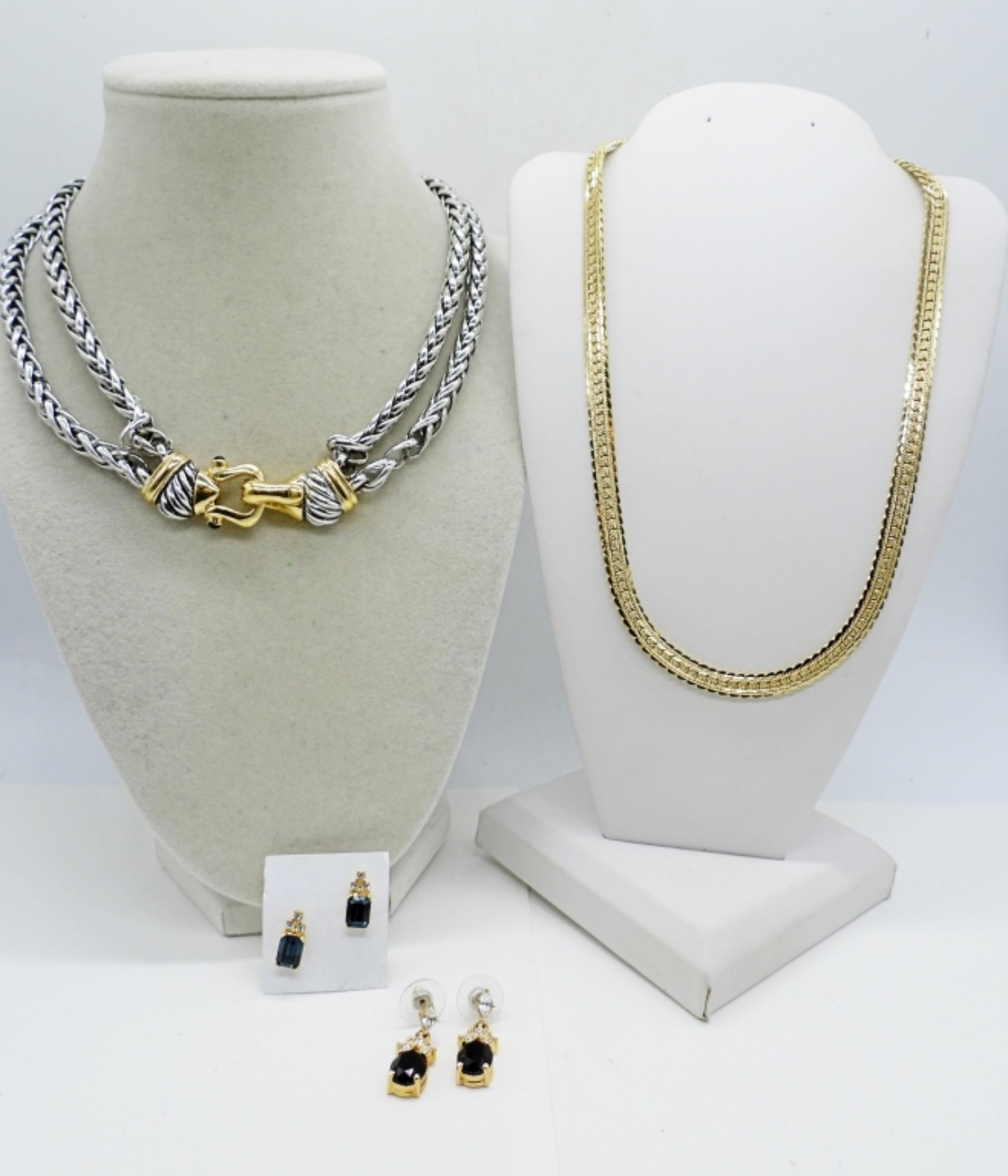 2 NECKLACES, 16-18″. TWO PAIR OF PRETTY GEMSTONE GOLD TONE PIERCED EARRINGS.