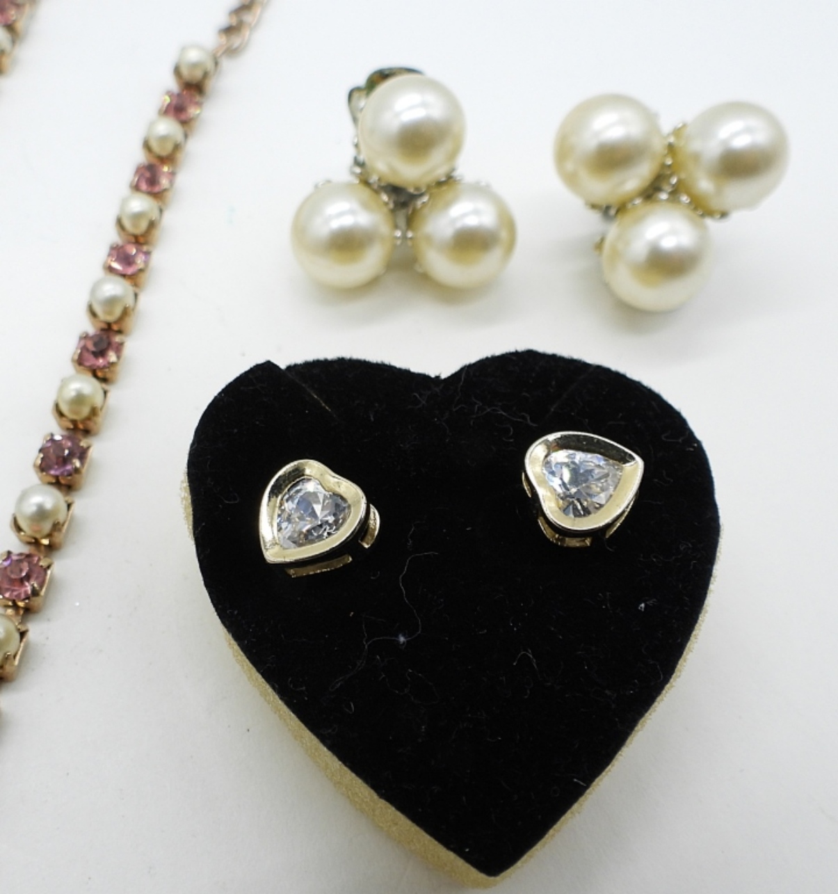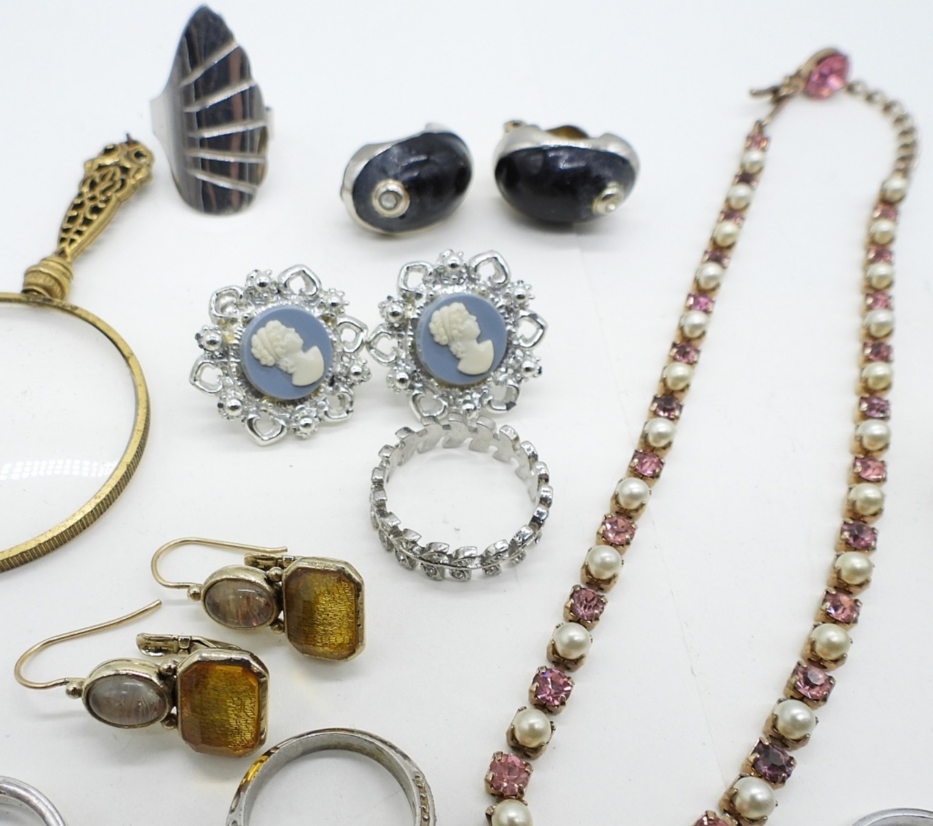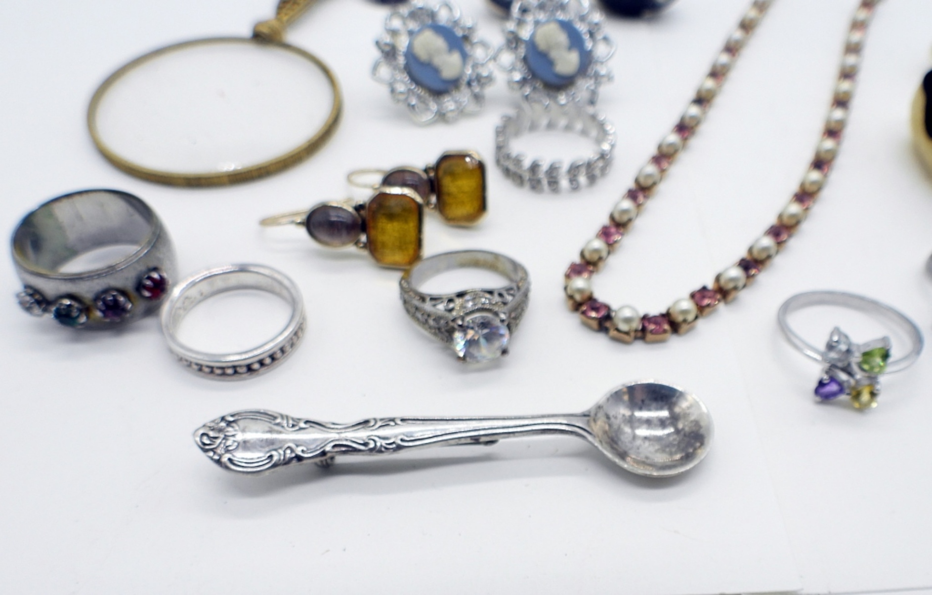 7 RINGS, SIZE 6-9. FIVE PAIR OF EARRINGS. PIERCED & CLIP ON. 14″ PINK NECKLACE. SPOON PIN AND MAGNIFYING GLASS PENDANT.
