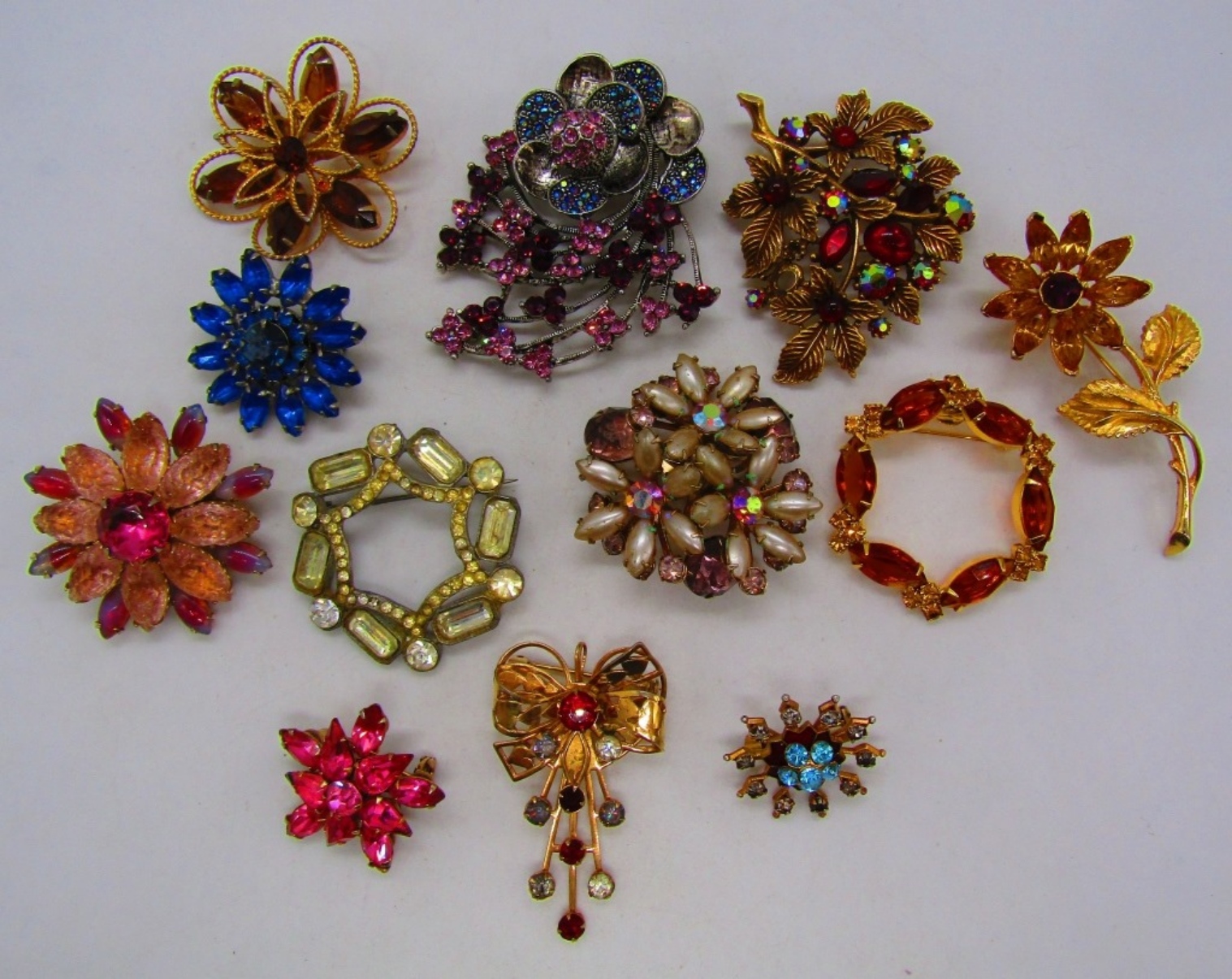 TWELVE VINTAGE RHINESTONE FLOWER SHAPED BROOCHES. 1″-3″