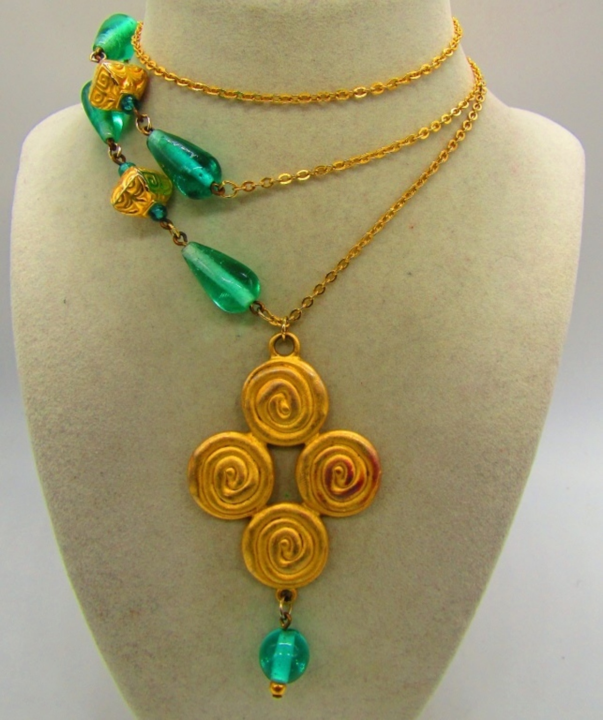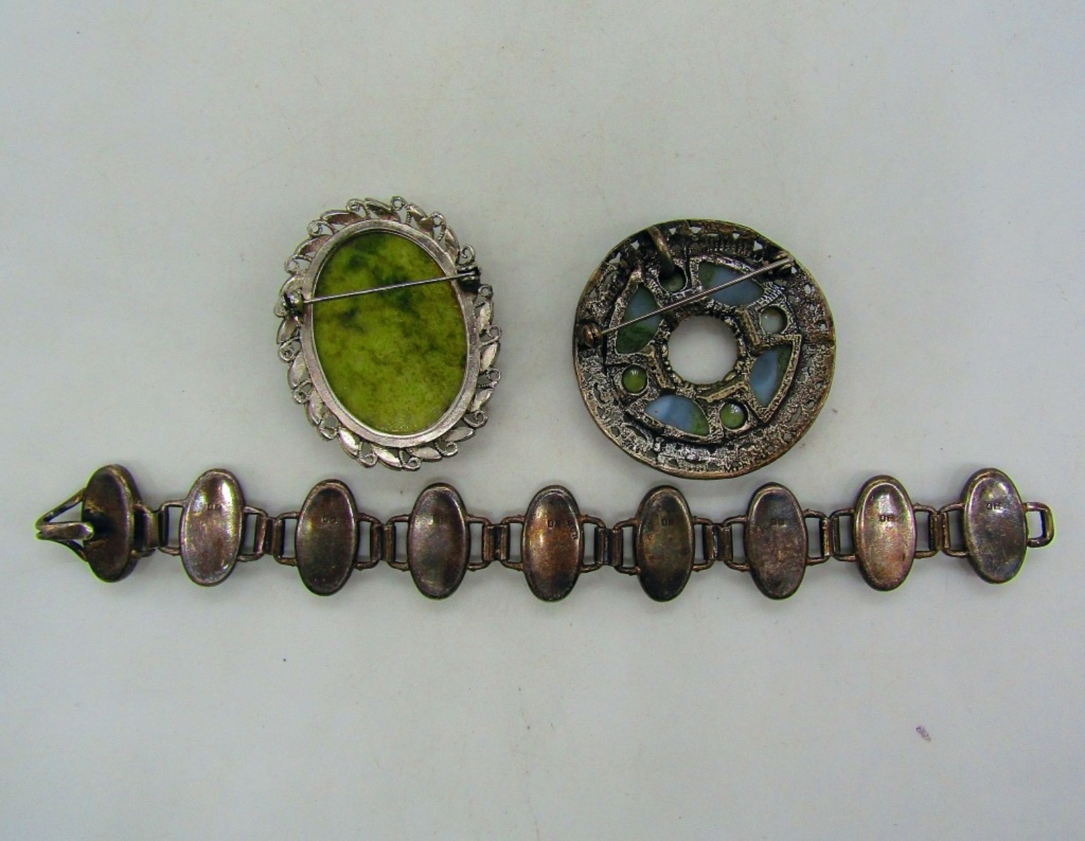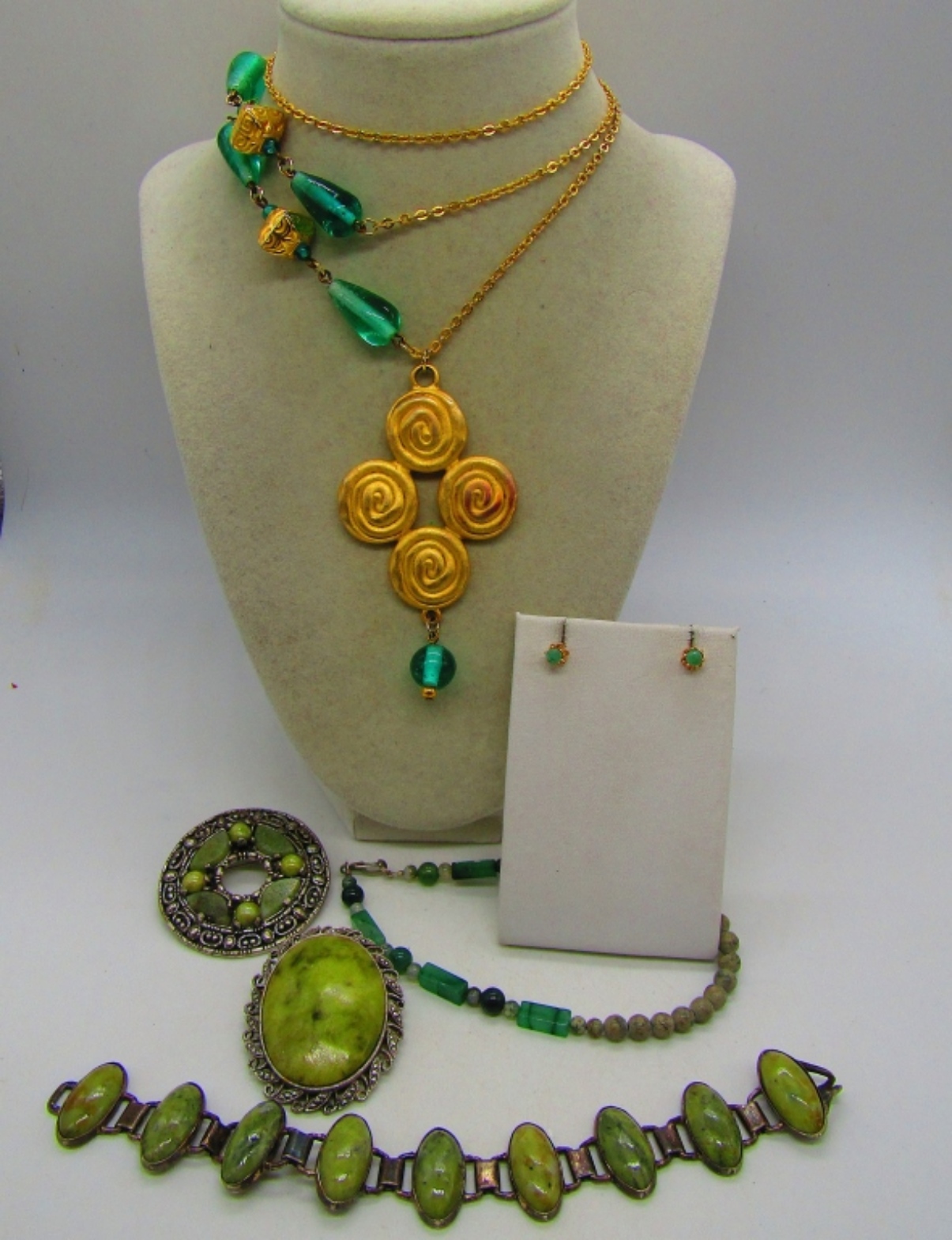 GOLD TONE, GREEN GLASS NECKLACE, 36″. PRETTY GREEN GEMSTONE STUD EARRINGS. TWO GREEN AGATE BROOCHES 2″-2.5″. TWO BRACELETS 8″-10″
