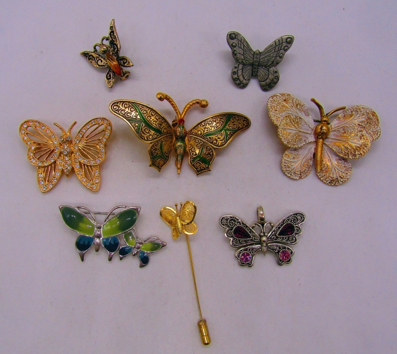 SEVEN GOLD AND SILVER TONE PINS, 1″-3″. SILVER TONE BUTTERFLY PENDANT, 2″.
