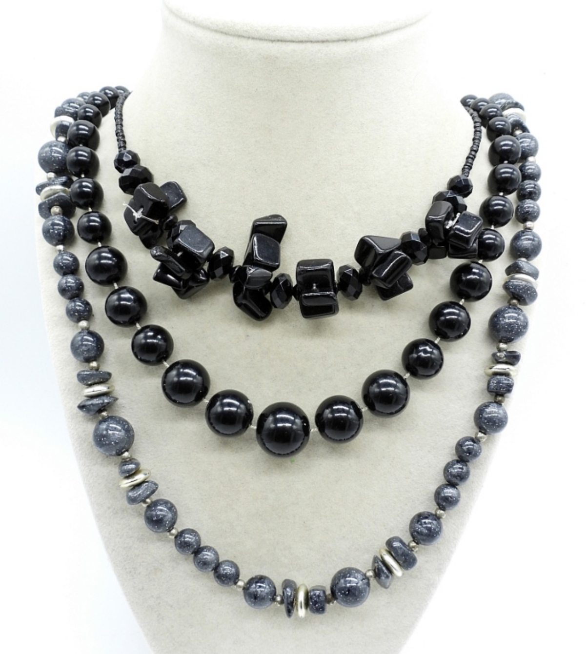 FIVE NECKLACES, 18-30″. THREE PAIR OF PIERCED EARRINGS. TWO GOLD TONE BRACELETS 7-8″.