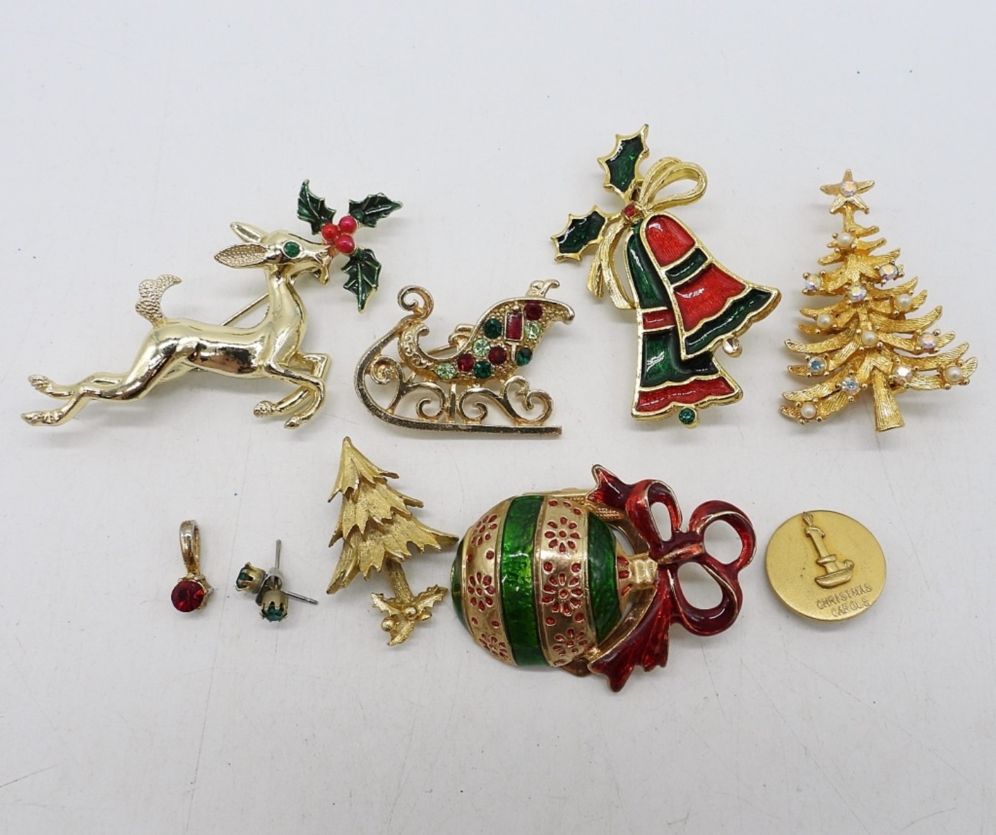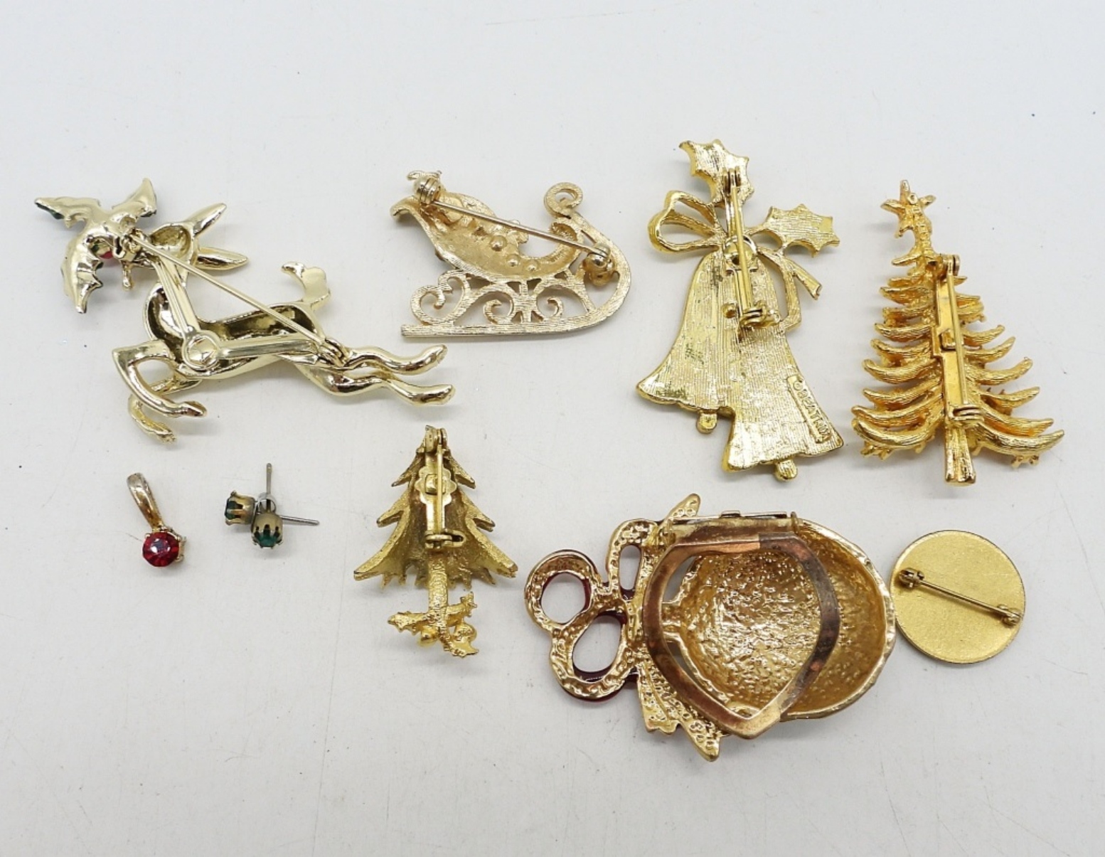 SIX GOLD TONE BROOCHES. ONE ORNAMENT SCARF CLIP. ONE PAIR OF GREEN GEMSTONE PIERCED EARRINGS. ONE RED GEMSTONE PENDANT.