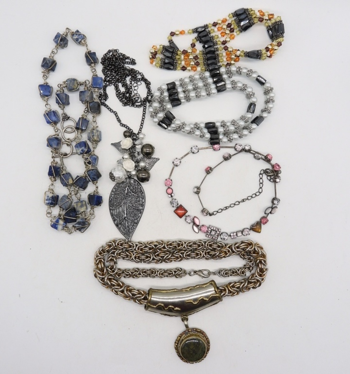 SIX GEMSTONE AND FASHION NECKLACES. 19″-35″.