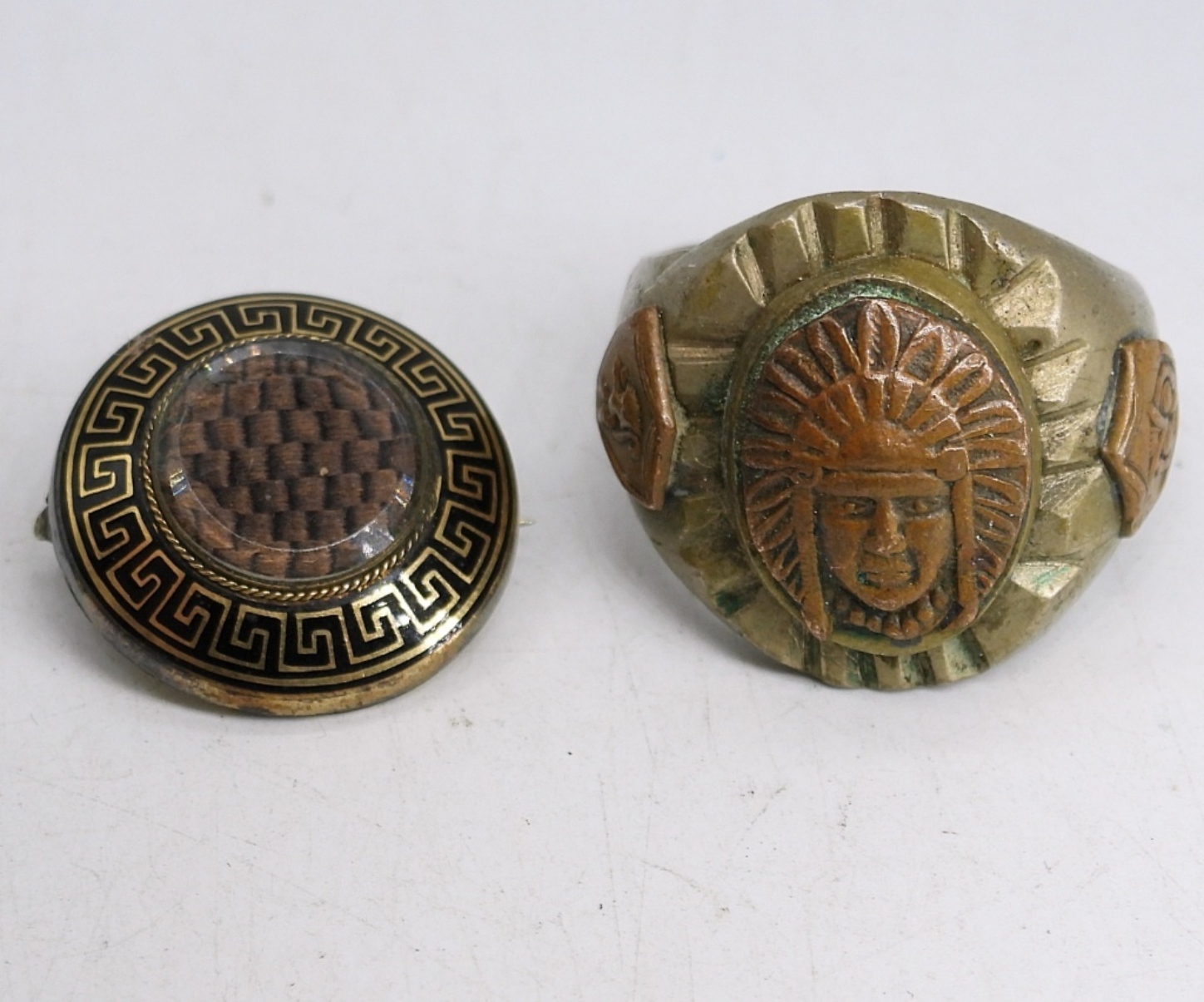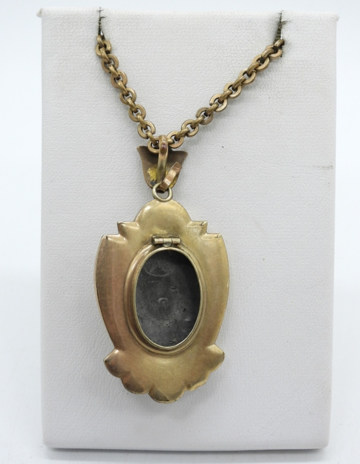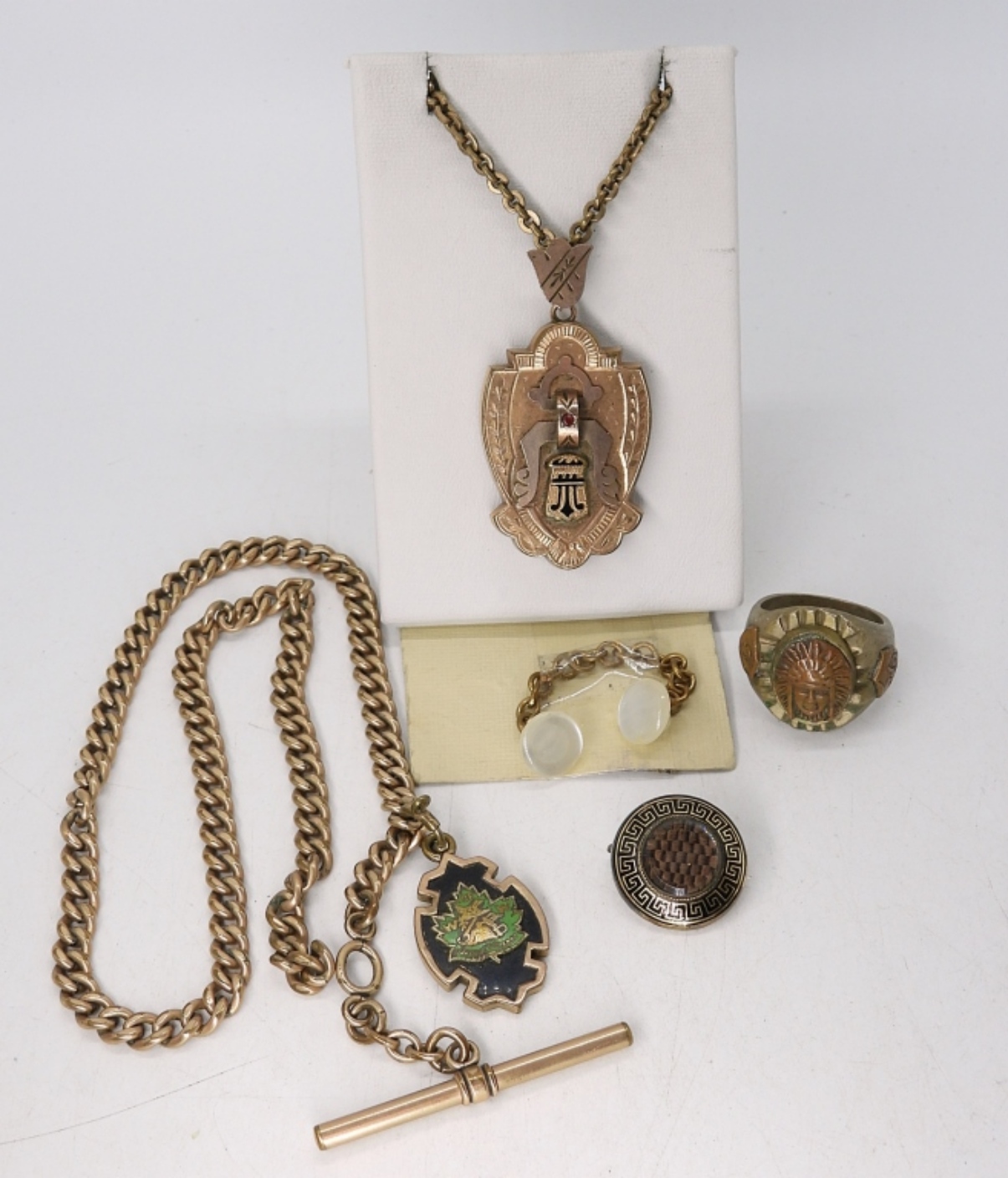 RING SIZE 8.5. NECKLACE IS 18″ AND MISSING THE BACK (SEE PHOTOS). 1″ PIN. 14″ WATCH CHAIN (MAY NEED REPAIR)