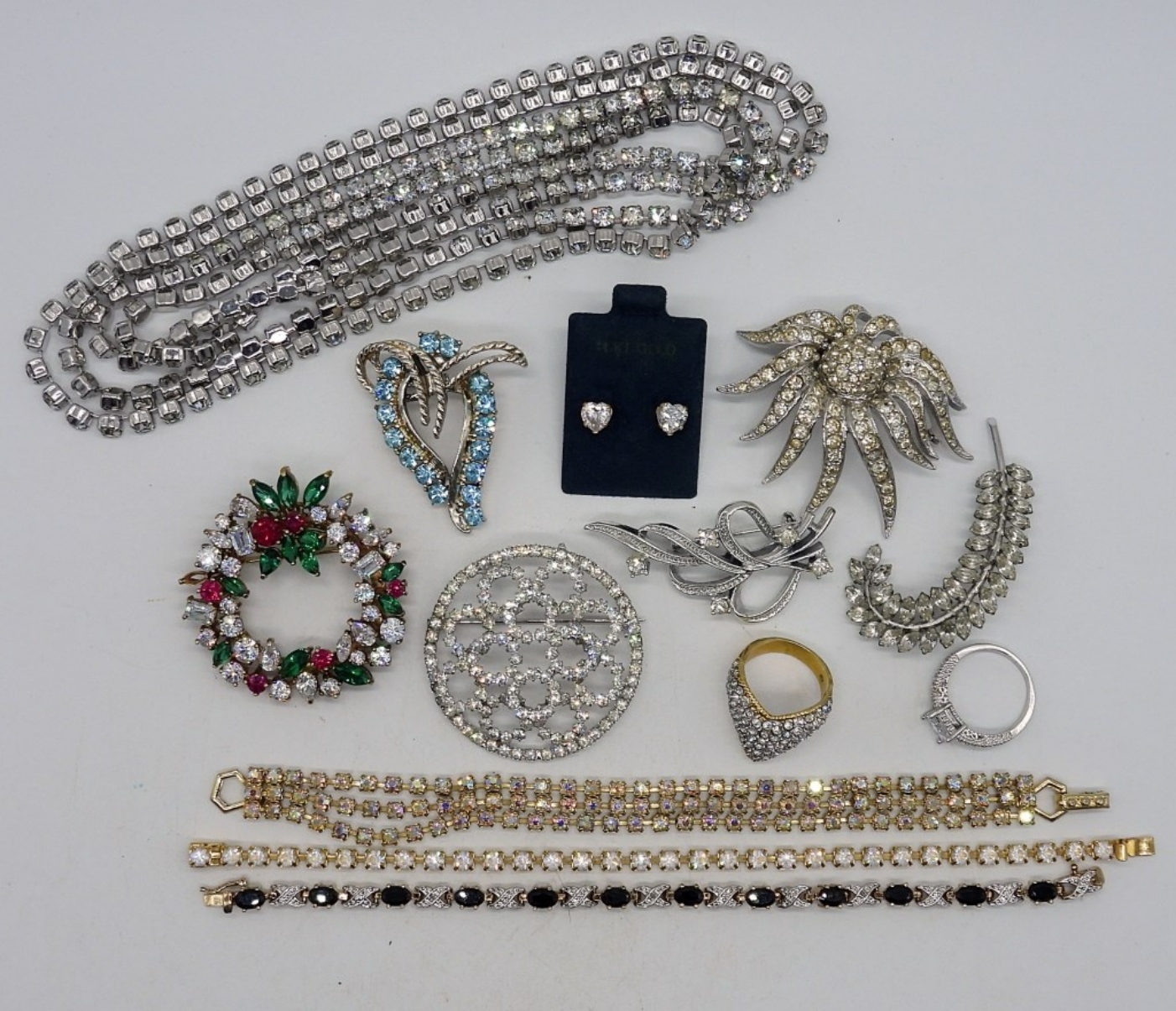 SIX RHINESTONE BROOCHES. TWO RINGS, SIZE 7. ONE PAIR PIERCED EARRINGS. THREE MODERN RHINESTONE BRACELETS, 7″. 54″ RHINESTONE NECKLACE.