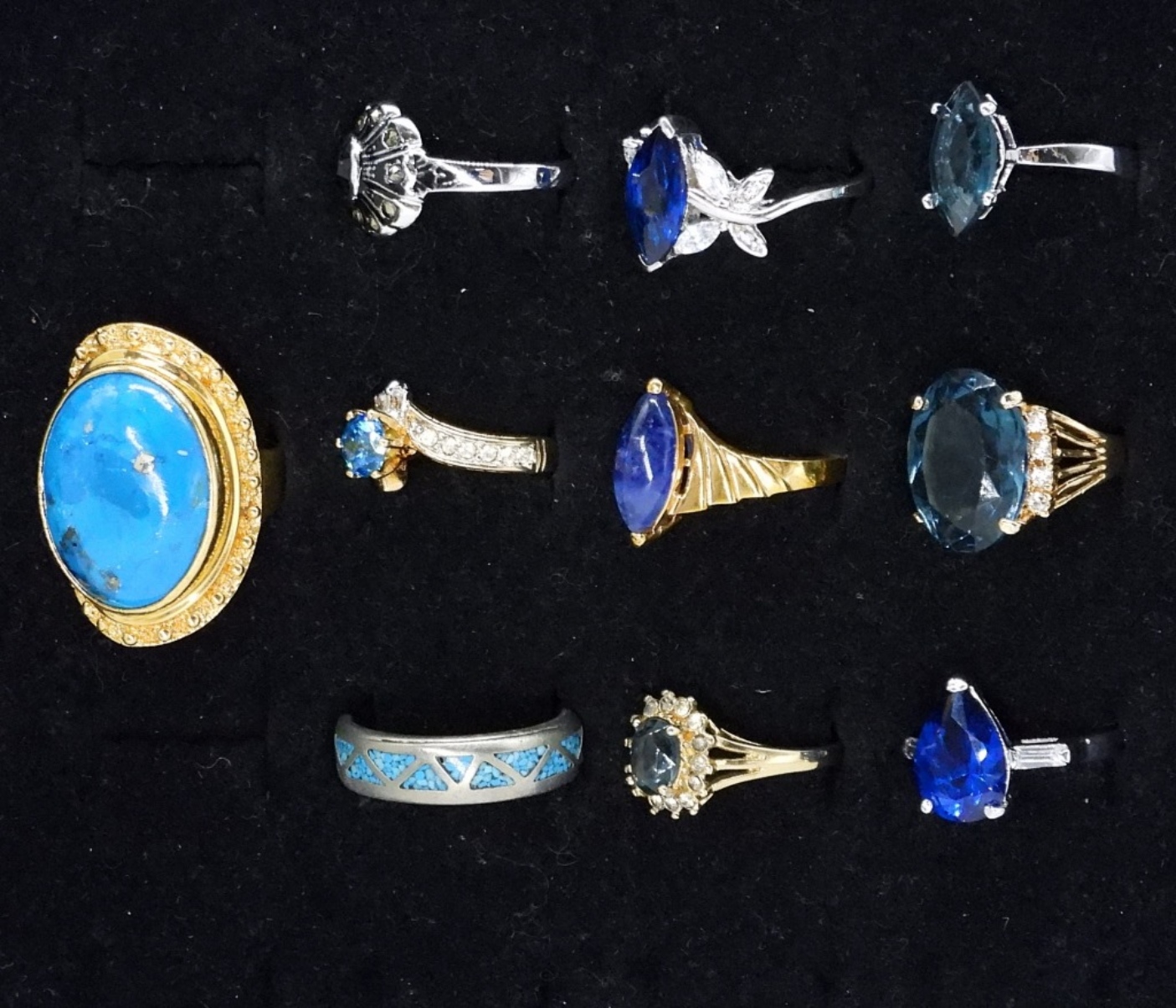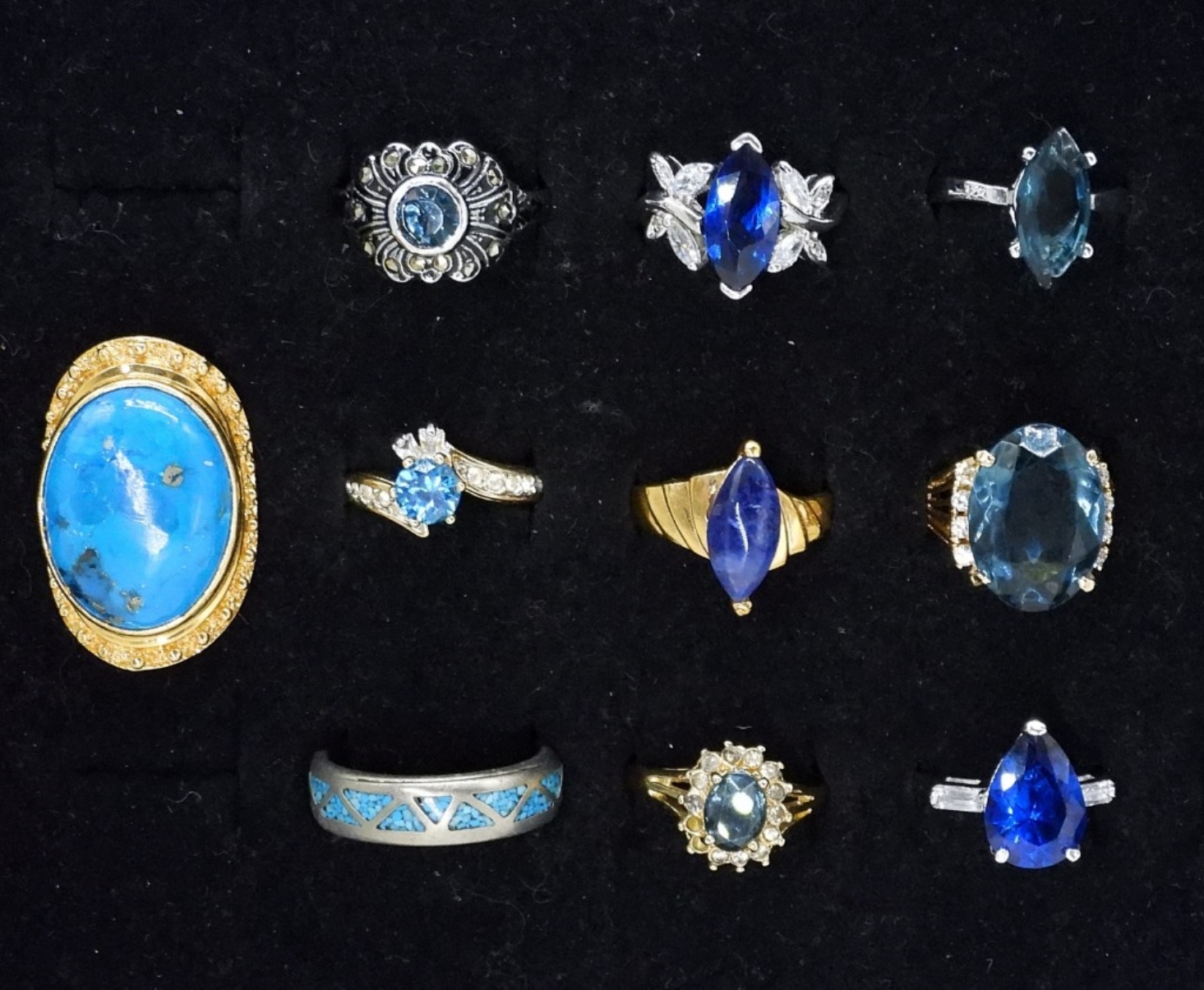 TEN BLUE GEMSTONE FASHION RINGS. SIZES 5-11.5