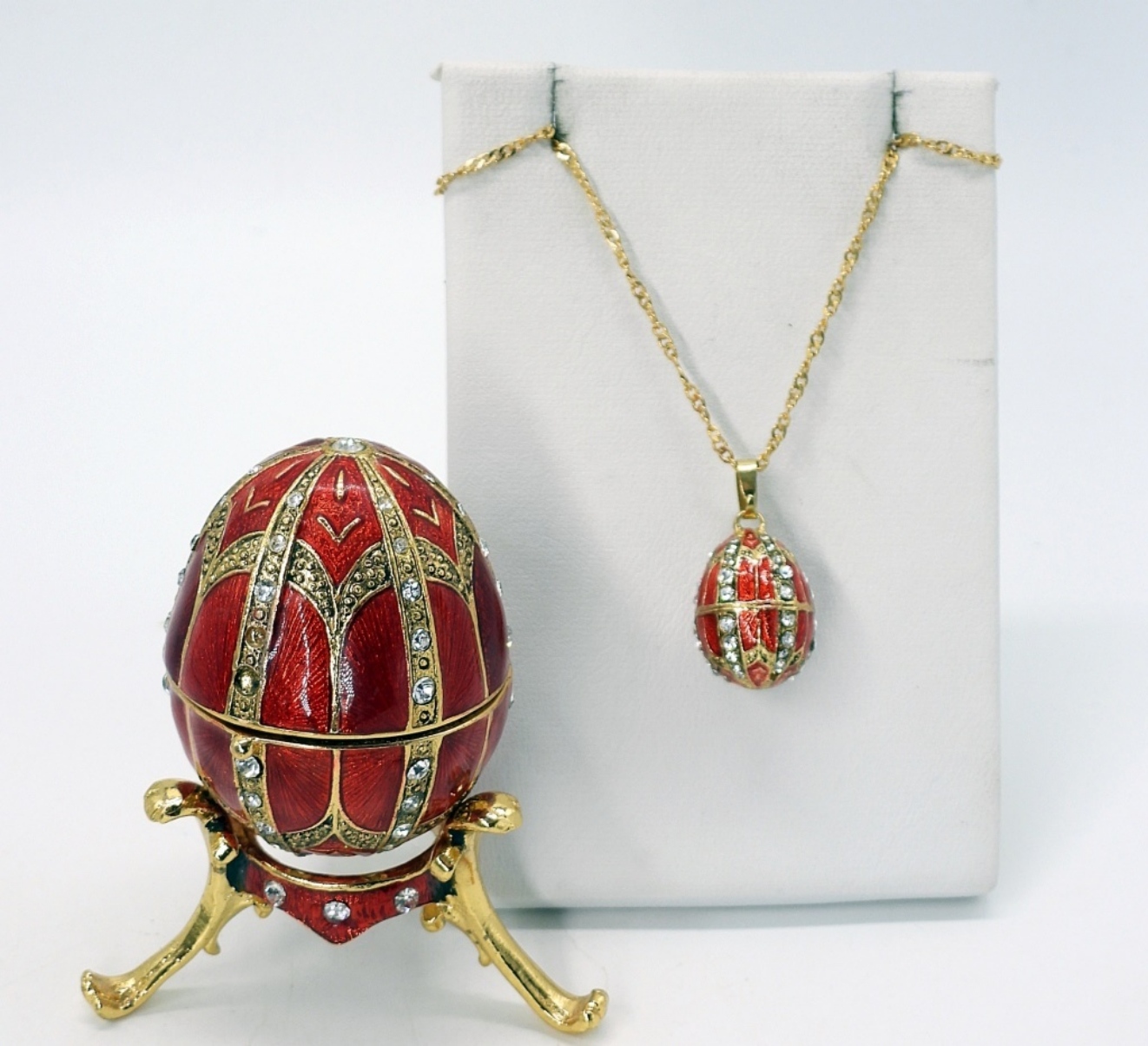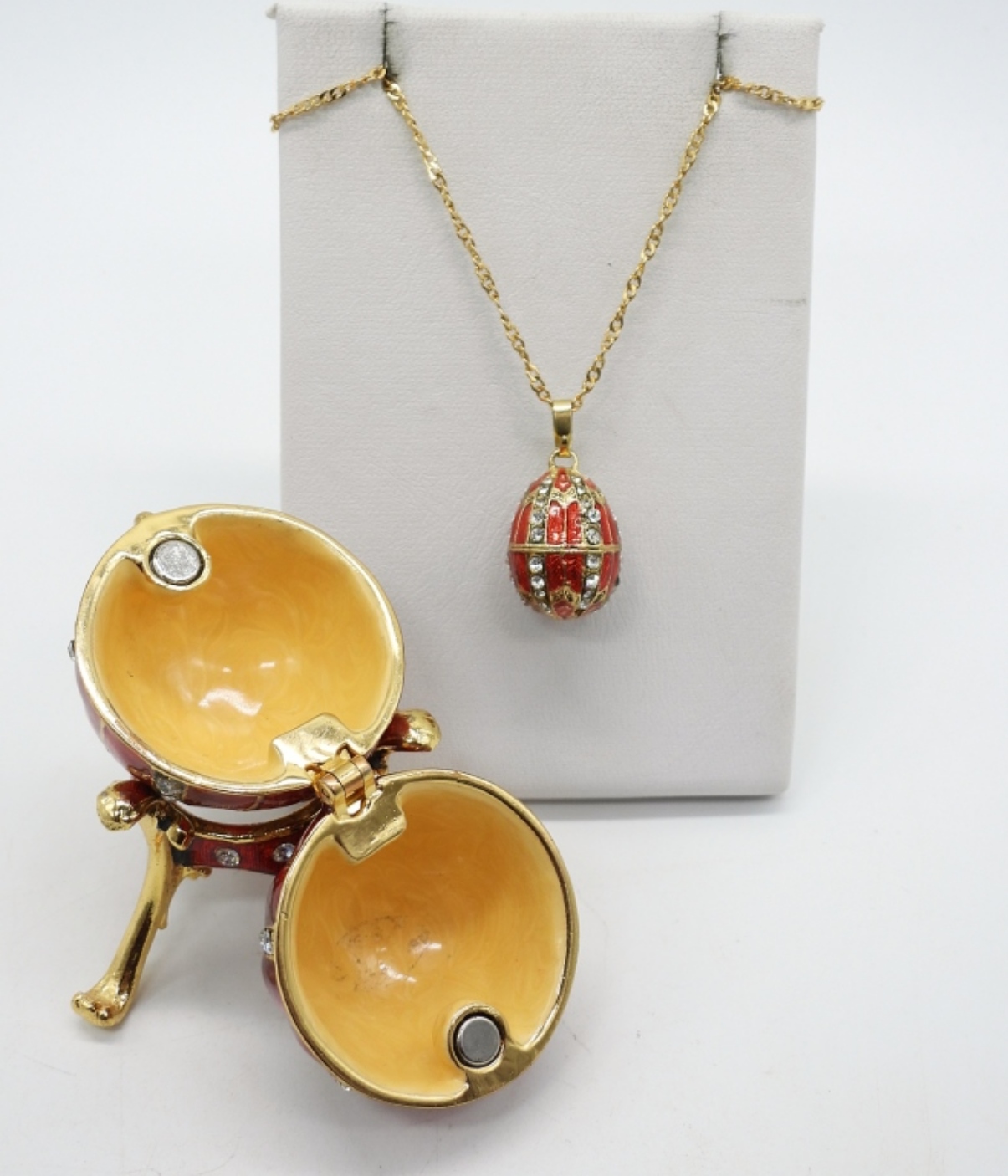 CUTE RED AND GOLD TONED ENAMEL EGG TRINKET BOX WITH A STAND AND A MATCHING GOLD TONE NECKLACE, 18″.