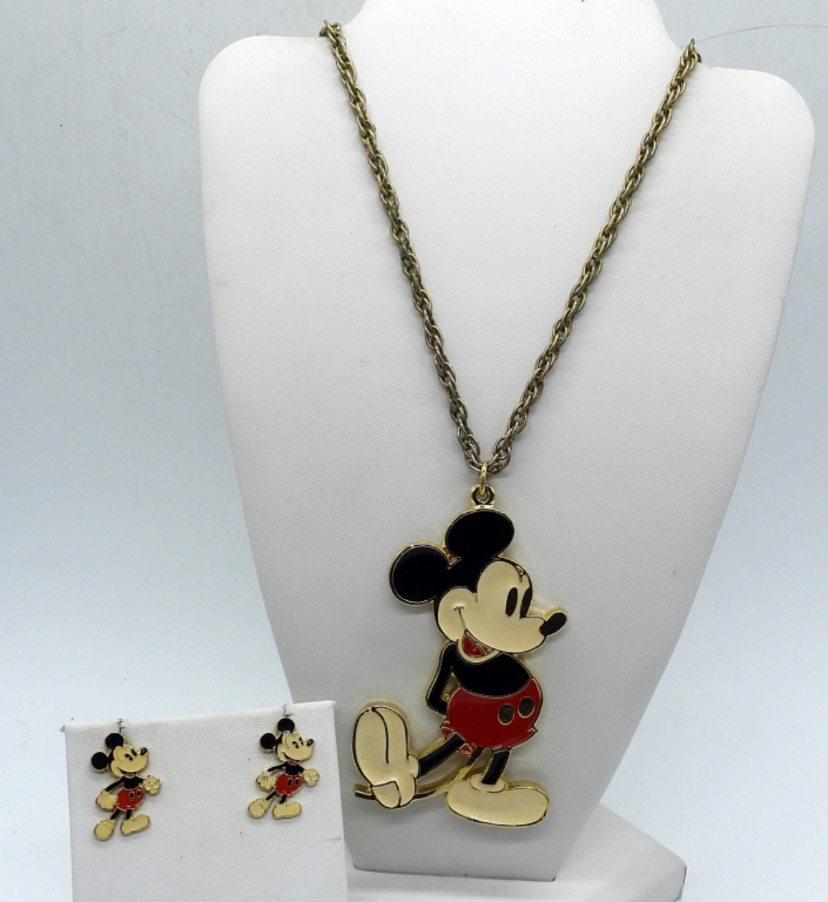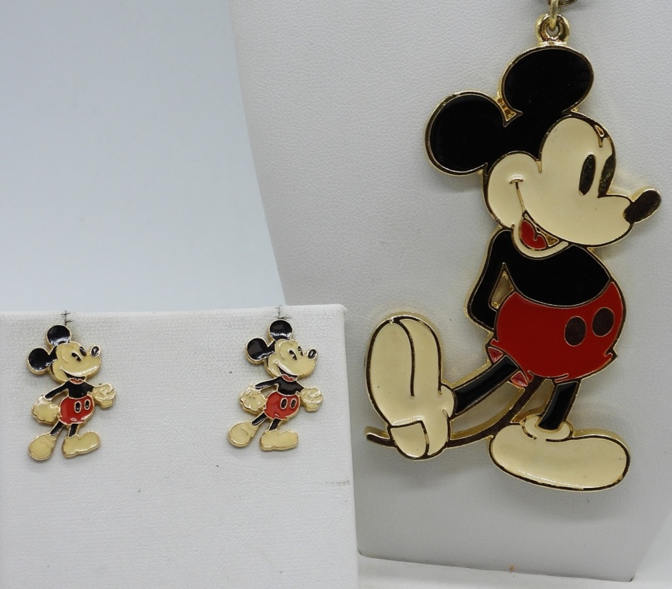 VERY LARGE, VINTAGE MICKEY MOUSE NECKLACE. PENDANT IS 3.5″. CHAIN IS 18″. PIERCED EARRINGS.