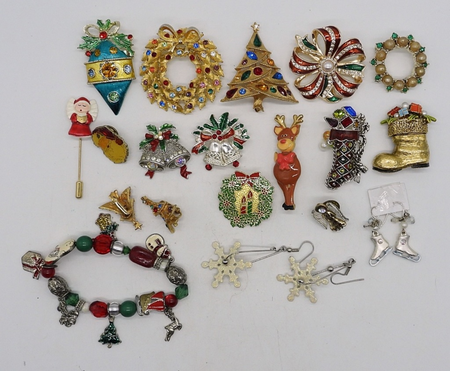 14 PINS. 3 PAIR EARRINGS PIERCED & CLIP ON. STRETCHY BRACELET.