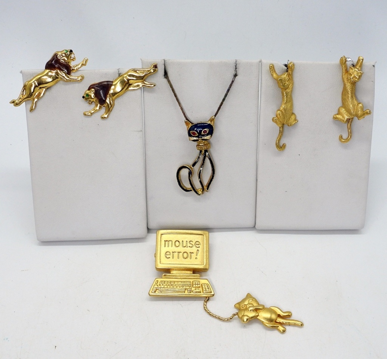 TWO PAIR OF PIERCED EARRINGS, ONE NECKLACE WITH 18″ CHAIN. COMPUTER PIN WITH HANGING CAT.