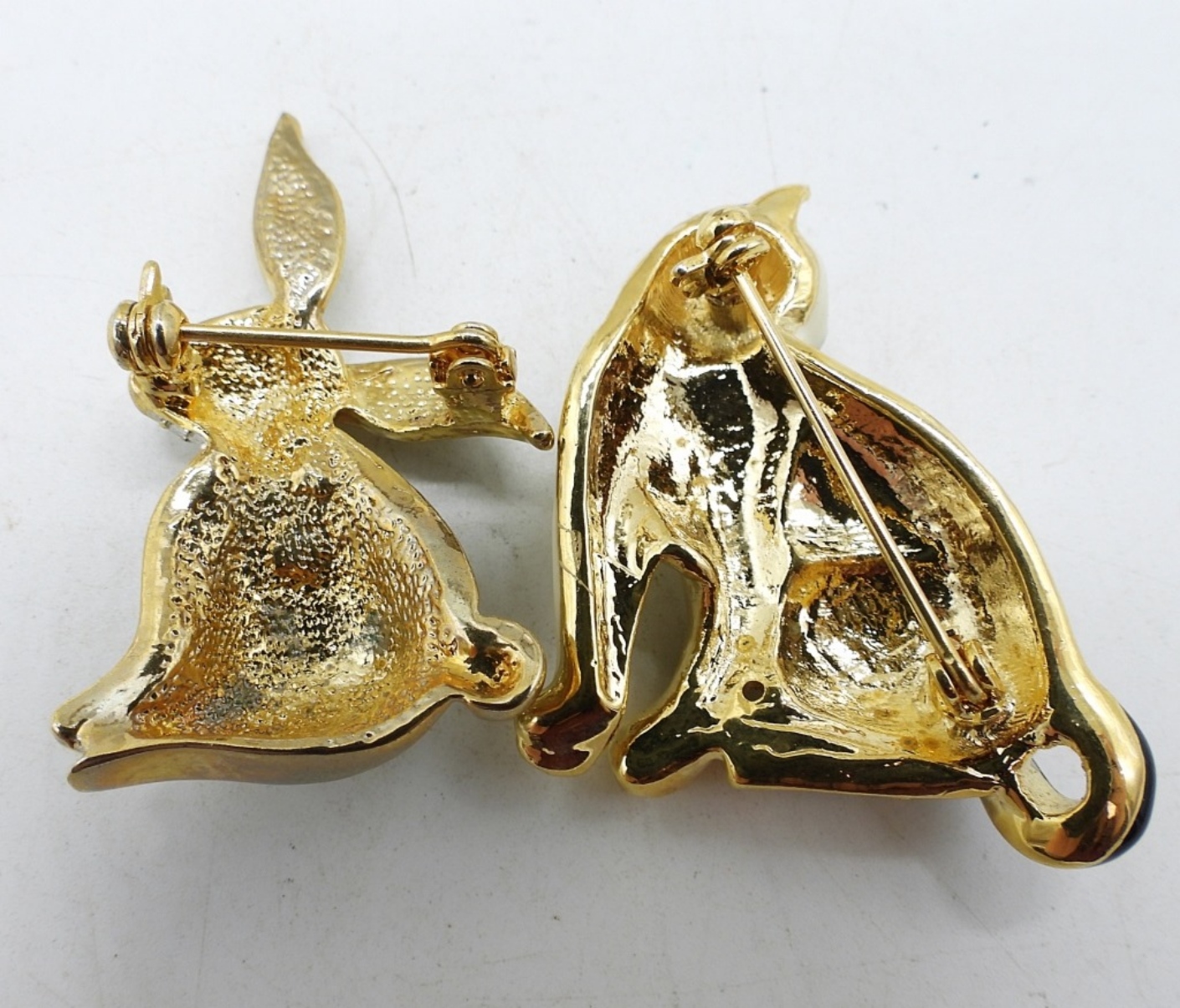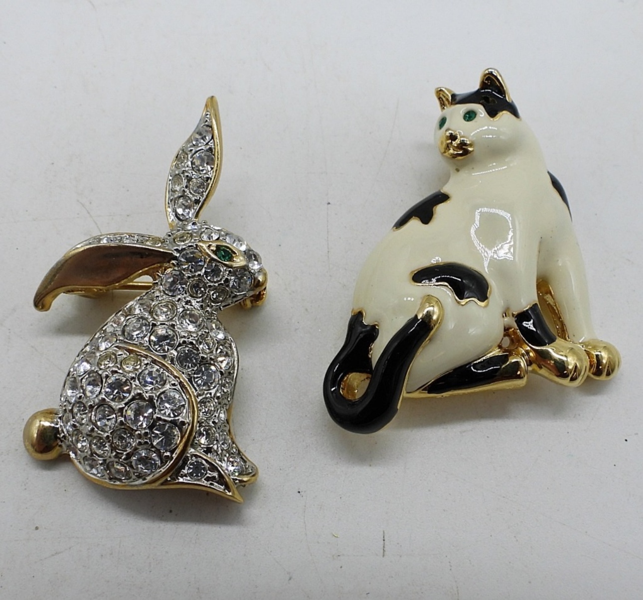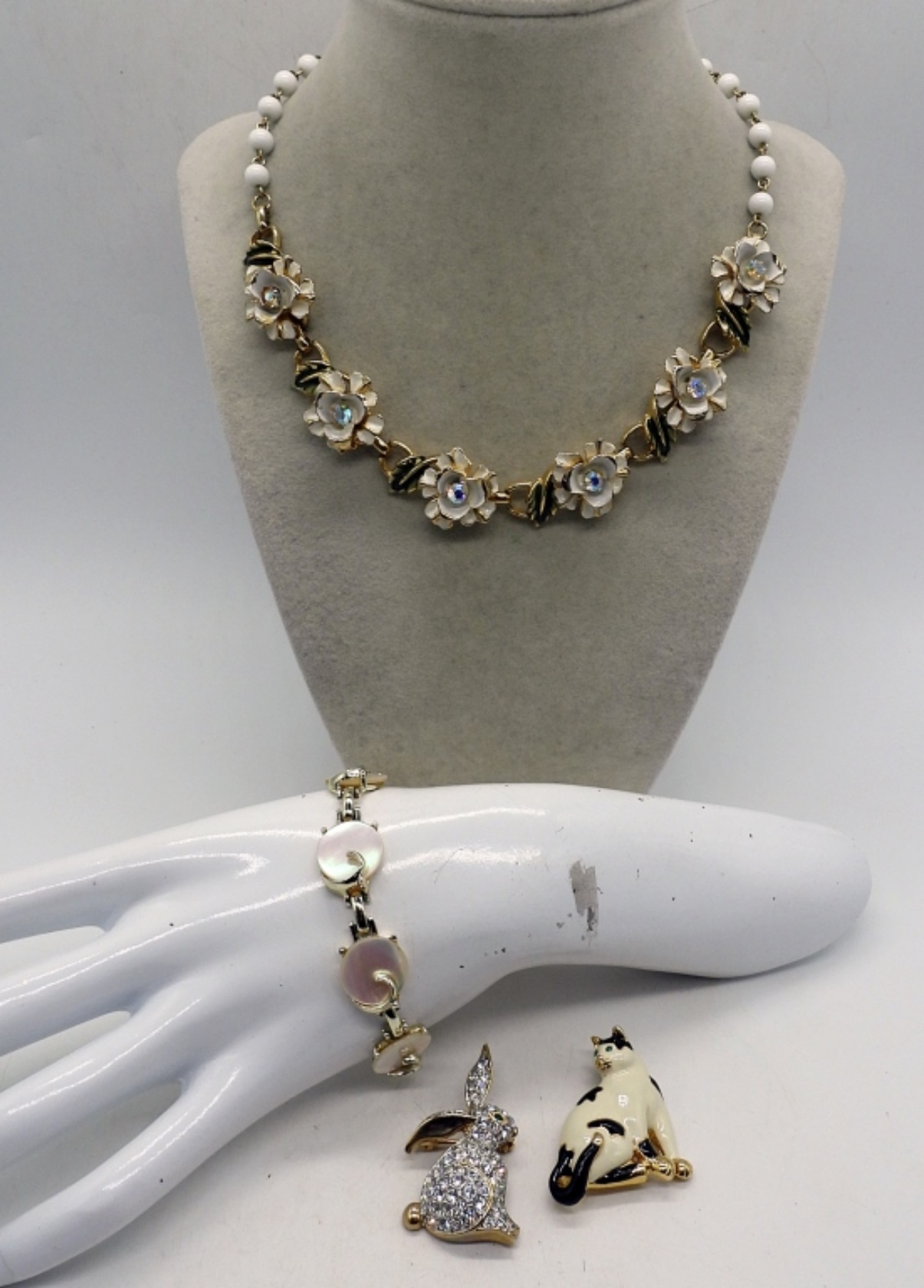 17″ NECKLACE, 8″ BRACELET. BUNNY & CAT BROOCHES