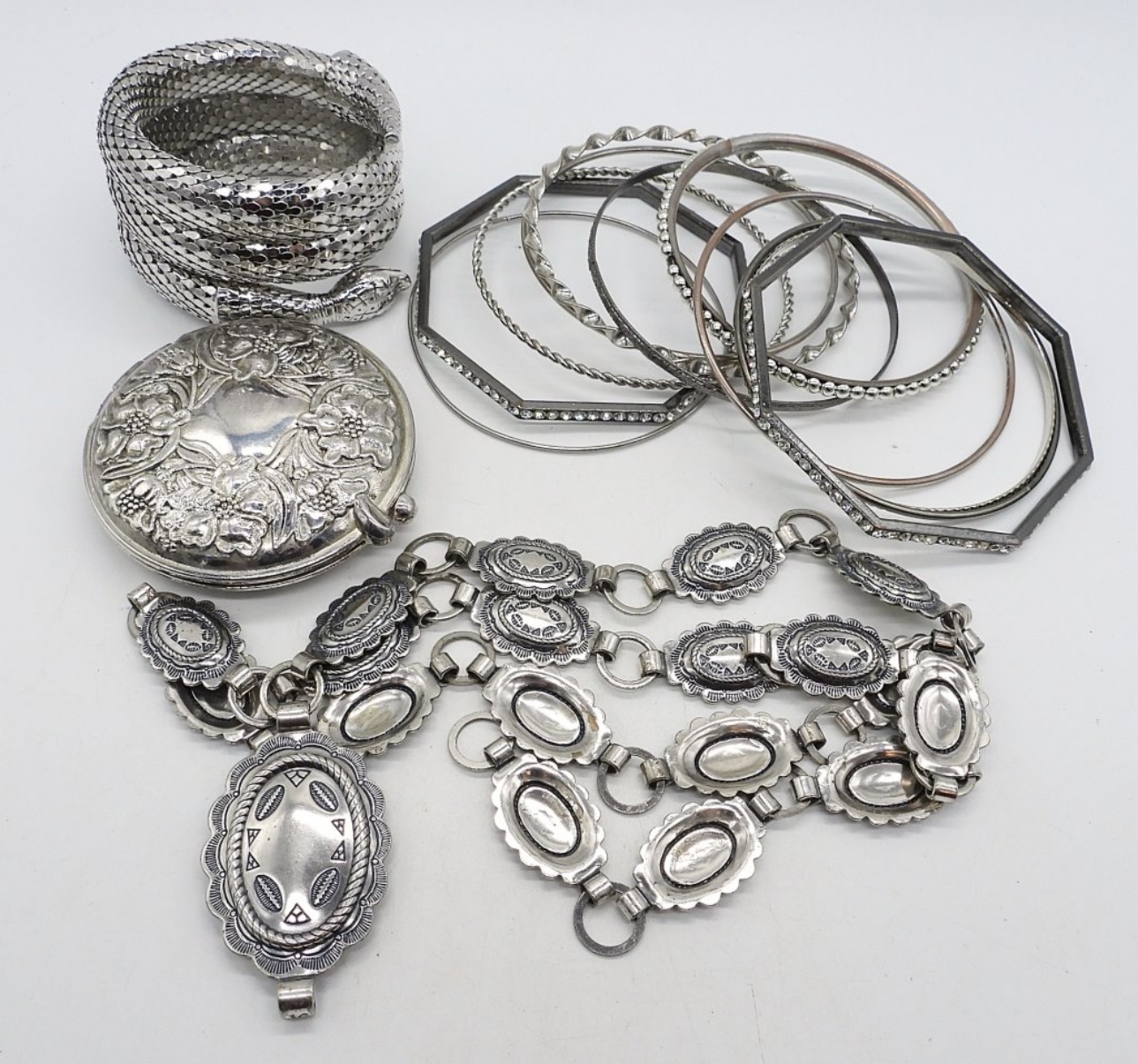 33″ METAL SOUTHWEST BELT. 12 BANGLE BRACELETS. ONE “1928 BRAND” MIRROR COMPACT.