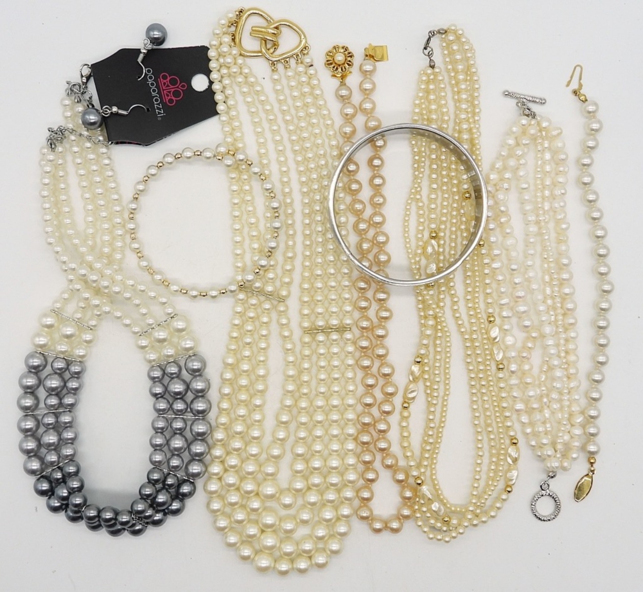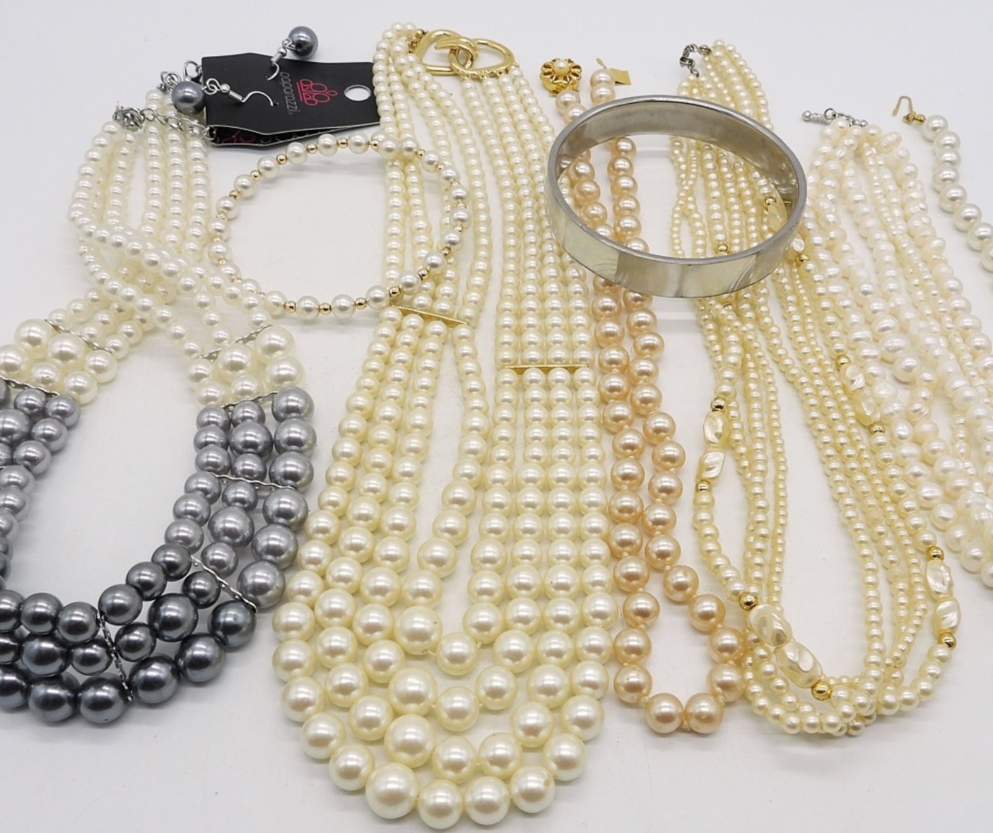 4 NECKLACES, 18″. ONE PAIR PIERCED EARRINGS. 4 BRACELETS.