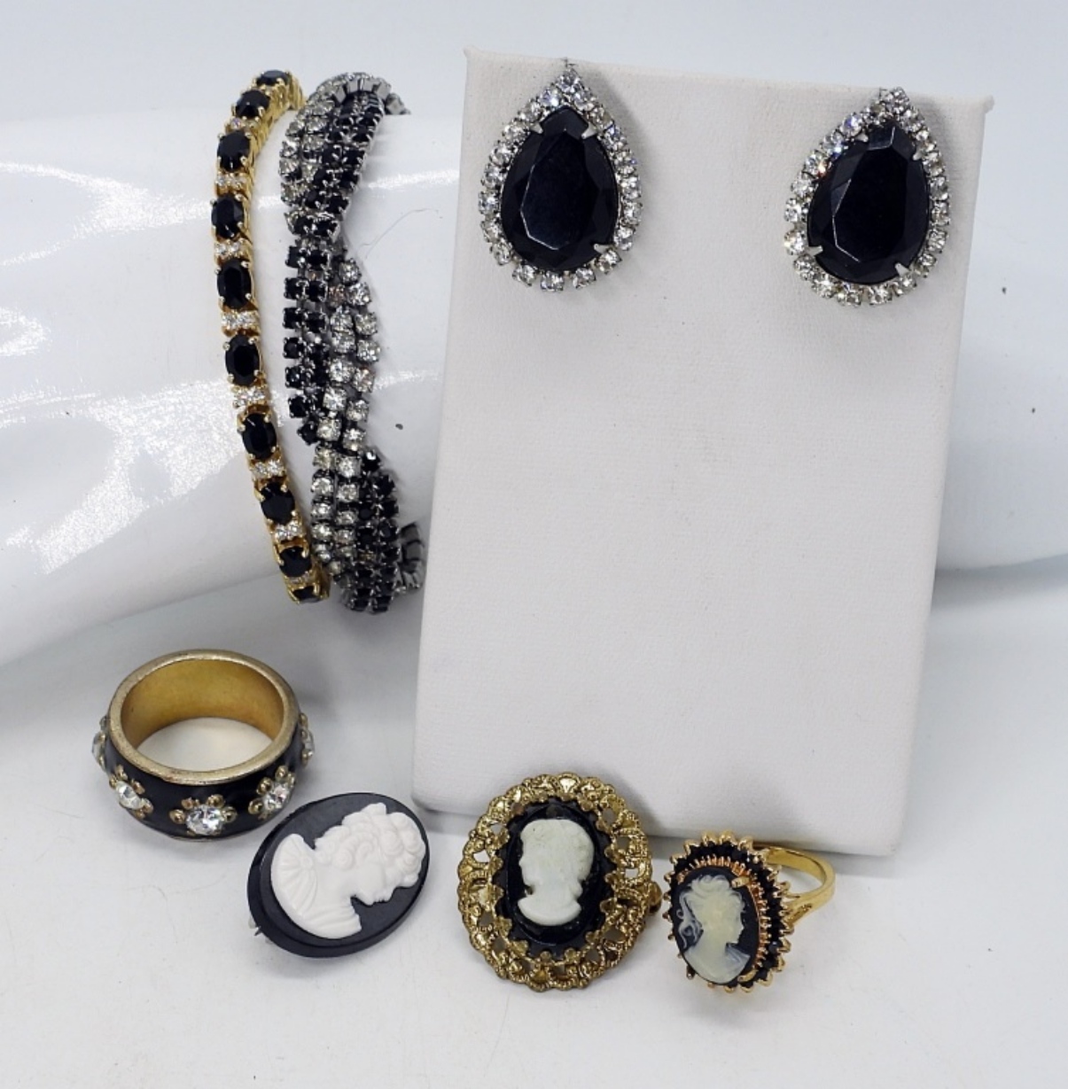 TWO RINGS, 5 & 9. 2 PINS. ONE PAIR PIERCED EARRINGS ( NO BACKS). TWO BRACELETS, 7″.