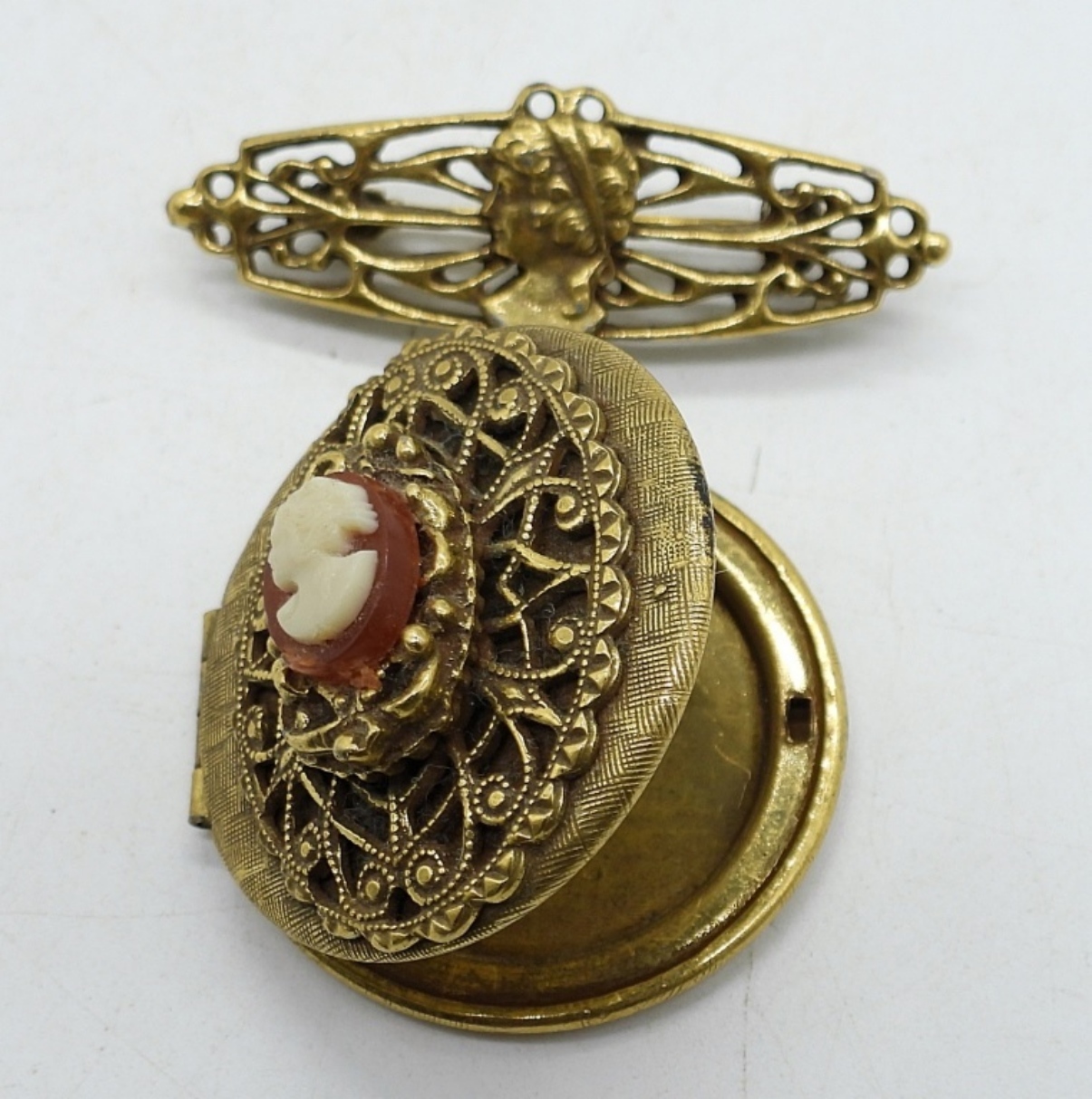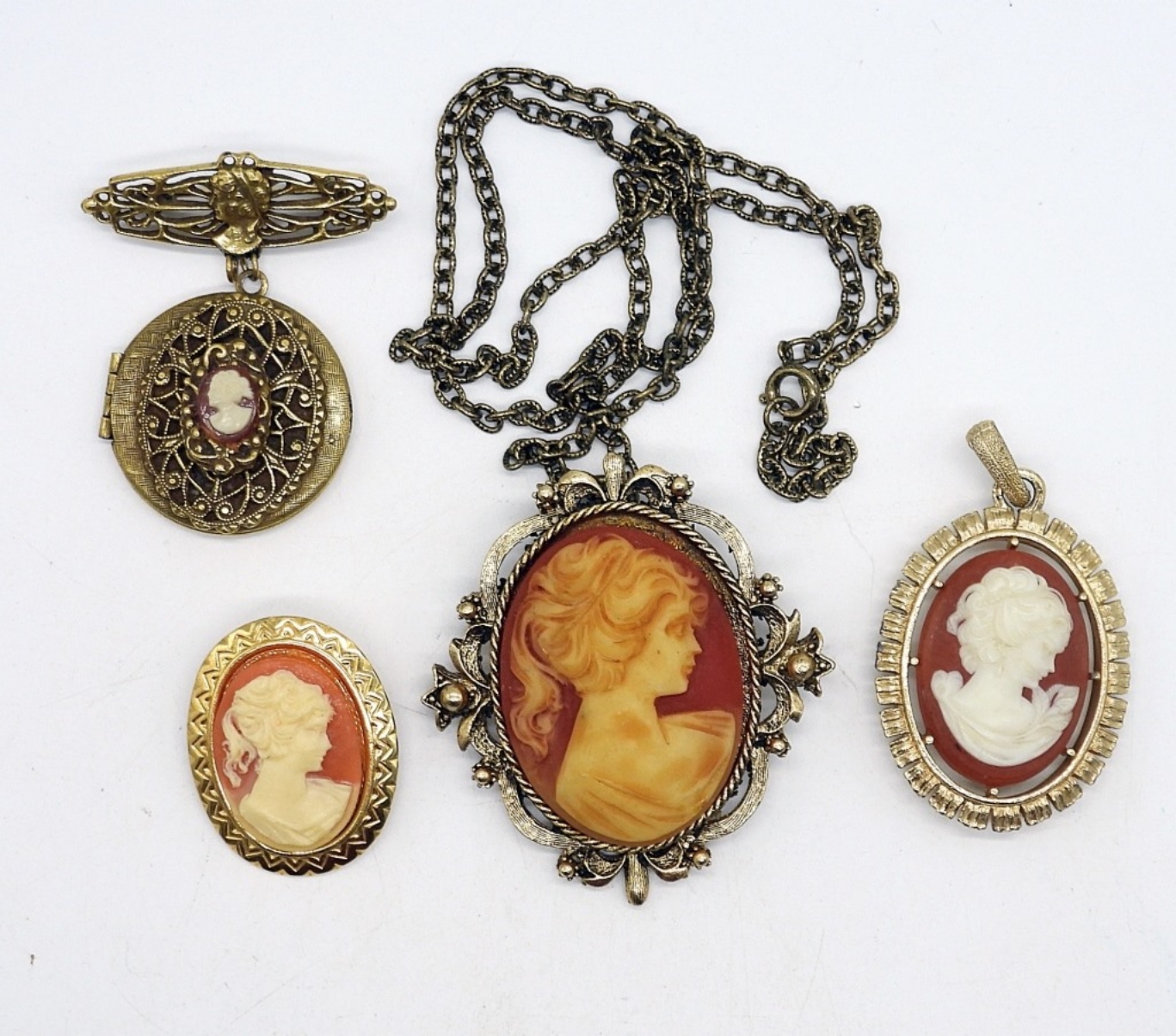 COSTUME CAMEOS. NECKLACE 24″. PENDANT & TWO PINS ( ONE IS A LOCKET).