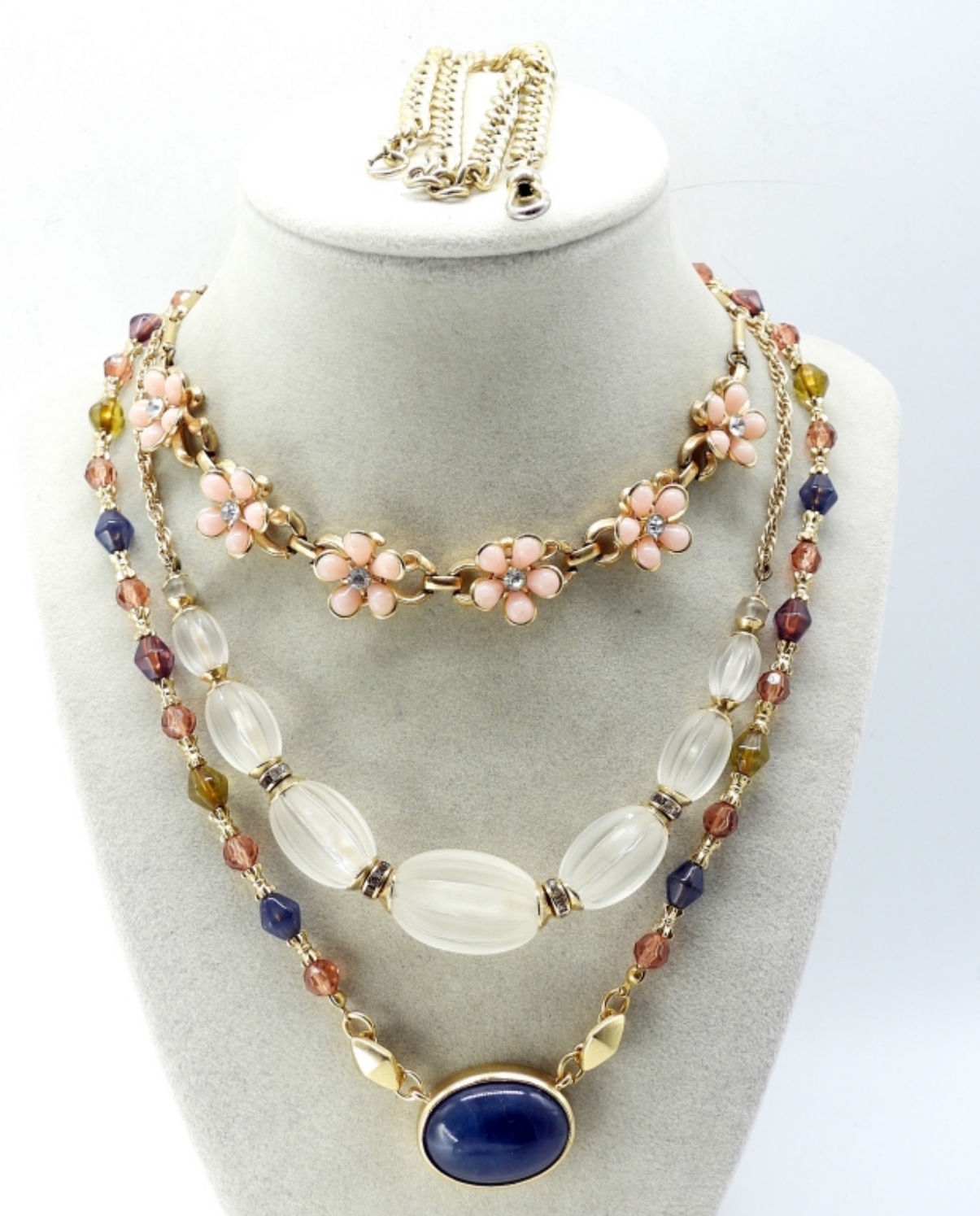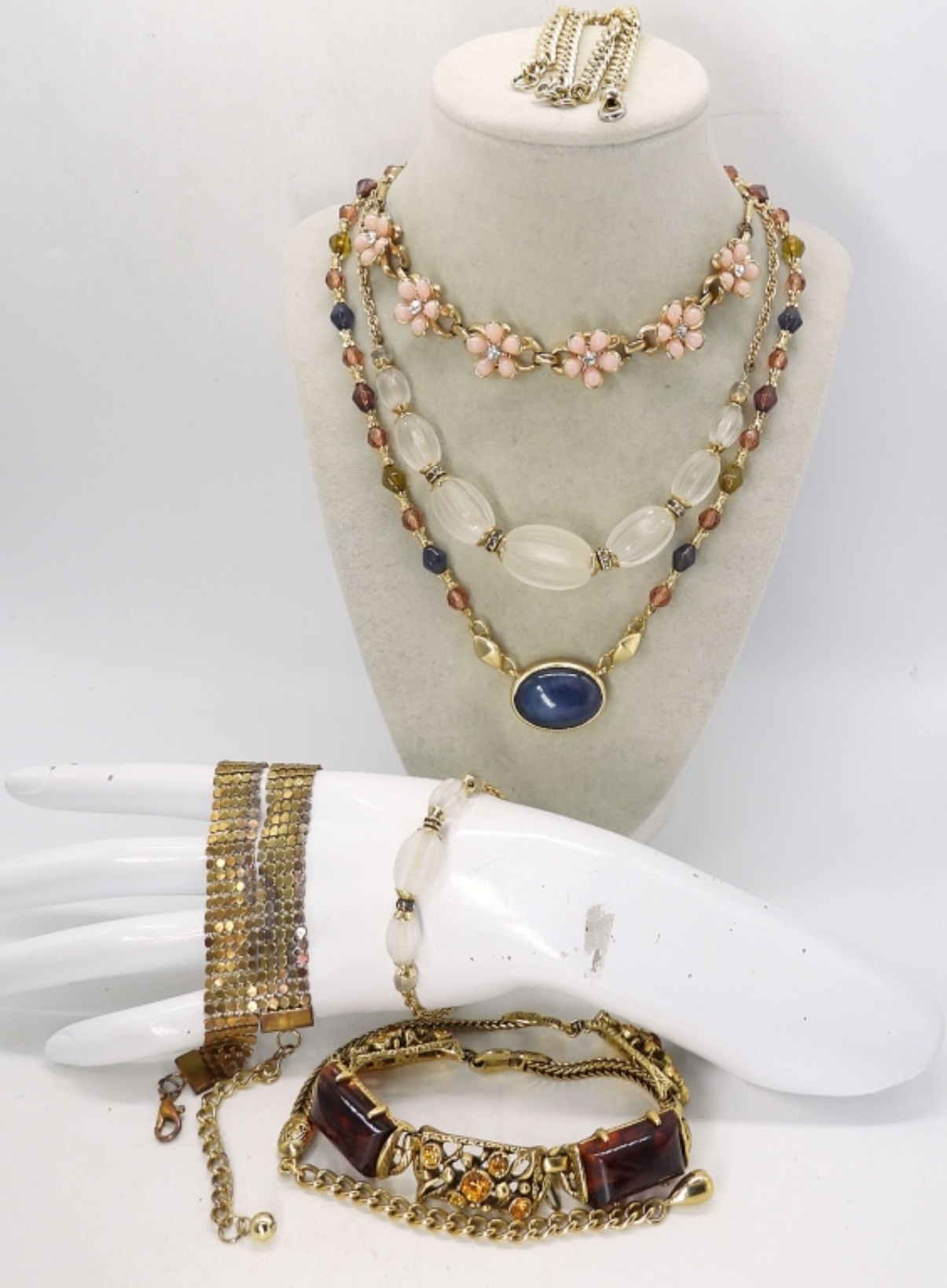 SIX VINTAGE FASHION NECKLACES, 12″-20″. ONE MATCHING BRACELET, 8″.
