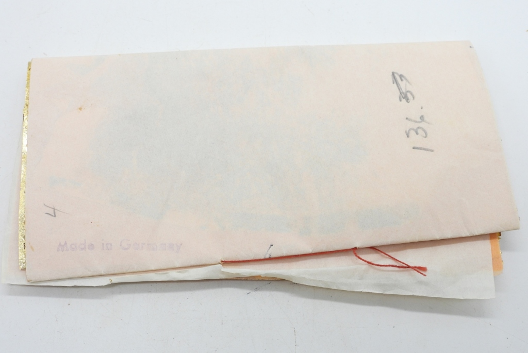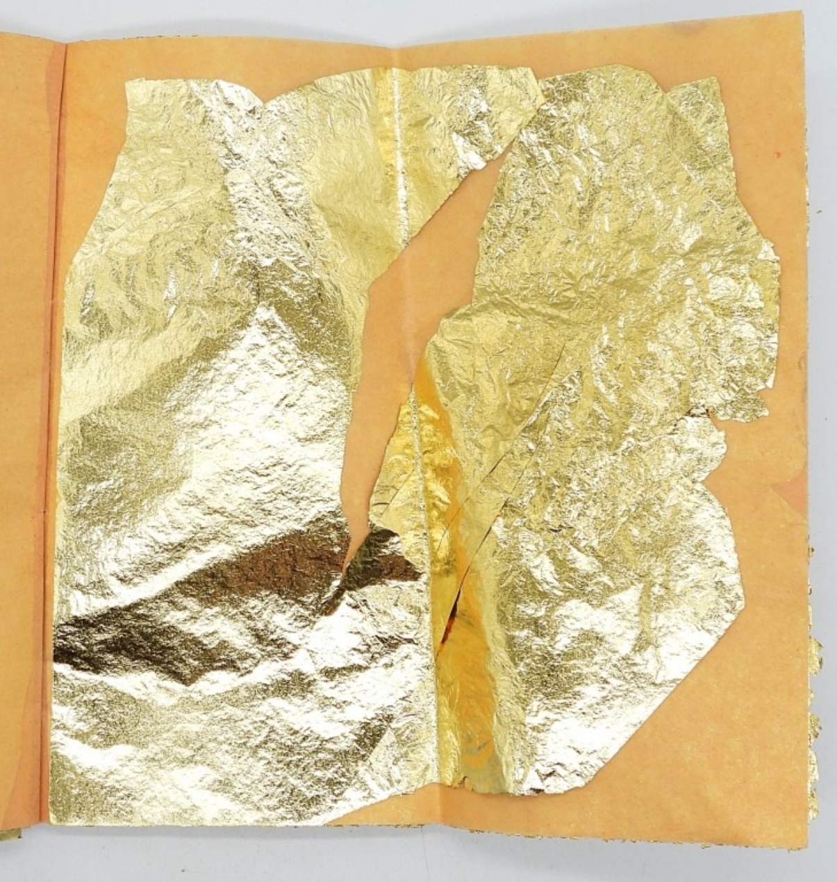 APPROXIMATELY 15 SHEETS OF GOLD LEAF (IT IS NOT GOLD, ONLY GOLD IN COLOR. HAS BEEN TESTED AND IS COPPER). NOT ALL OF THE SHEETS ARE FULL SHEETS. SOME OF THEM ARE TORN OR MISSING PIECES. SHEETS ARE APPROX 5.5″ BY 5.5″.