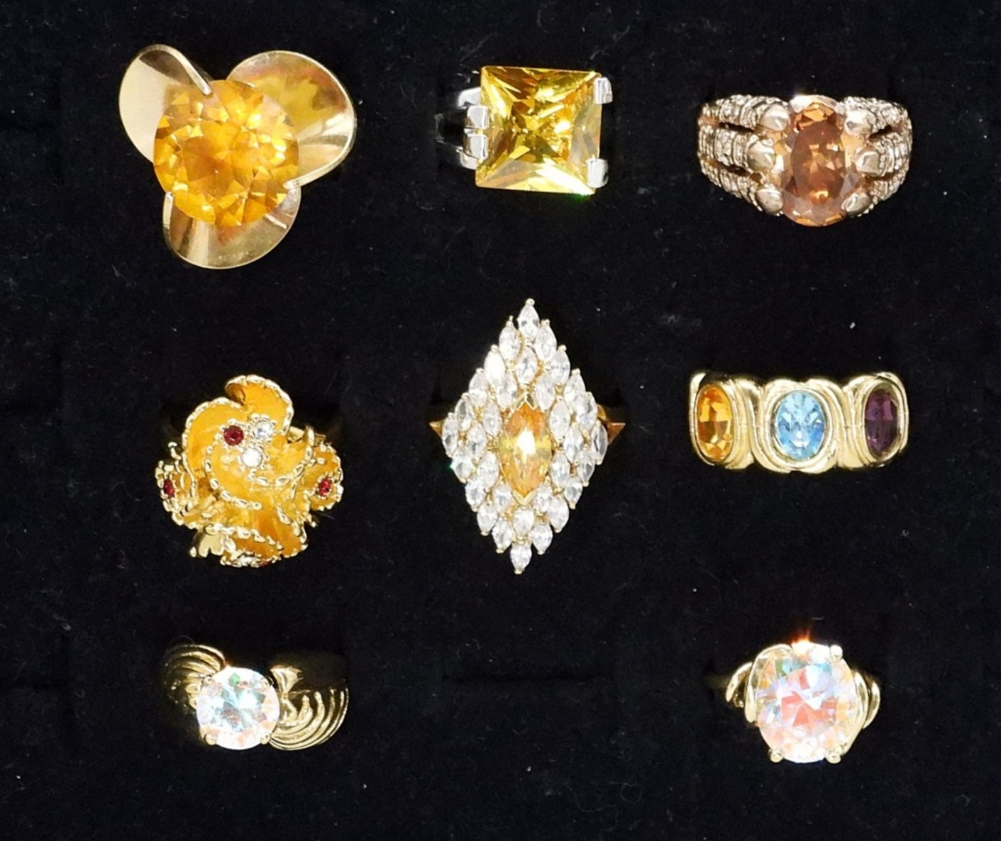 EIGHT SUPER SPARKLY, LARGE GEMSTONE FASHION RINGS. SIZES 6-9