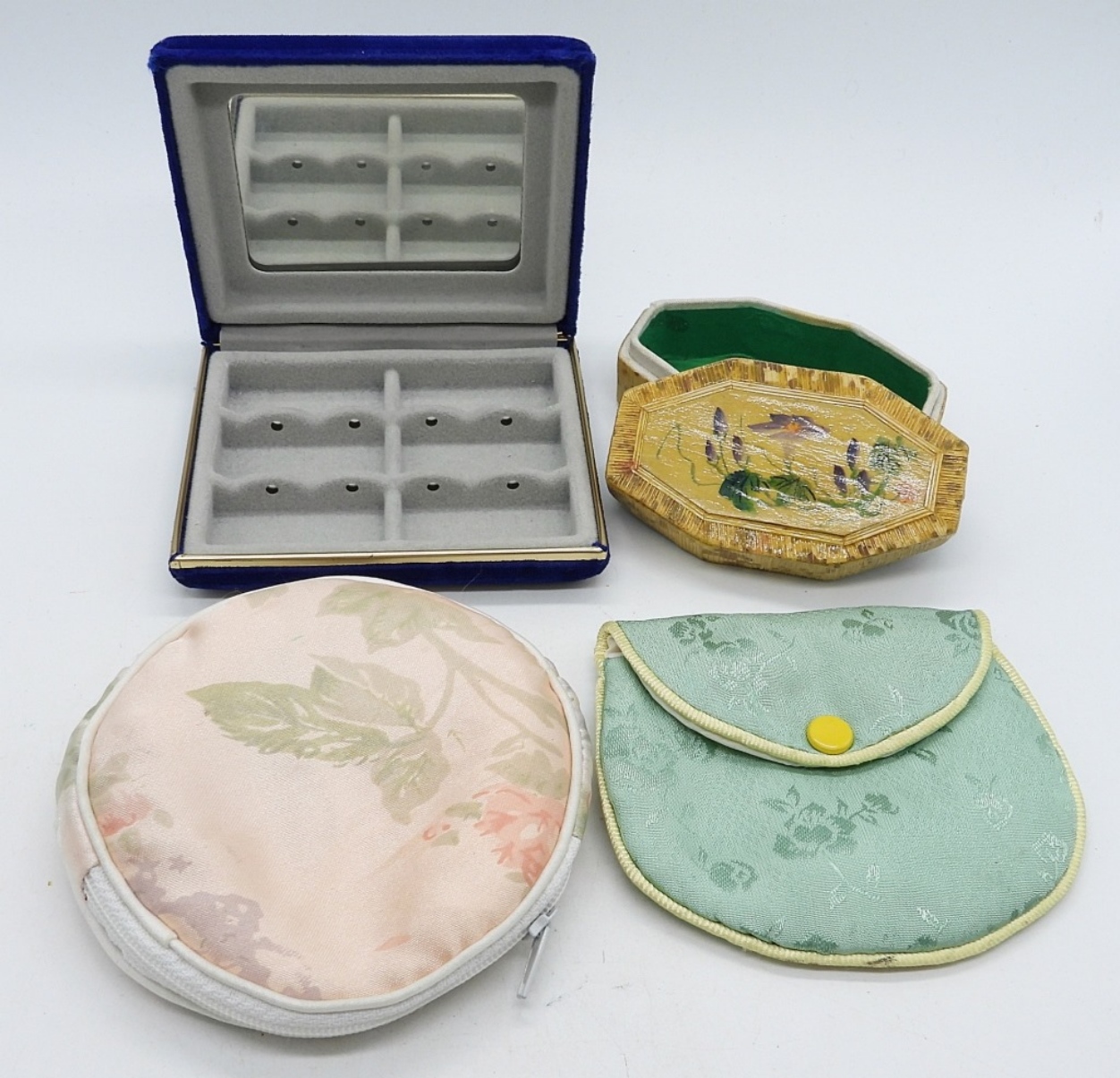 TWO LITTLE JEWELRY BAGS, ONE TRINKET BOX AND A HINGED JEWELRY BOX (4″x 3″)