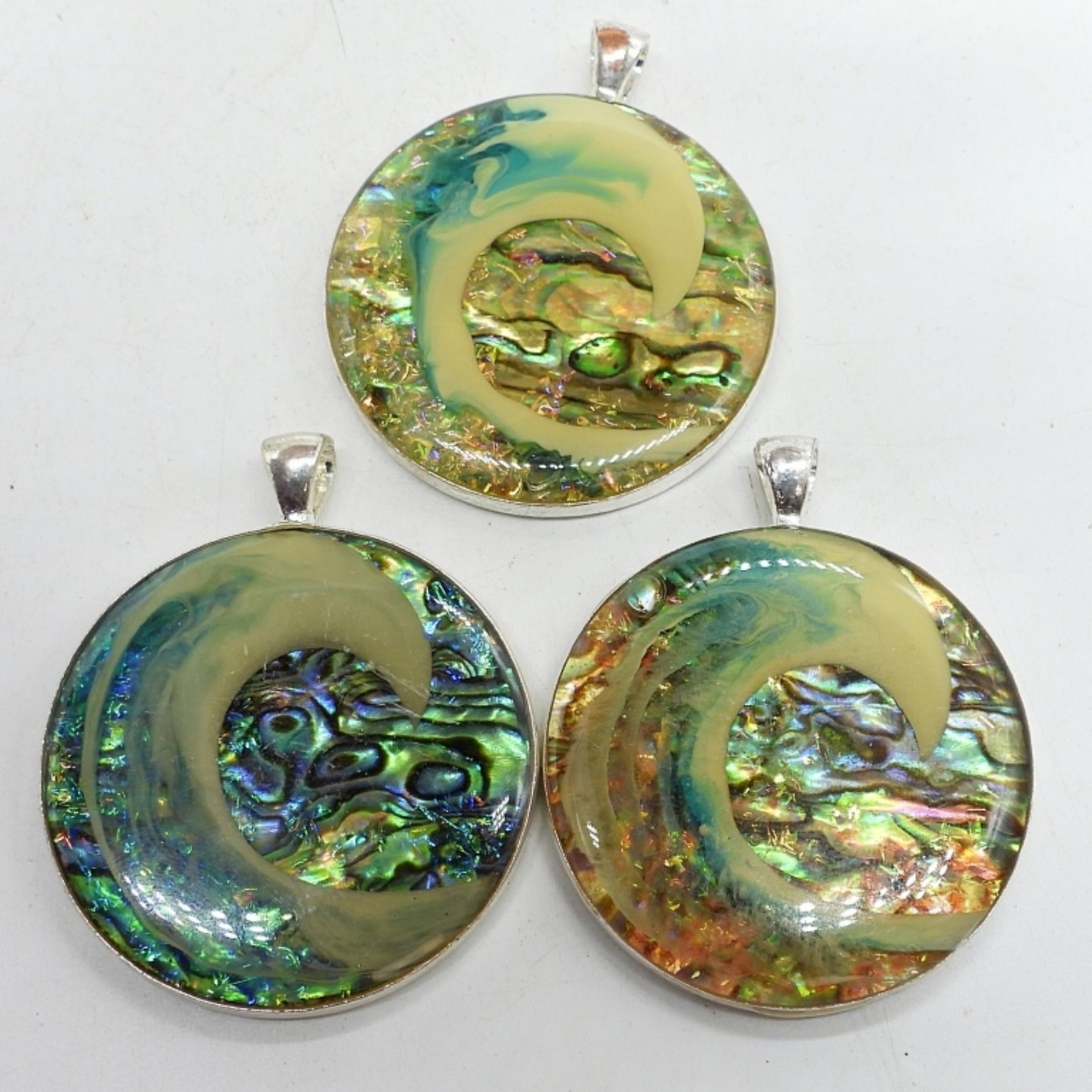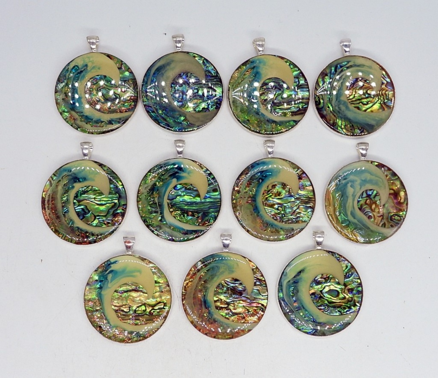 ELEVEN PENDANTS, ABALONE BACKGROUNDS, GLASS WAVE DESIGN FRONTS. 2″.