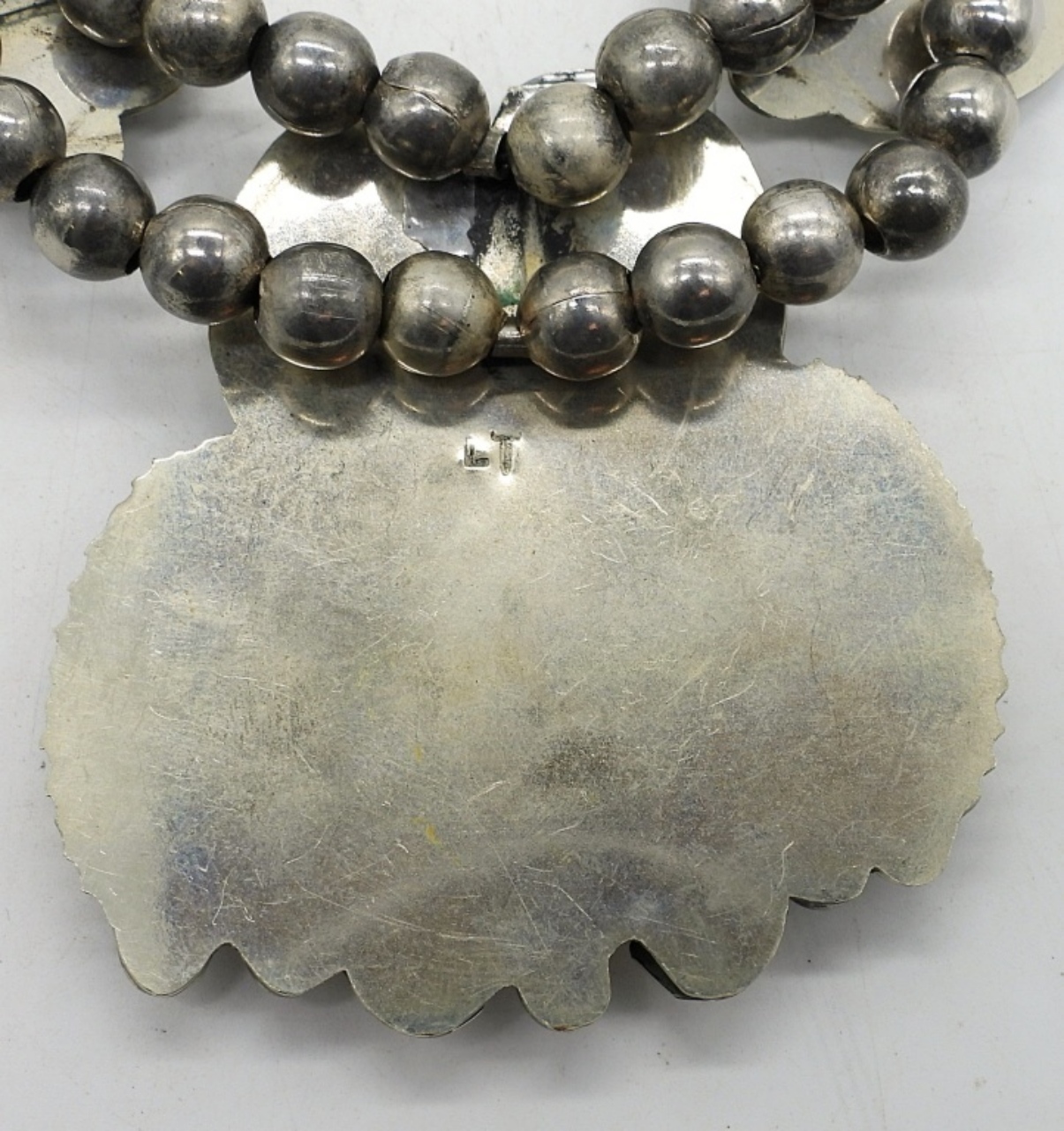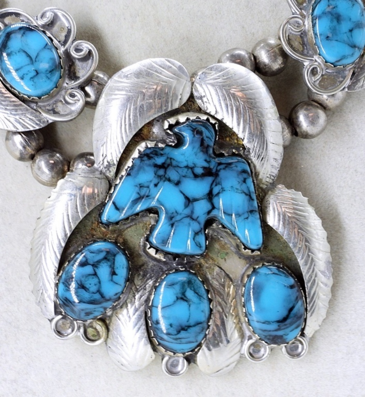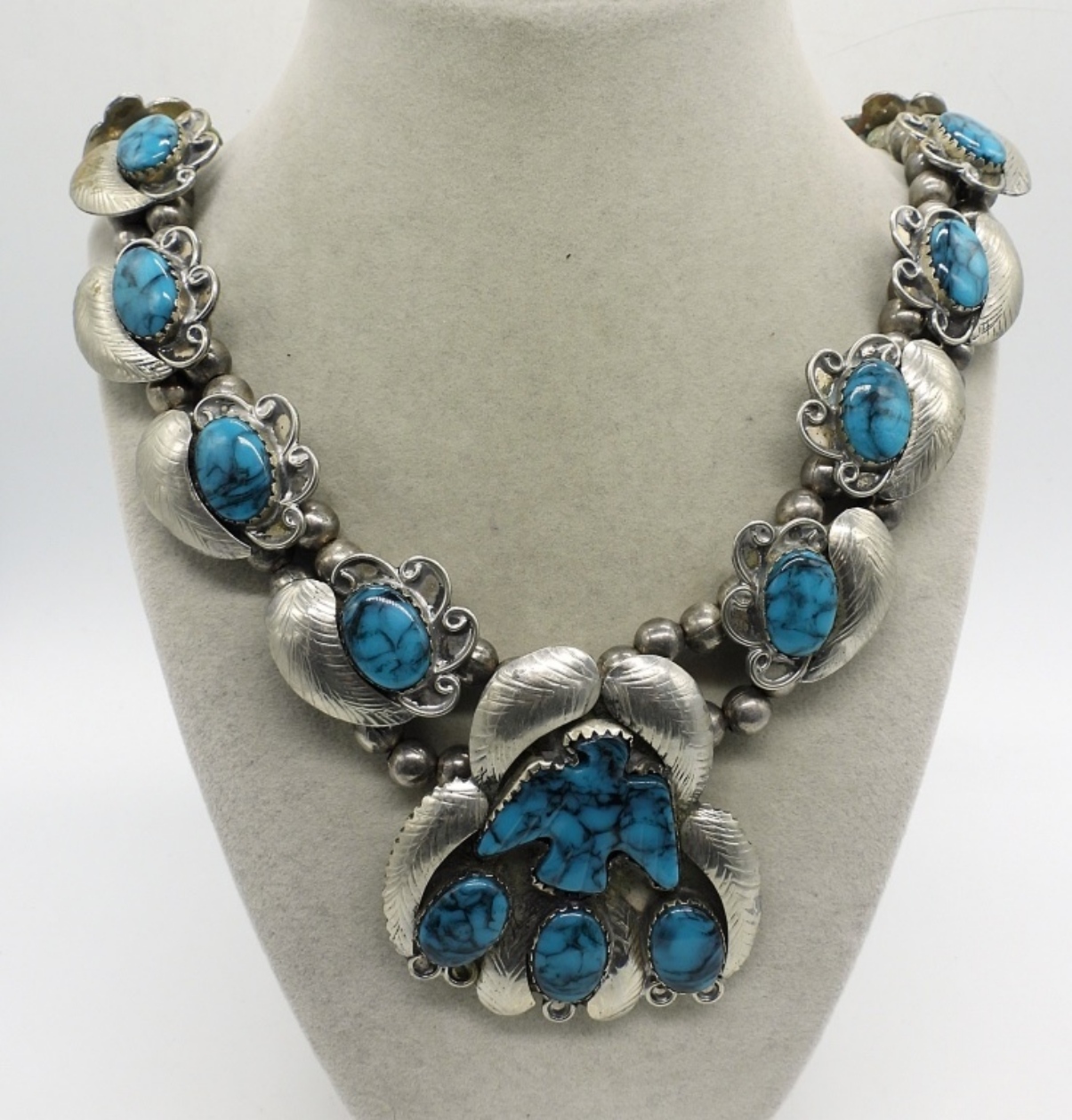 24″ SILVER TONE, FAUX TURQUOISE SQUASH BLOSSOM NECKLACE. THIS IS NOT STERLING SILVER!