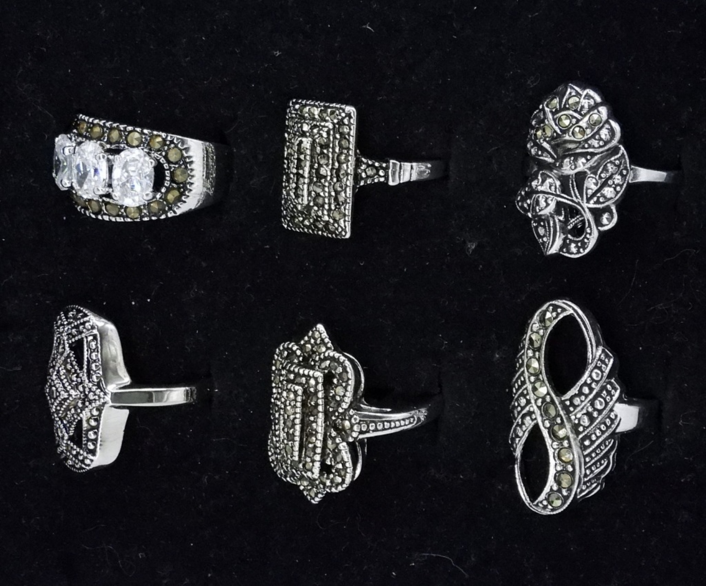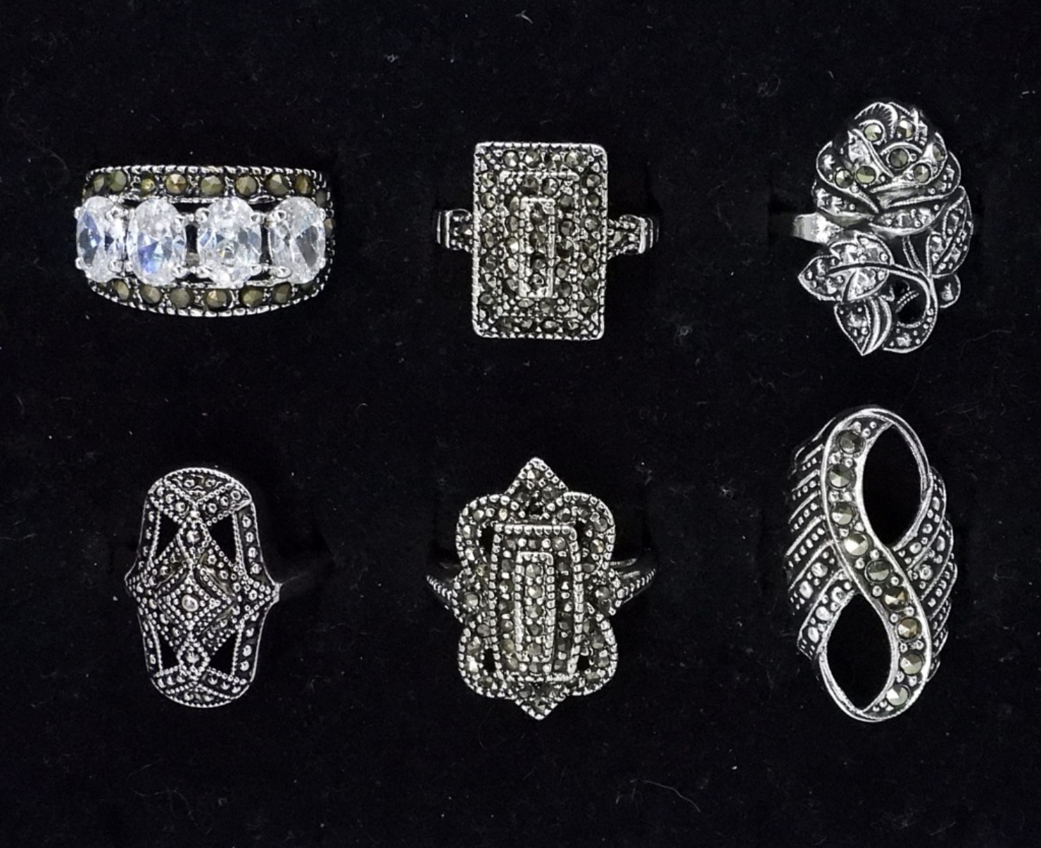 SIX MARCASITE FASHION RINGS. SIZES 5-8