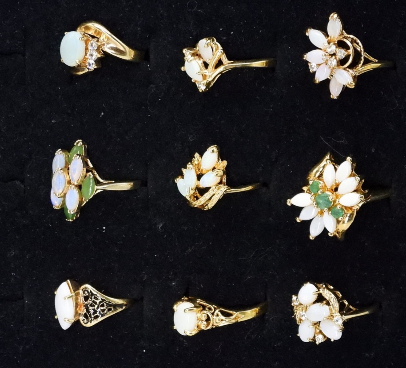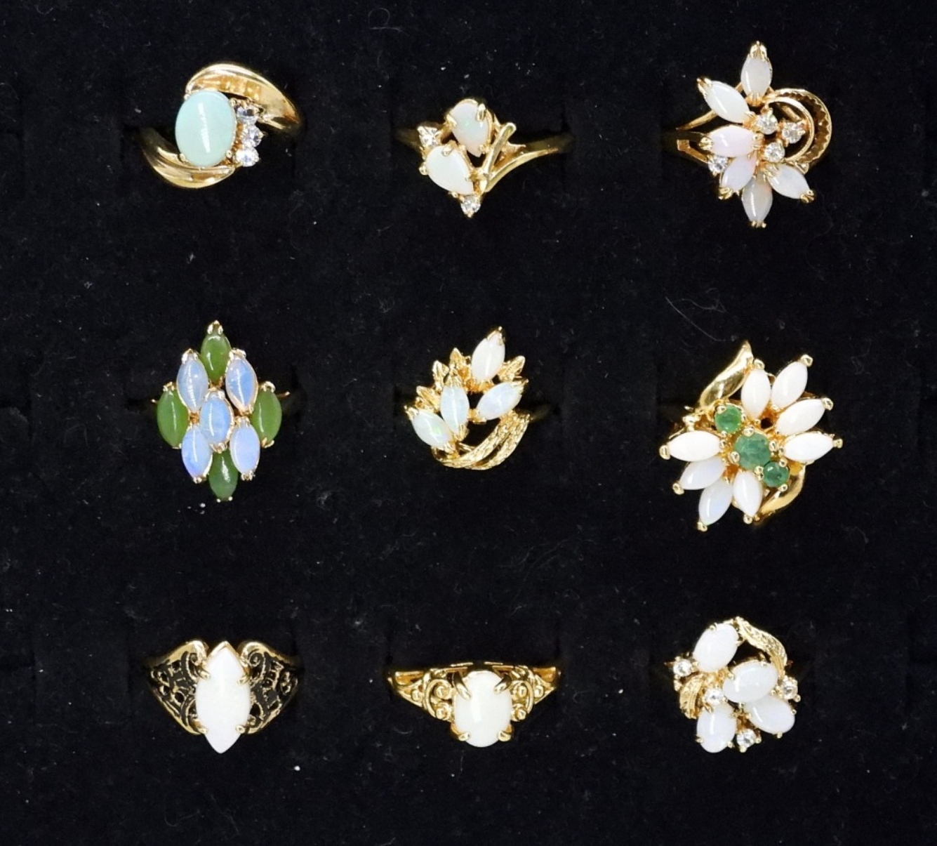 9 GOLD TONE OPAL GEMSTONE FASHION RINGS, SIZES 4-8