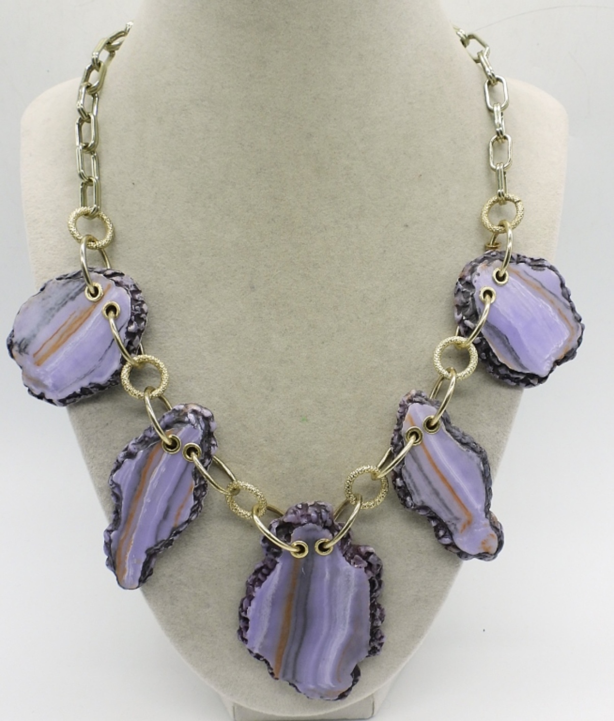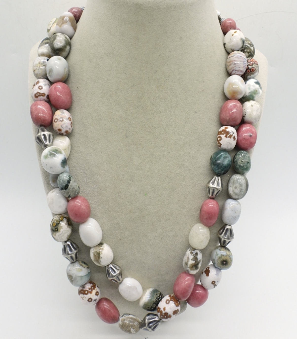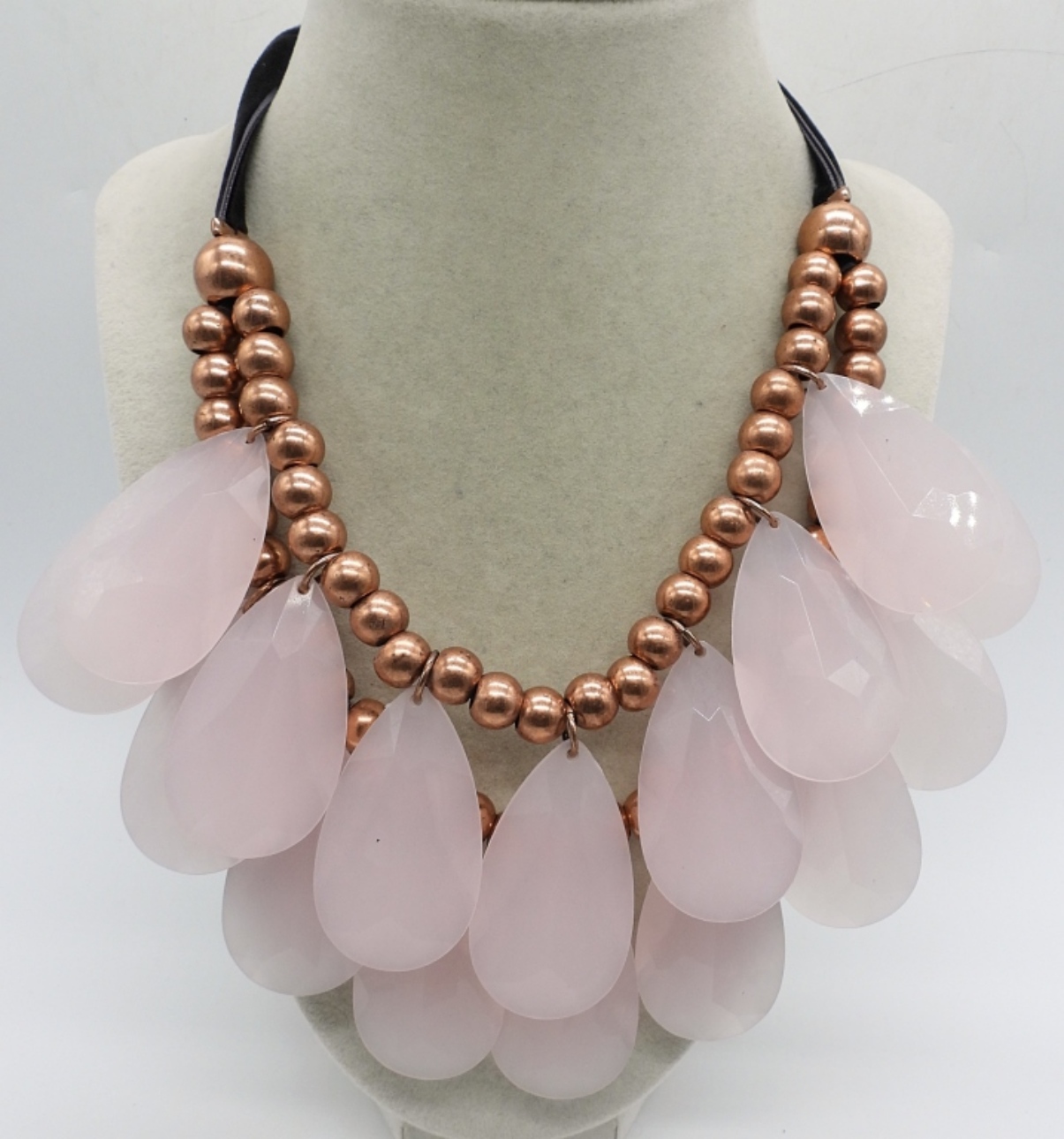 JOAN RIVERS PLASTIC “ROSE QUARTZ” NECKLACE, 20″. CAROLYN POLLACK NATURAL GEMSTONE NECKLACE, 22″. JOAN RIVERS PURPLE NECKLACE, 18″.