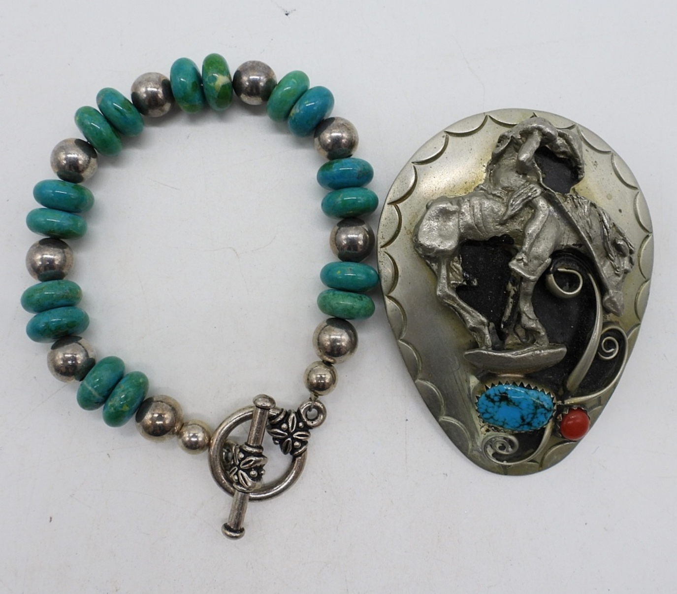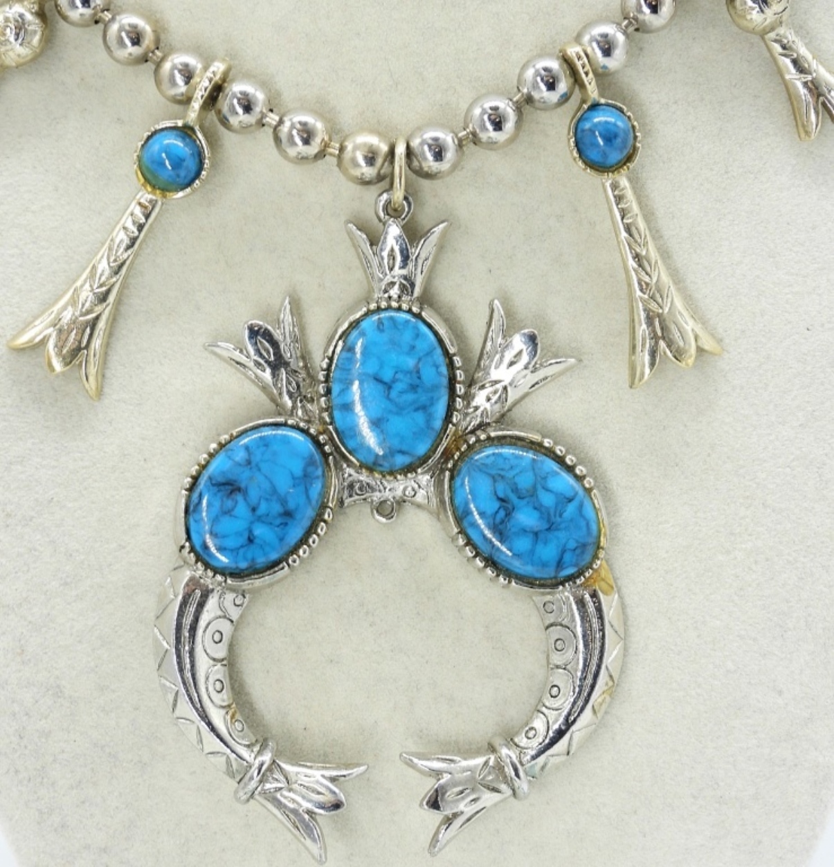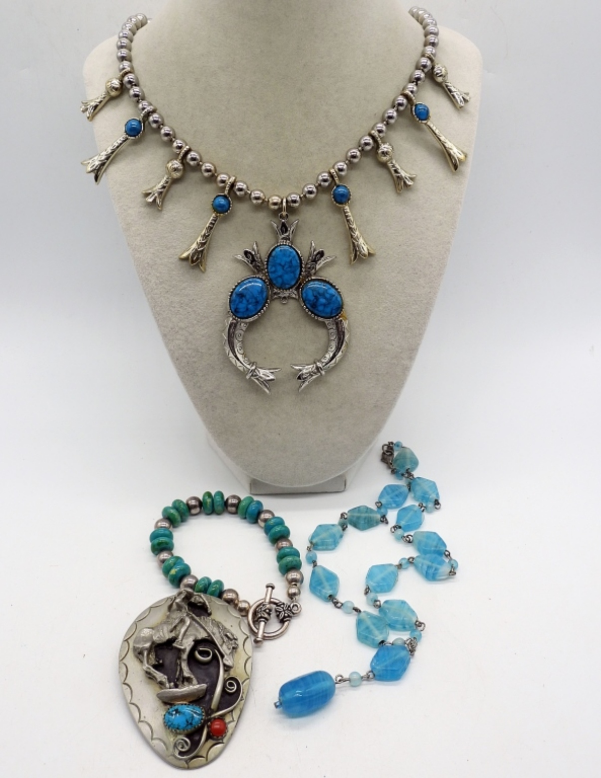 SOUTHWEST STYLE, COSTUME SQUASH BLOSSOM NECKLACE. NOT STERLING SILVER!! NOT GENUINE TURQUOISE! 24″. OTHER NECKLACE, 16″. BRACELET & BOA TIE COWBOY (NO BOA CORD).