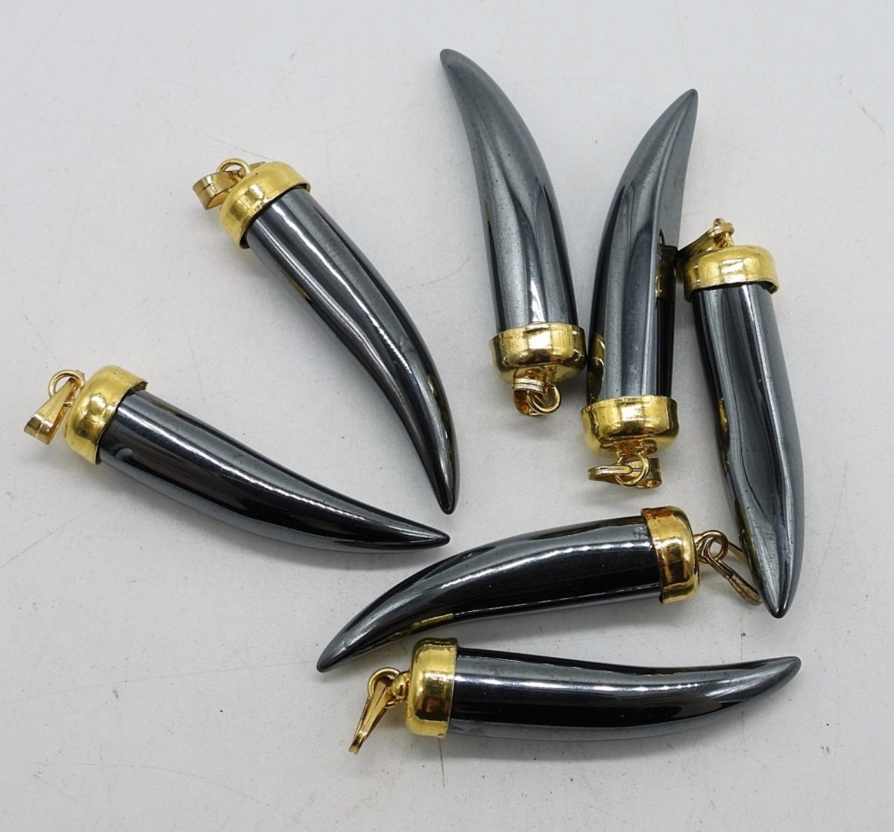 SEVEN HEMATITE GEMSTONE PENDANTS WITH GOLD TONE METAL. 1.25″